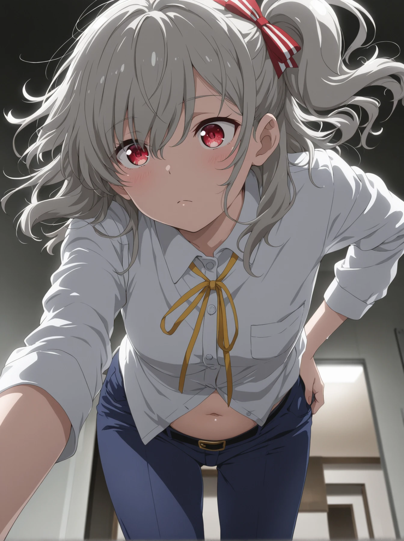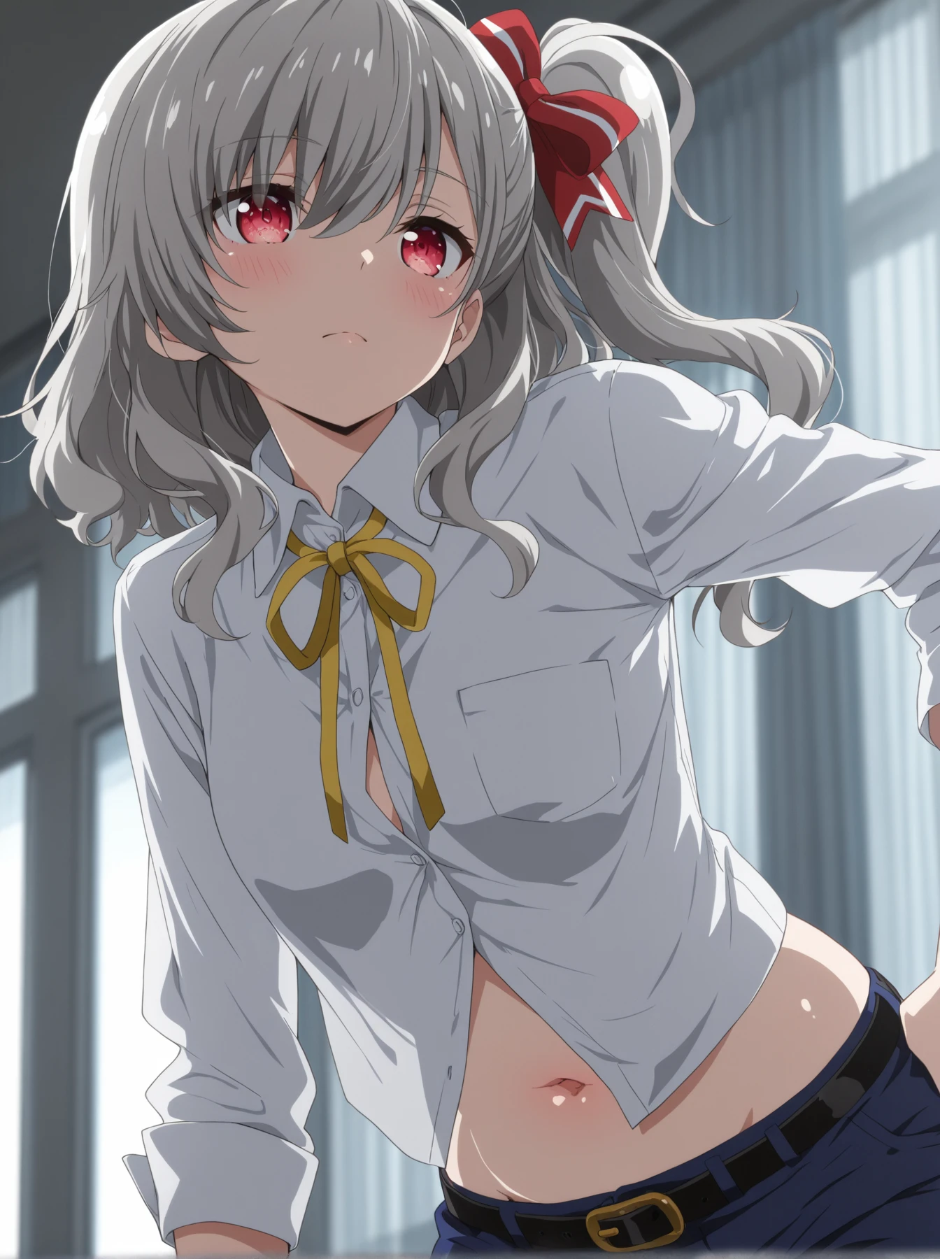 Casual: (AzuzuCasual, red eyes, gray hair, side ponytail, one side up, hairbow), (white collared shirt, neck ribbon, blue pants, belly button, belt),