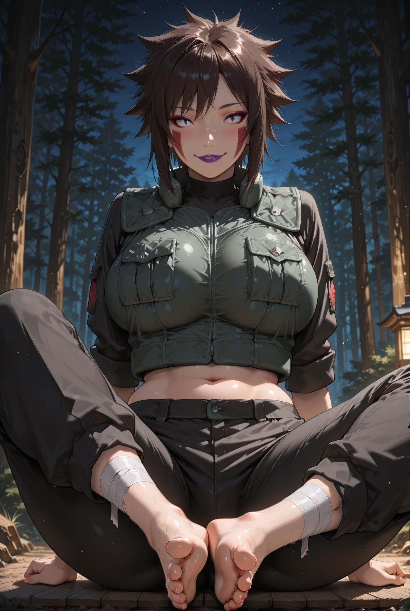 Tsume Inuzuka (facial mark,brown hair,spiked hair,short hair,makeup,purple lipstick,slit pupils,milf,mature female)