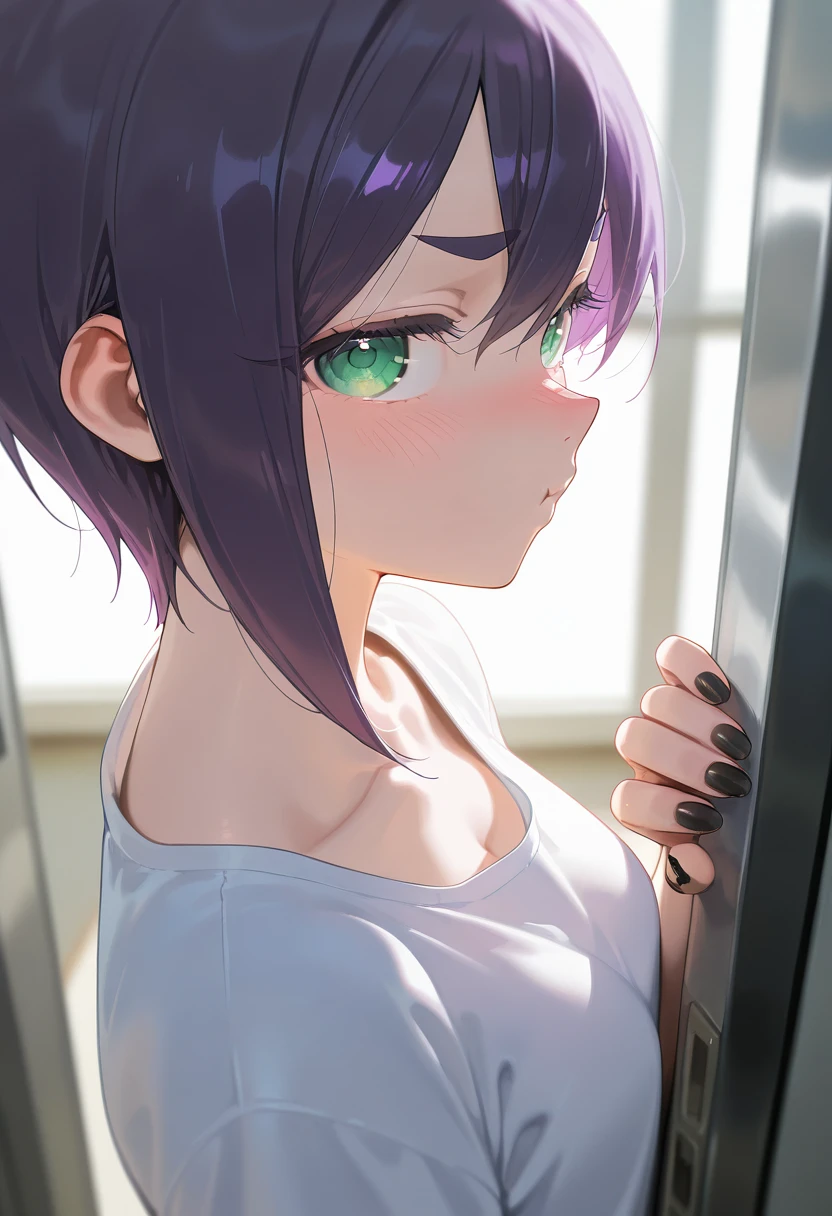 1girl, solo, short hair, purple hair, thick eyebrows, green eyes, medium breasts,