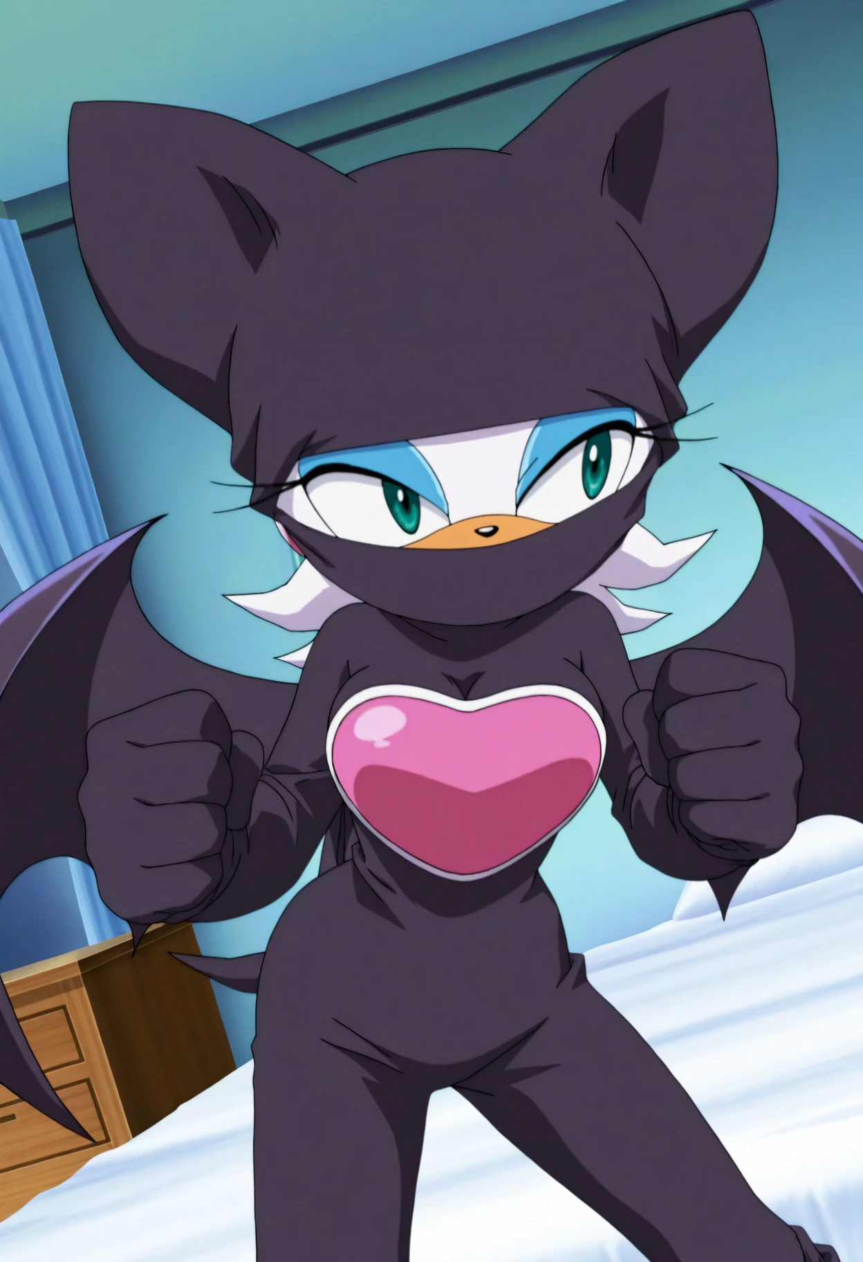rouge the bat, animal ears, bat ears, bat girl, bat tail, bat wings, eyeliner, furry, furry female, green eyes, makeup, tail, white hair, wings, eyeshadow, full bodysuit, covered shoulders, gloves, pink heart breastplate, ninja mask