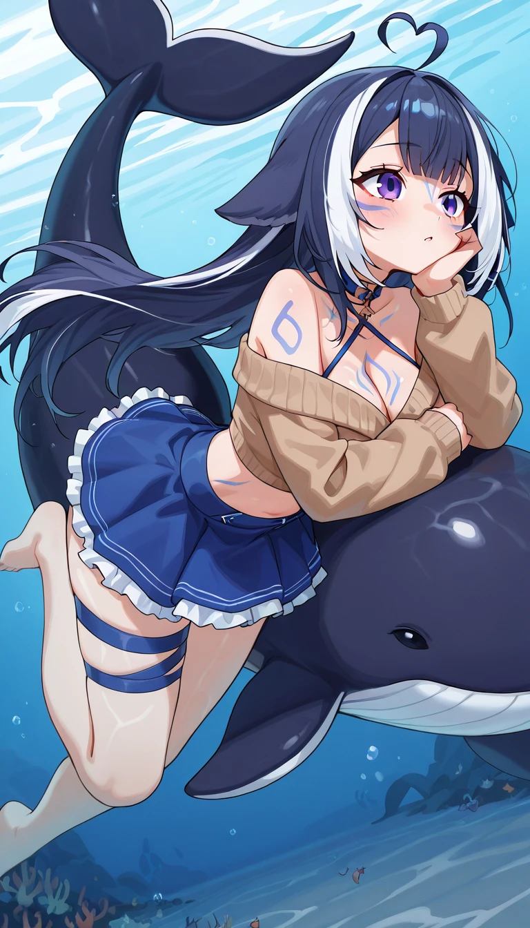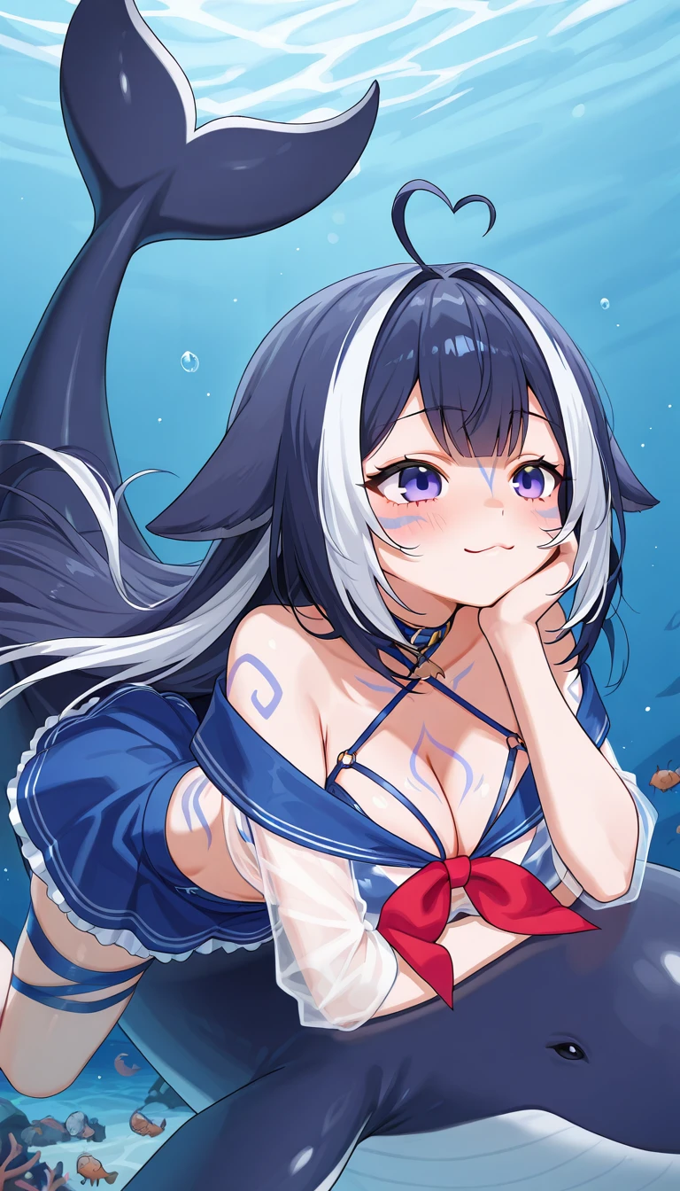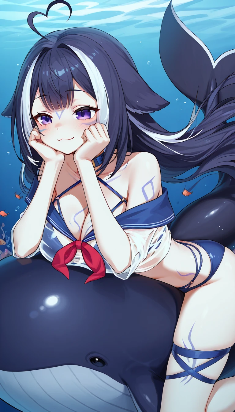 shy1ily, 1girl, ahoge, animal_ears, streaked_hair, blue_nails, body_markings, fish_tail, multicolored_eyes, multicolored_hair, Alternate, mostly unused: