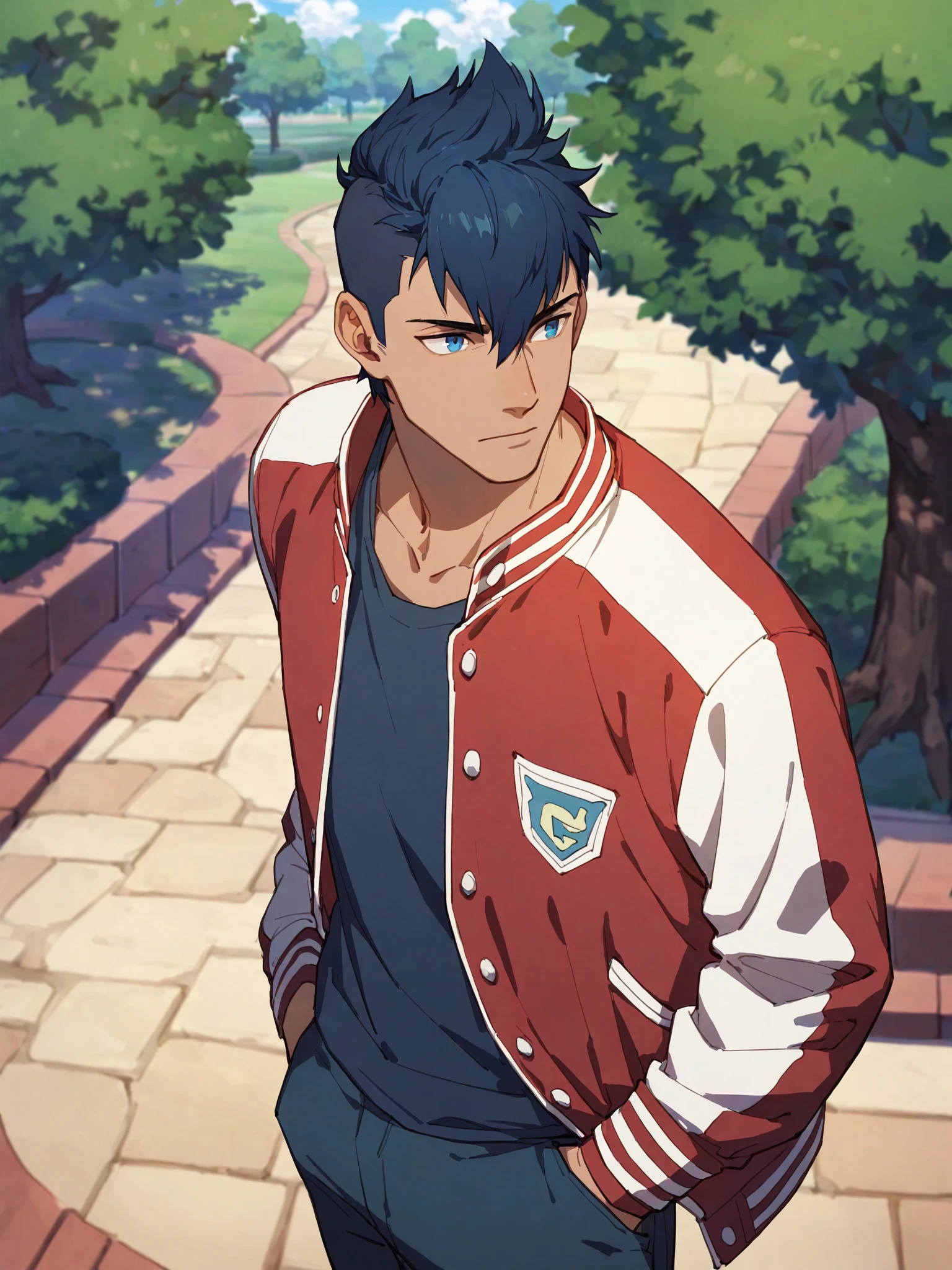 blue jacket,black shirt,black pants,bracelet,