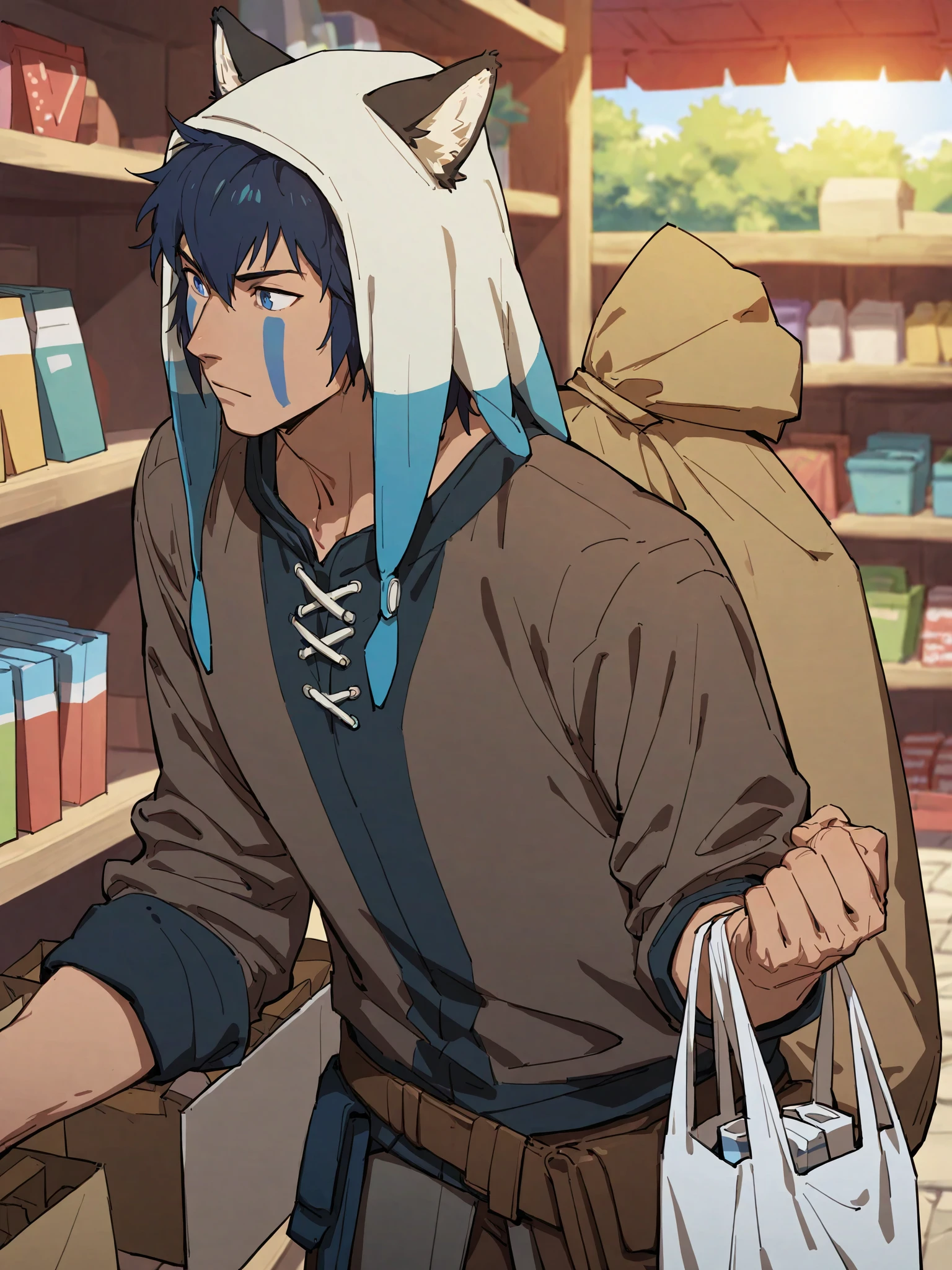 brown shirt,brown pants,animal ears,hood,facepaint,bag,
