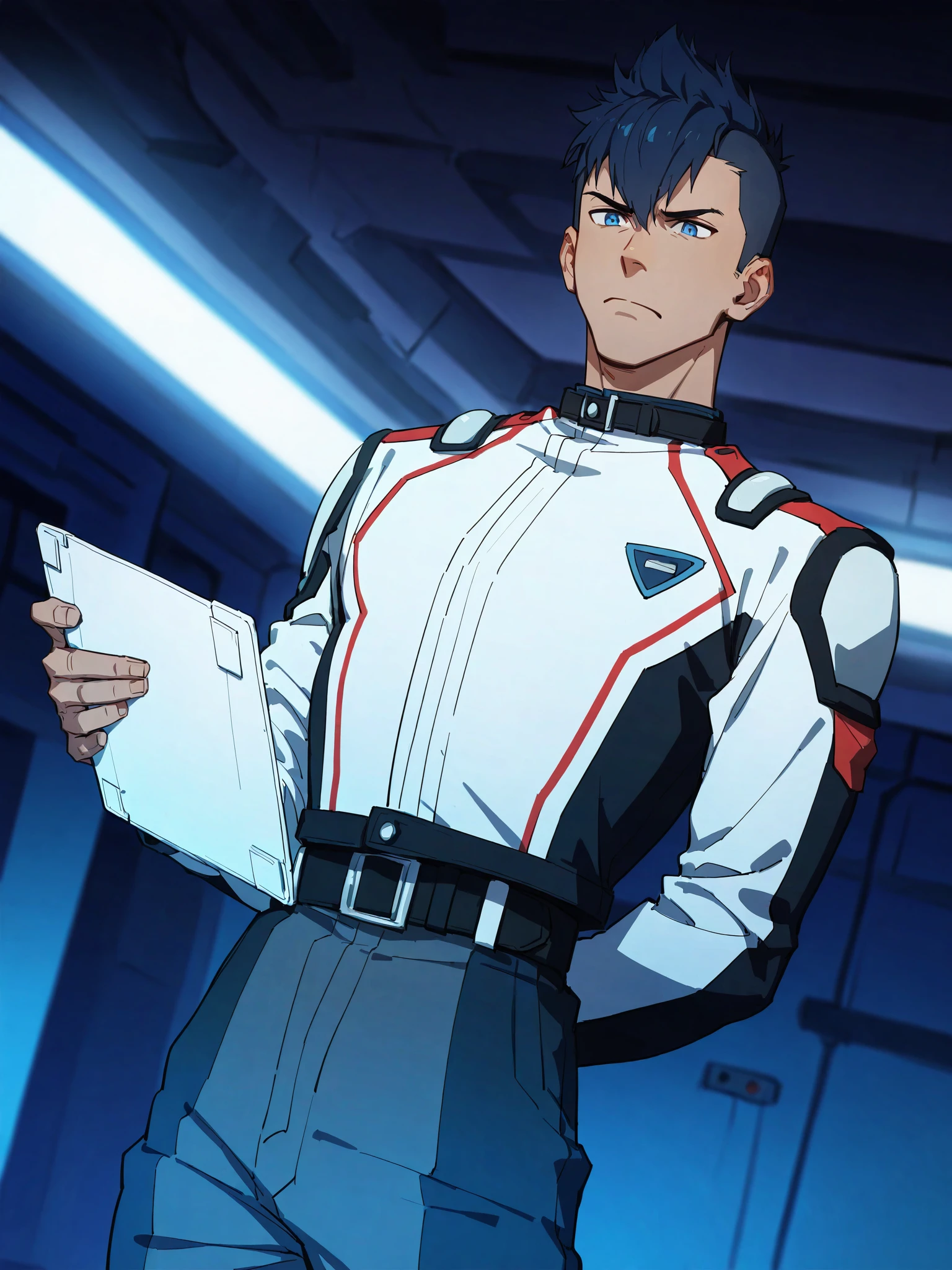 Messer Ihlefeld,1boy,solo,male focus,dark skin,blue hair,blue eyes,