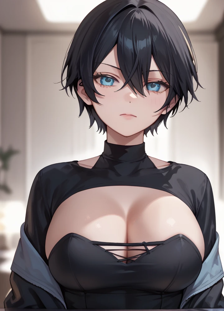 zunbird, black hair, bangs, blue eyes, large breasts, hair between eyes, short hair,