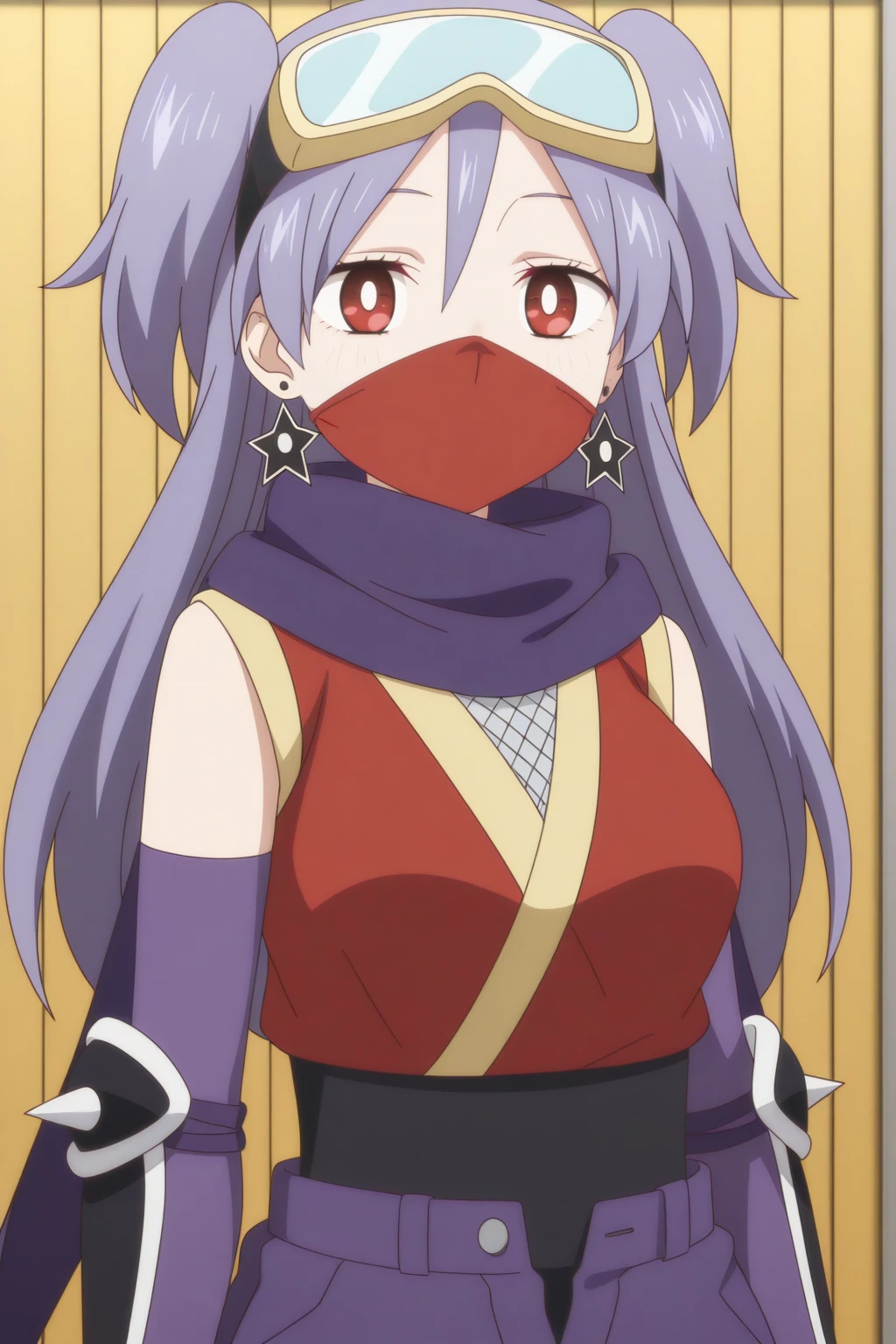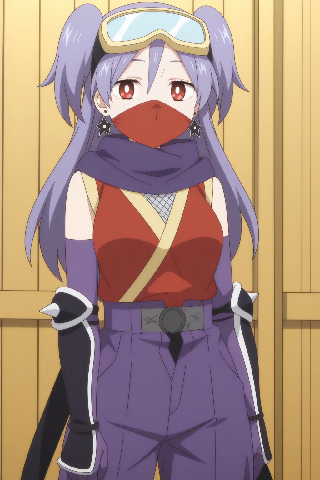 ninja, purple gloves, open fly, star earrings, shuriken, ninja mask, goggles on head