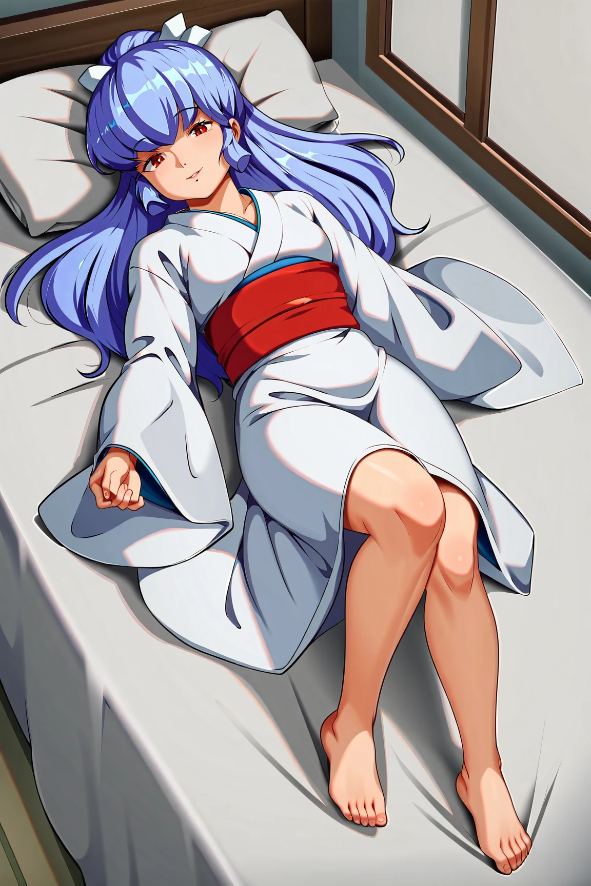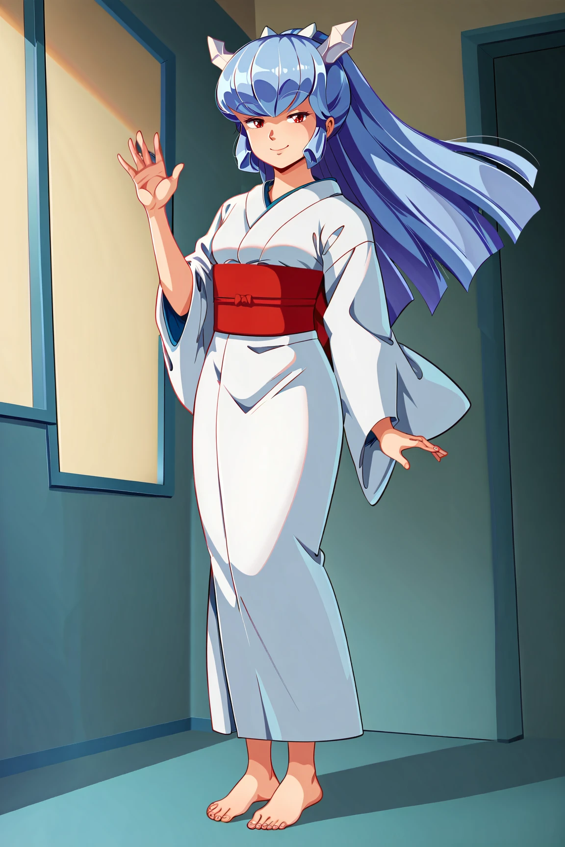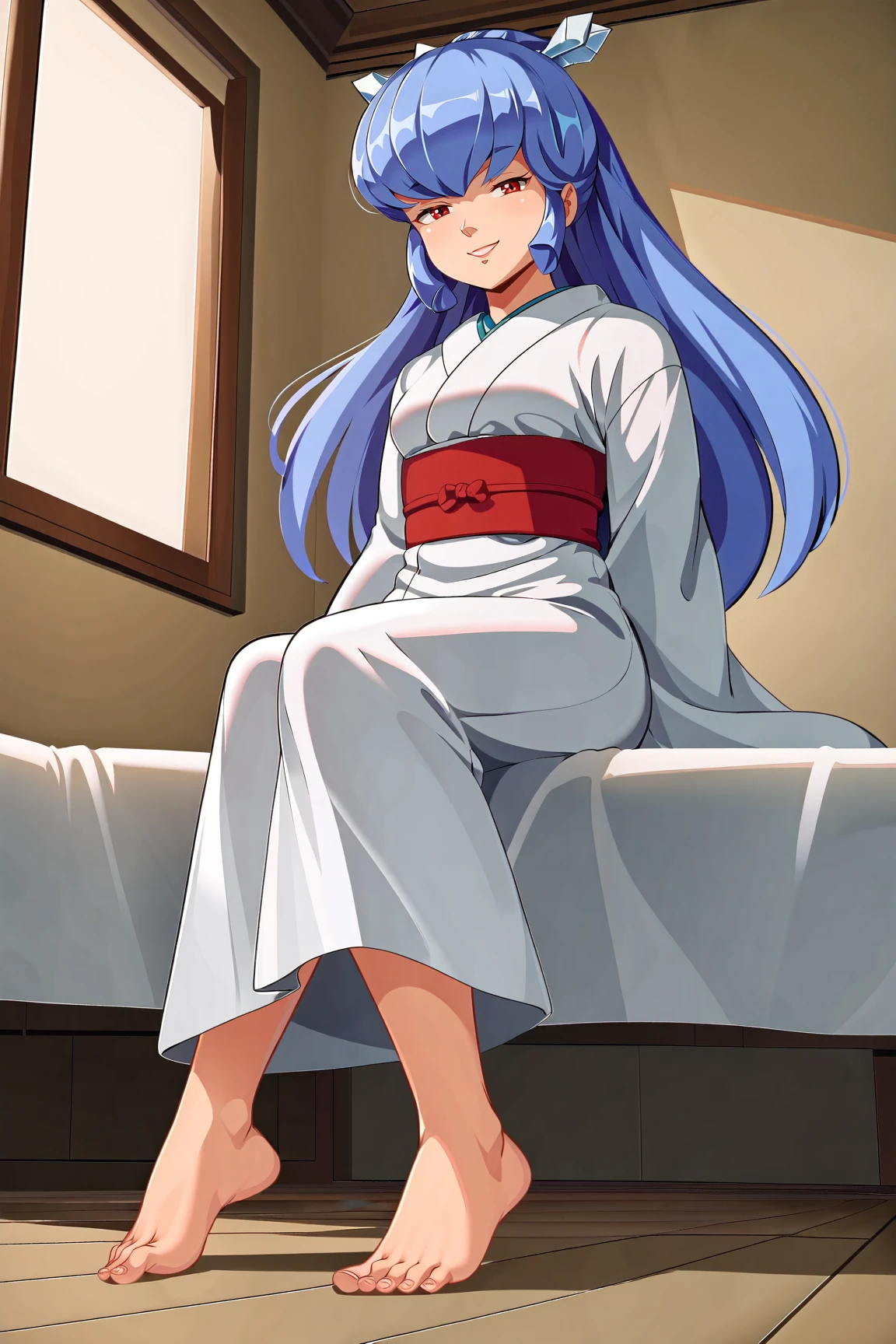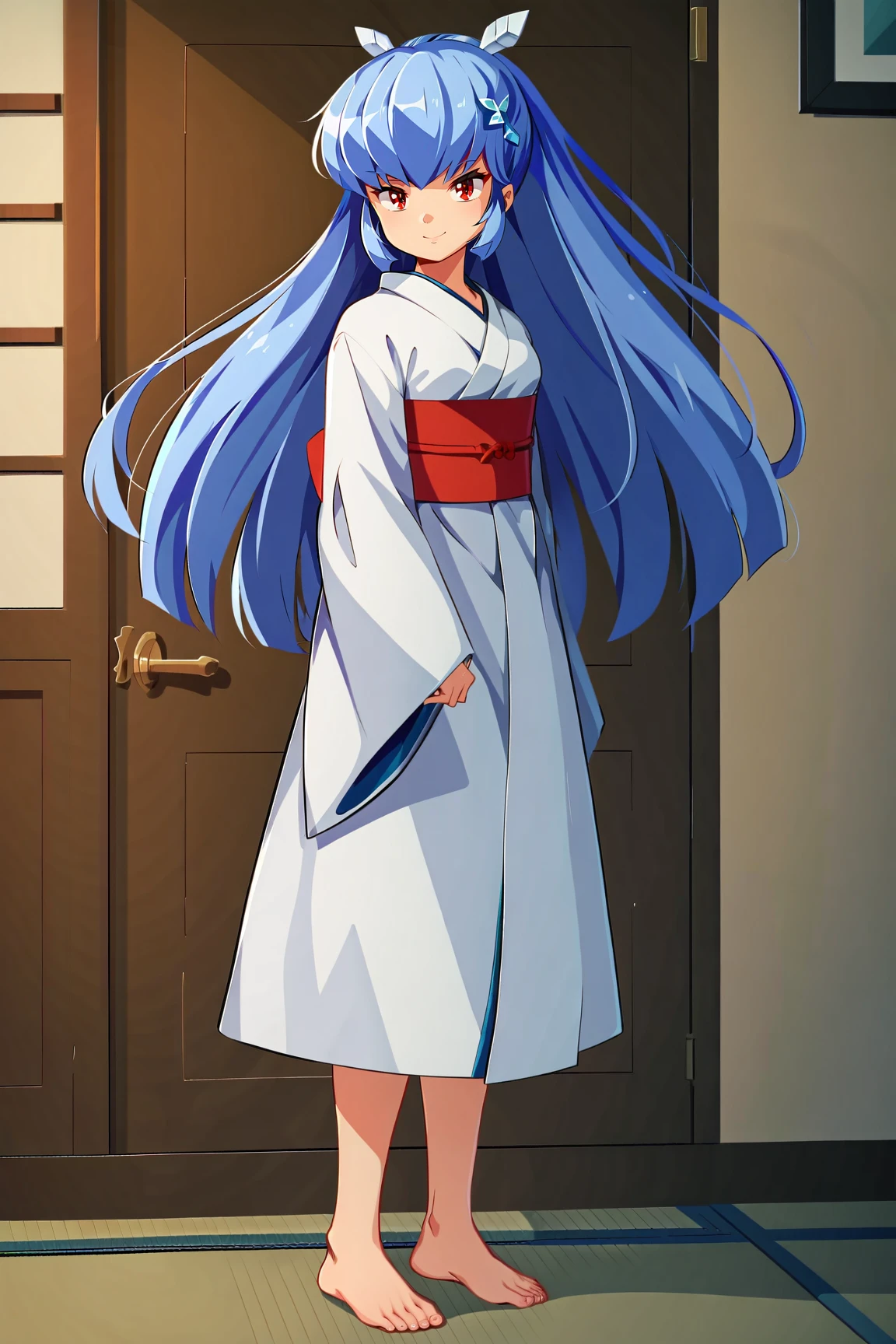 OyukiUYXL, red eyes, blue hair, long hair, bangs, sidelocks, hair ornament, small breasts, white kimono, red sash, barefoot