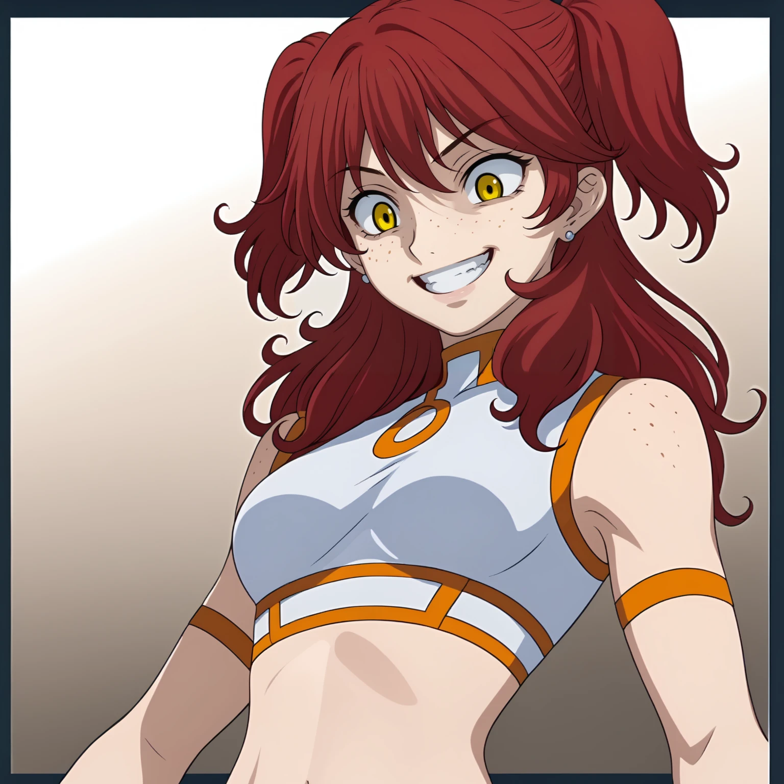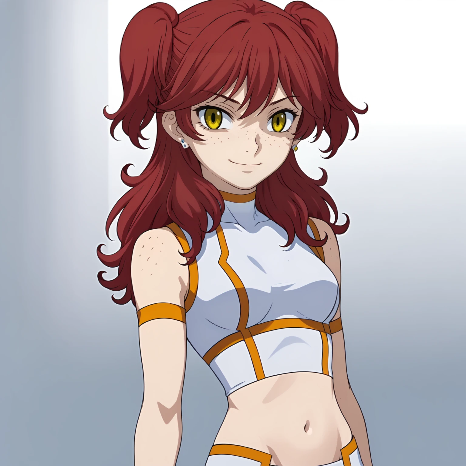 NenaTrinity,1girl, long hair,two side up,red hair,earrings,freckles,yellow eyes white croptop,midriff,sleeveless, armband, shorts, white_thighhighs,