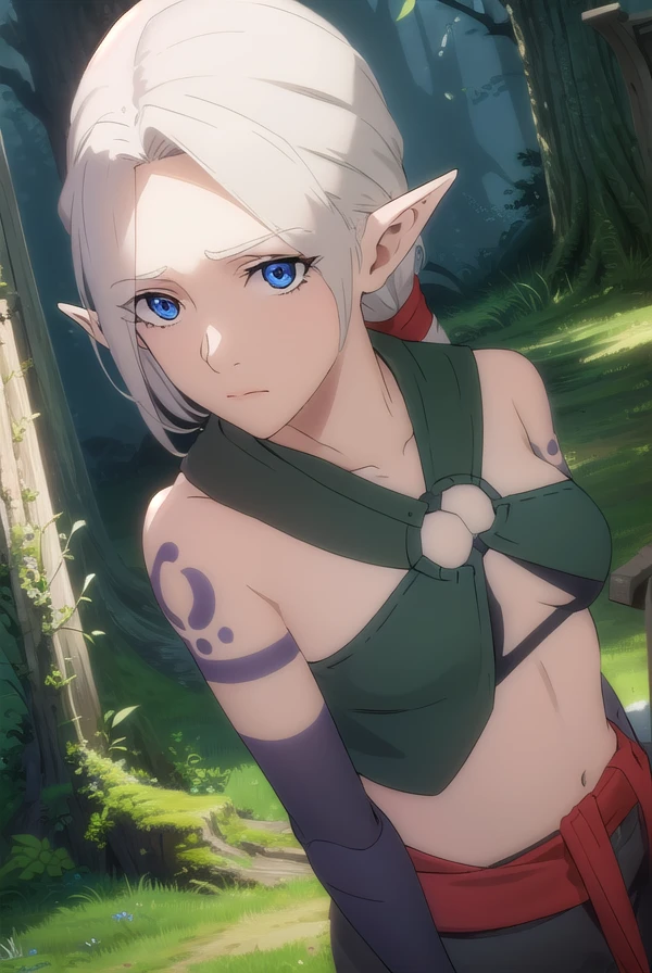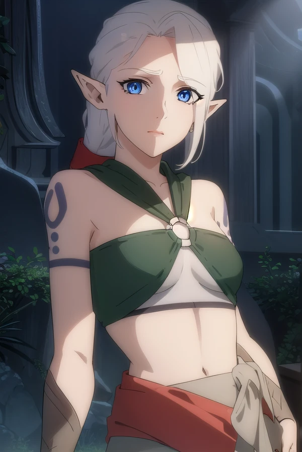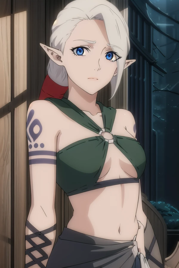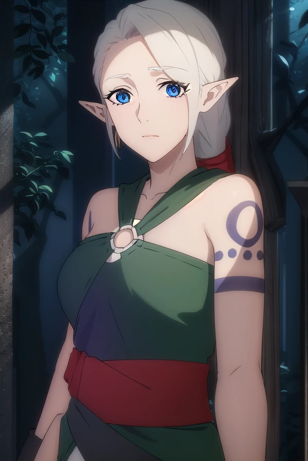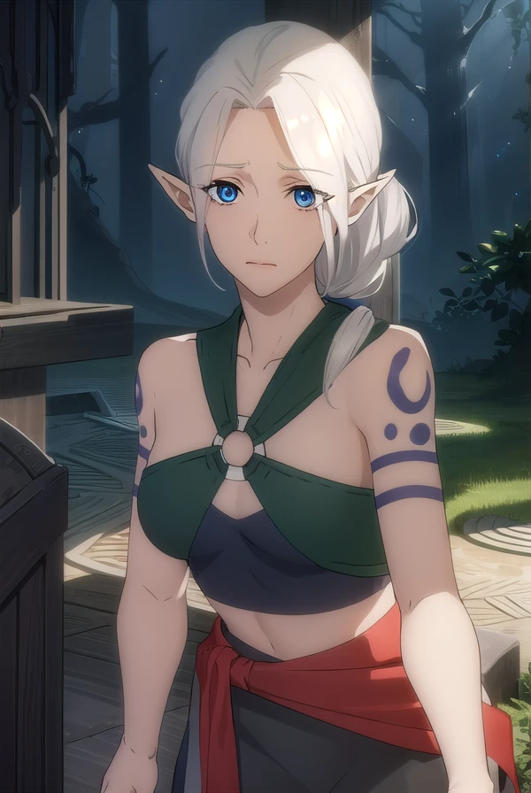 adara, ponytail, grey hair, pointy ears, elf, blue eyes,