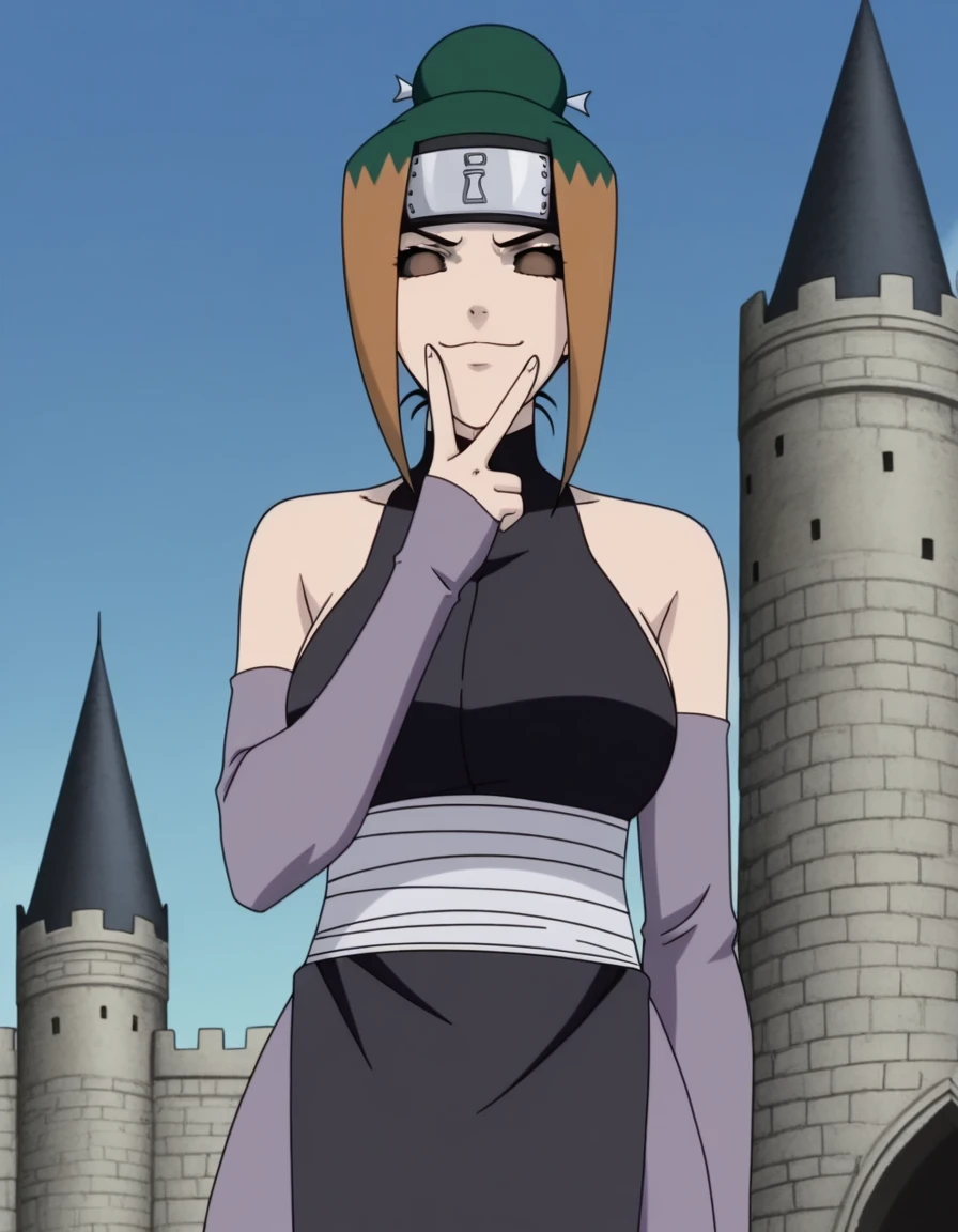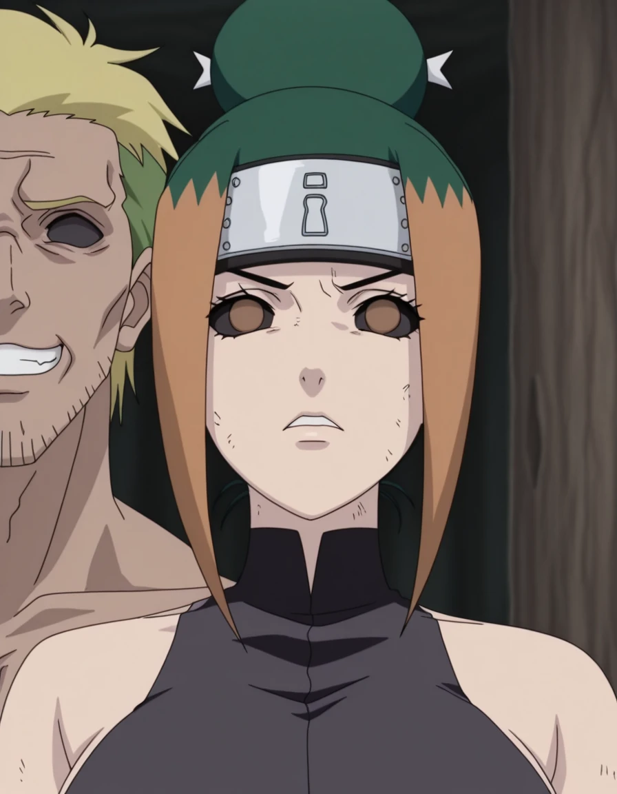 pakura, brown hair, hair bun, green hair, two-tone hair, sidelocks, black sclera, colored sclera, blank eyes, brown eyes, short hair, mature female, medium breasts, anime screencap