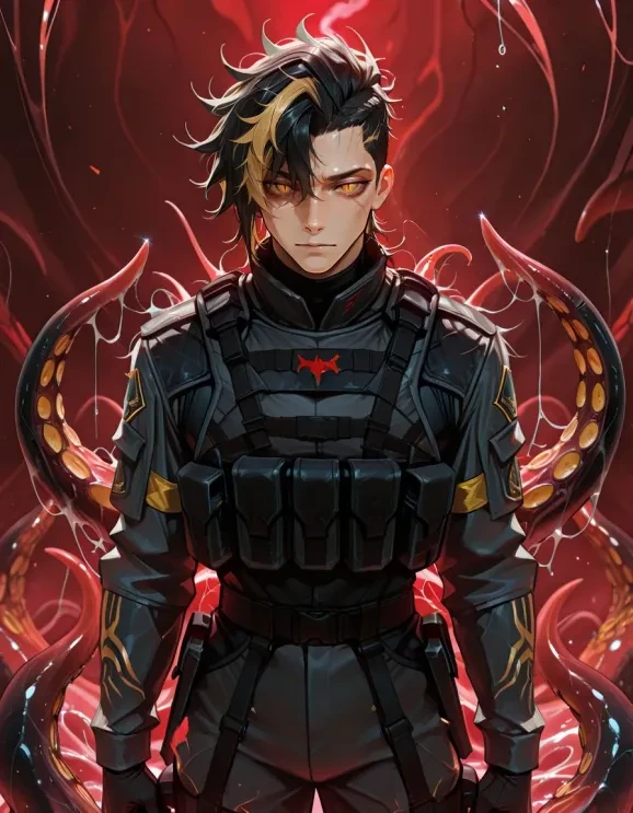 male focus, blonde streaks, multicolored hair, black hair, short hair, streaked hair, messy hair, sidecut, yellow eyes, slit pupils, red pupils, tactical clothes, vest