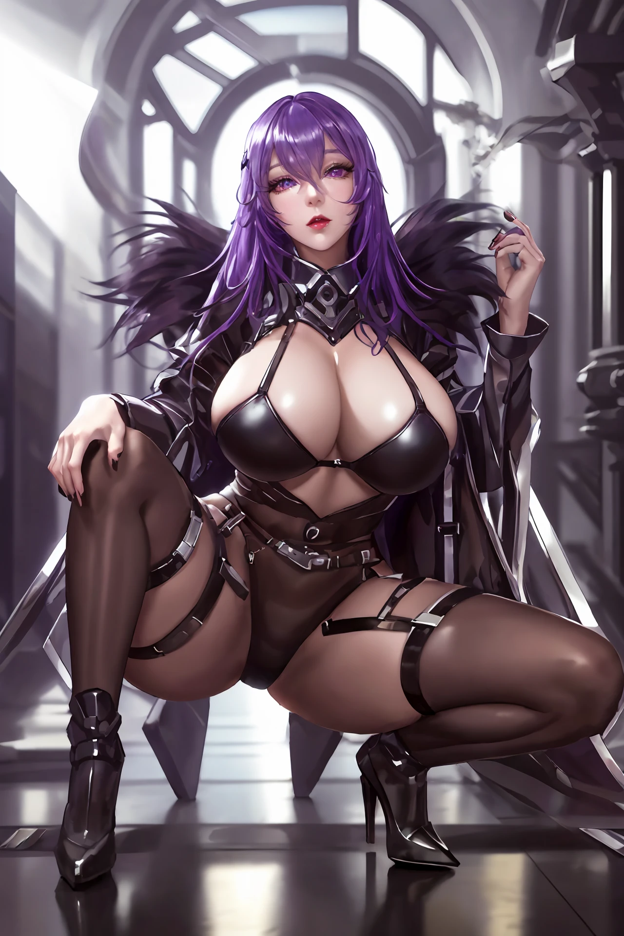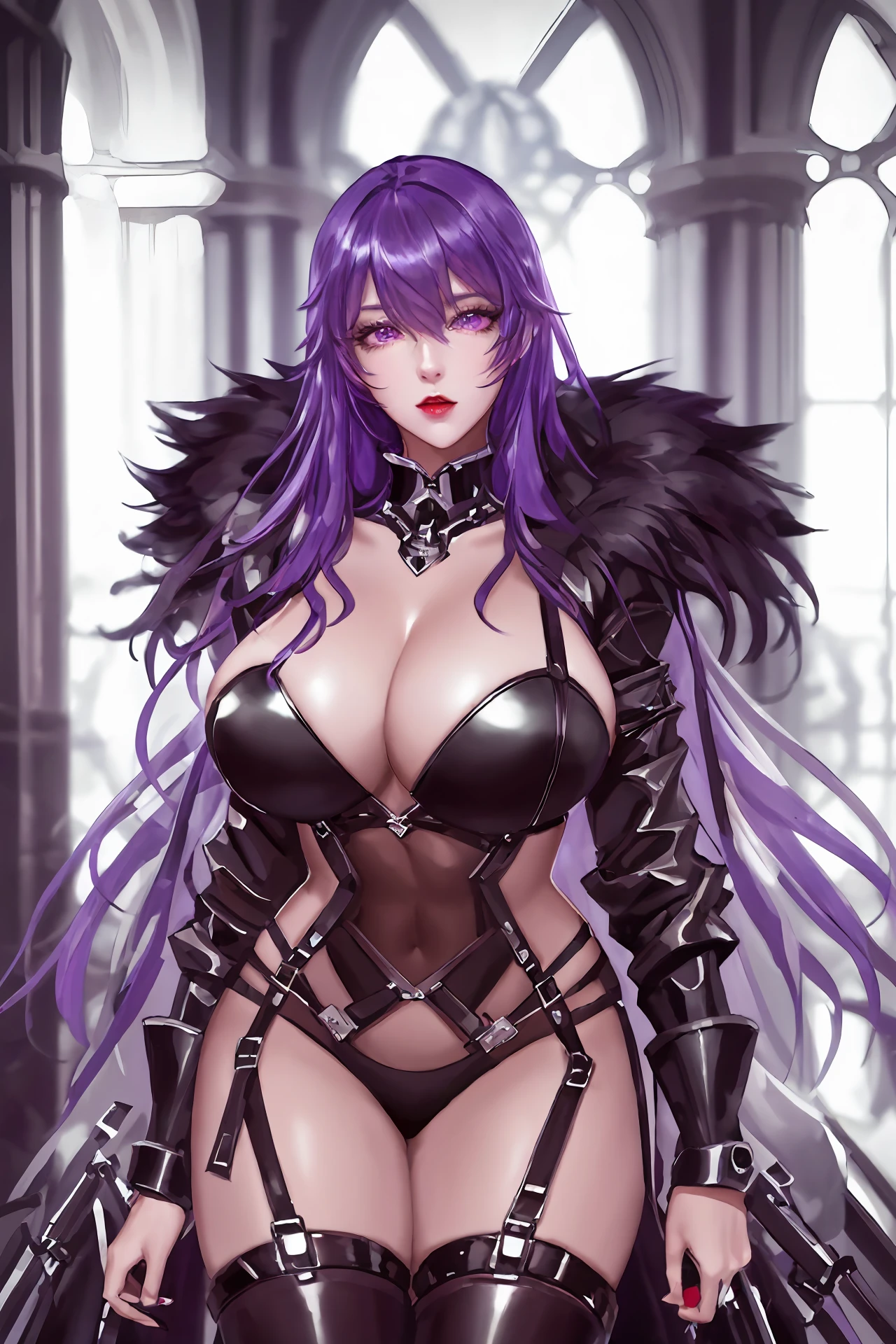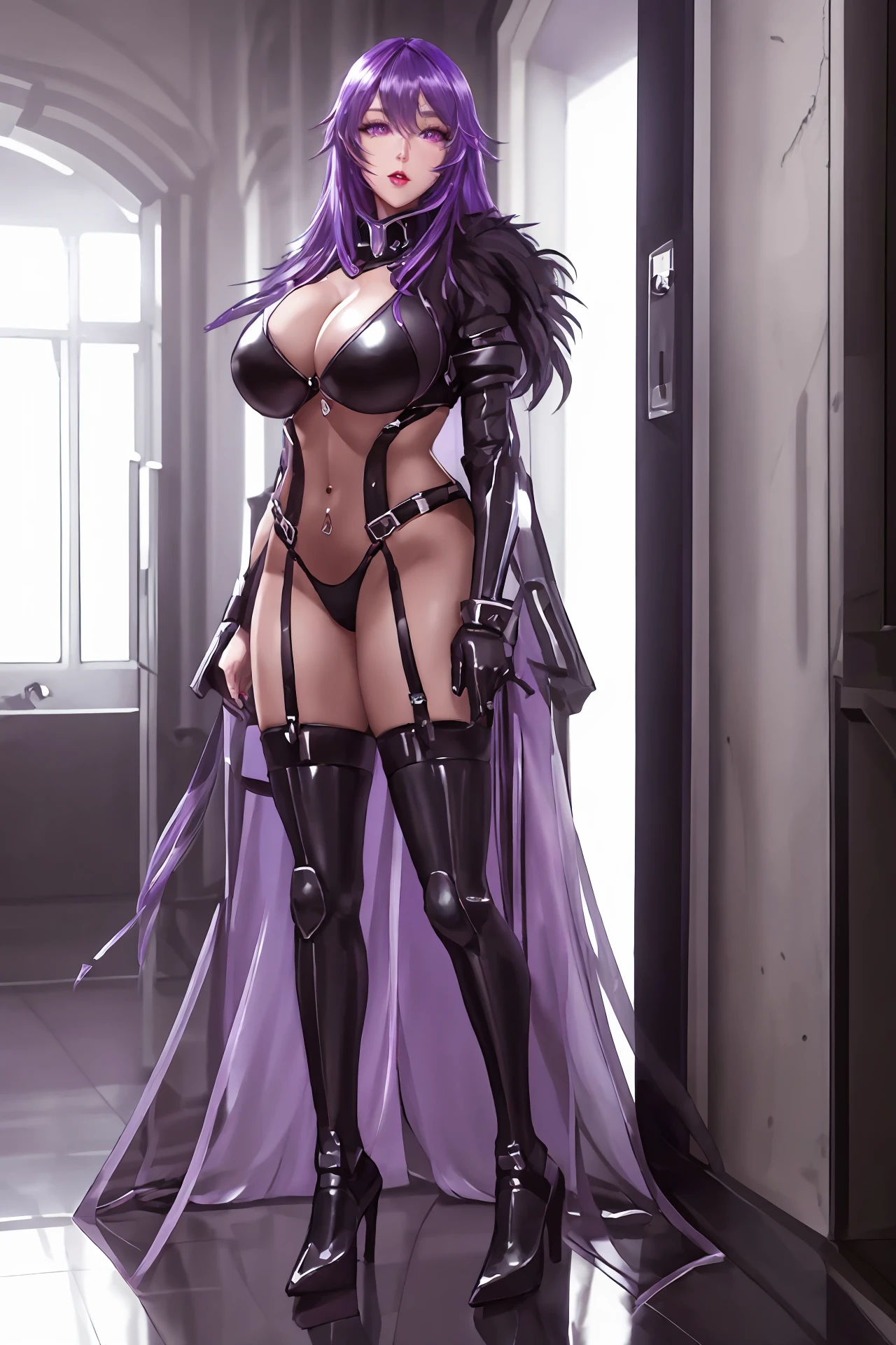 very long hair,purple hair,red hair,purple eyes,wavy_hair, mecha_armor,bodysuit,belt,fur_collar,fur trim coat,leotard,long sleeves,panties,pantyhose,black gloves,gloves,thigh strap,thigh boots,mecha boots, huge breasts,curvy body,bsdm,