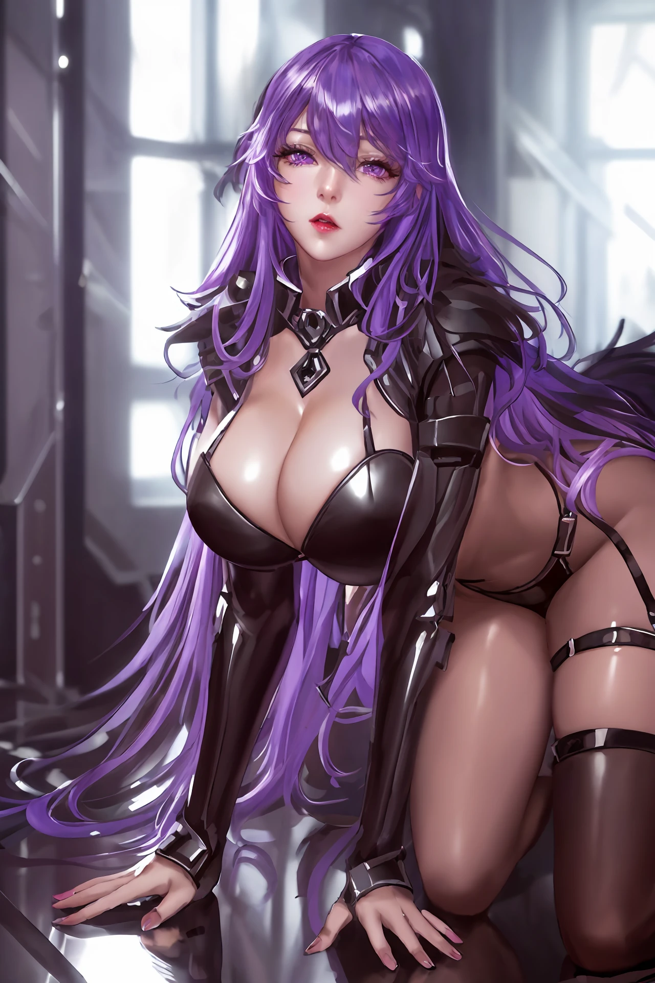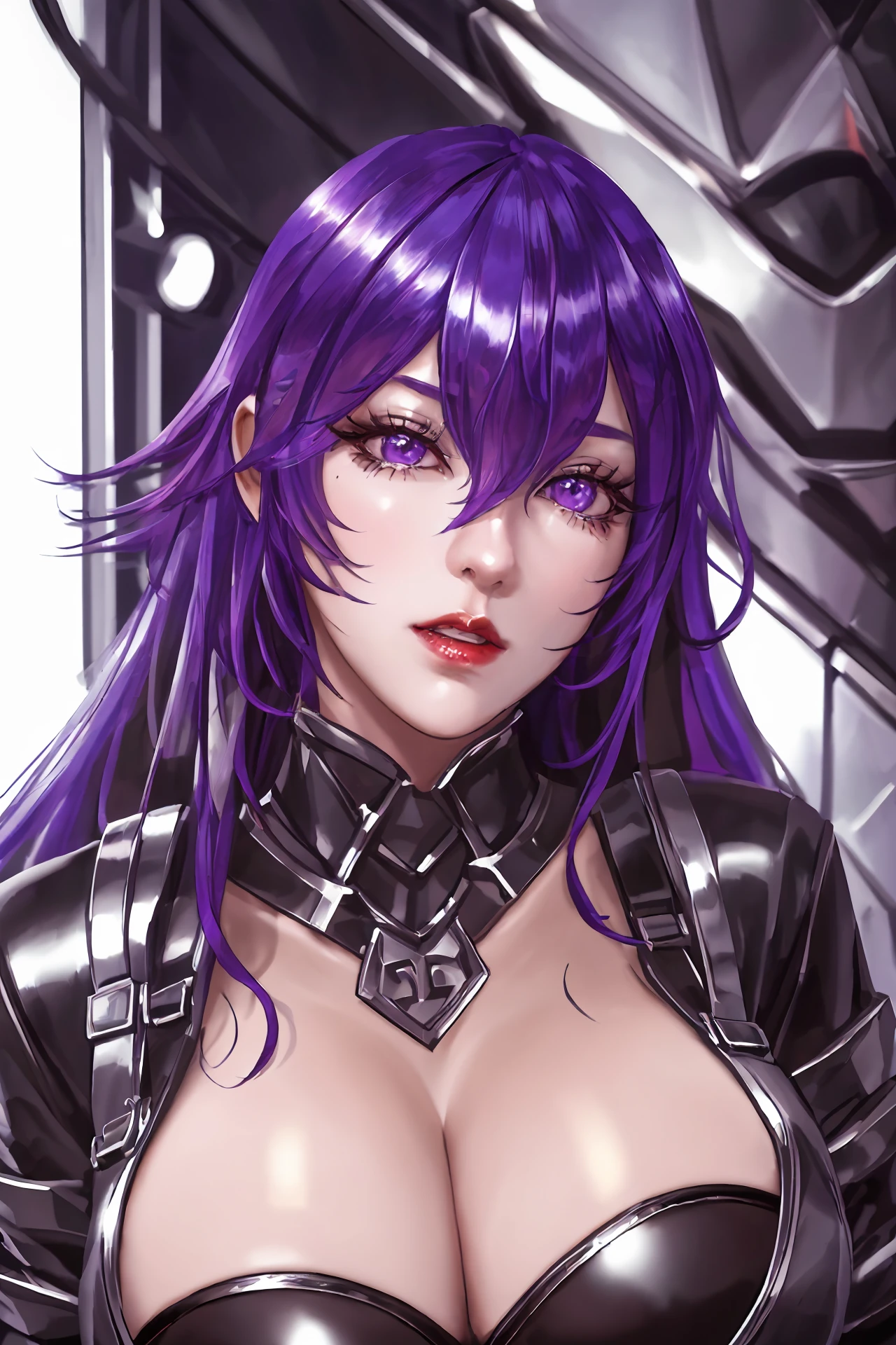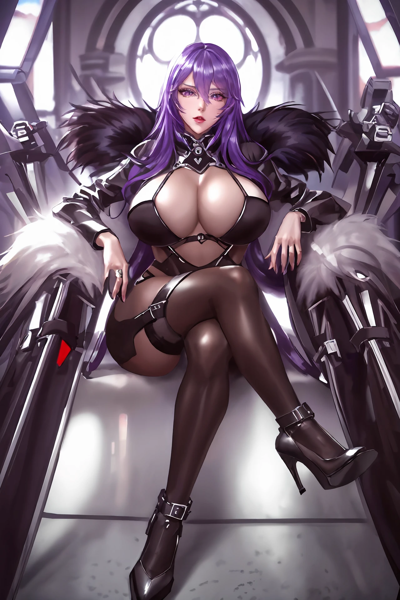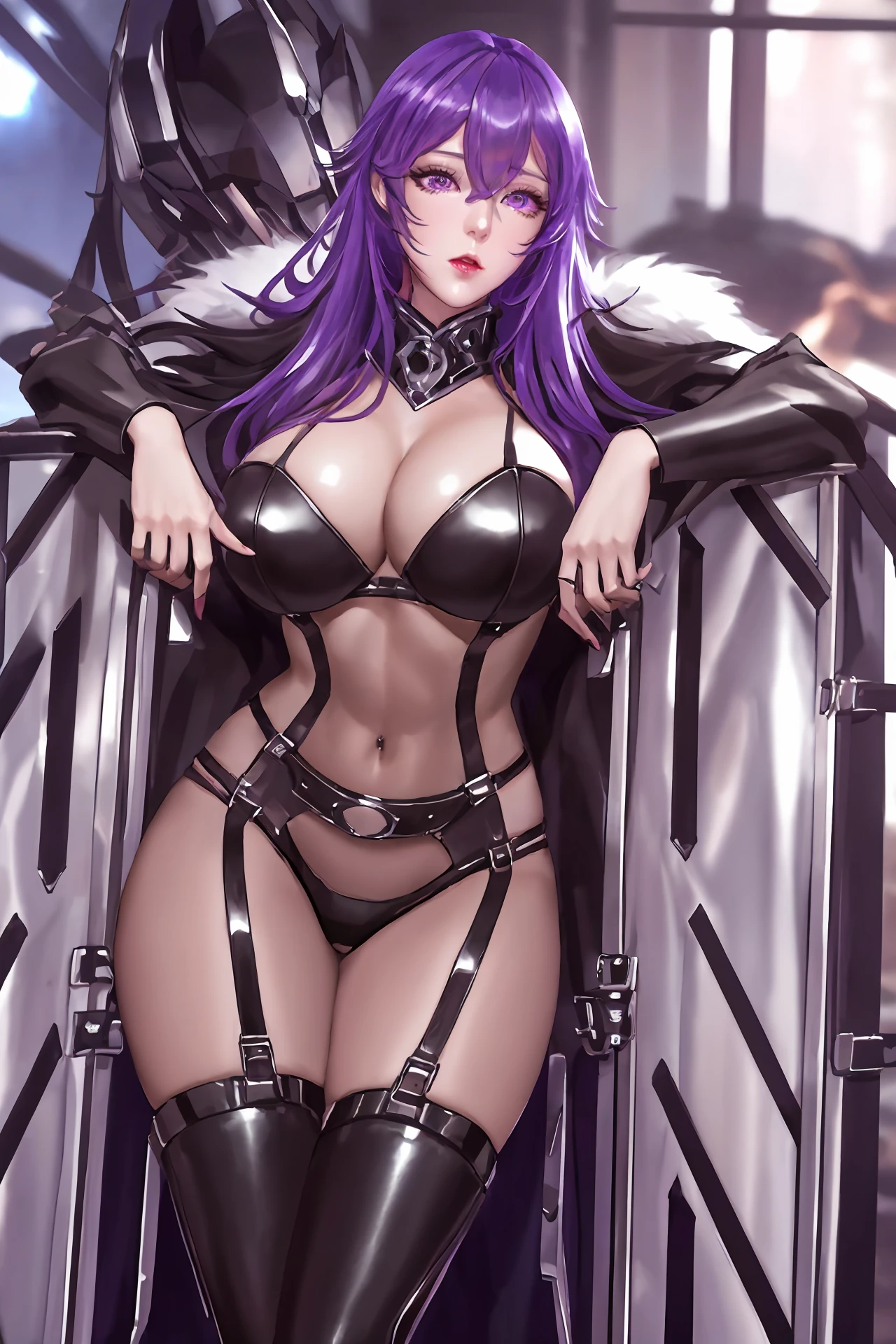 very long hair,purple hair,red hair,purple eyes,wavy_hair, mecha_armor,bodysuit,belt,fur_collar,fur trim coat,leotard,long sleeves,panties,pantyhose,black gloves,gloves,thigh strap,thigh boots,mecha boots, huge breasts,curvy body,bsdm,