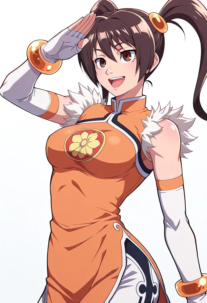 gloves, twintails, fingerless gloves, chinese clothes, elbow gloves, dress, china dress, smile, open mouth, brown hair, brown eyes,jewelry, white gloves, bracelet, breasts, salute,orange dress