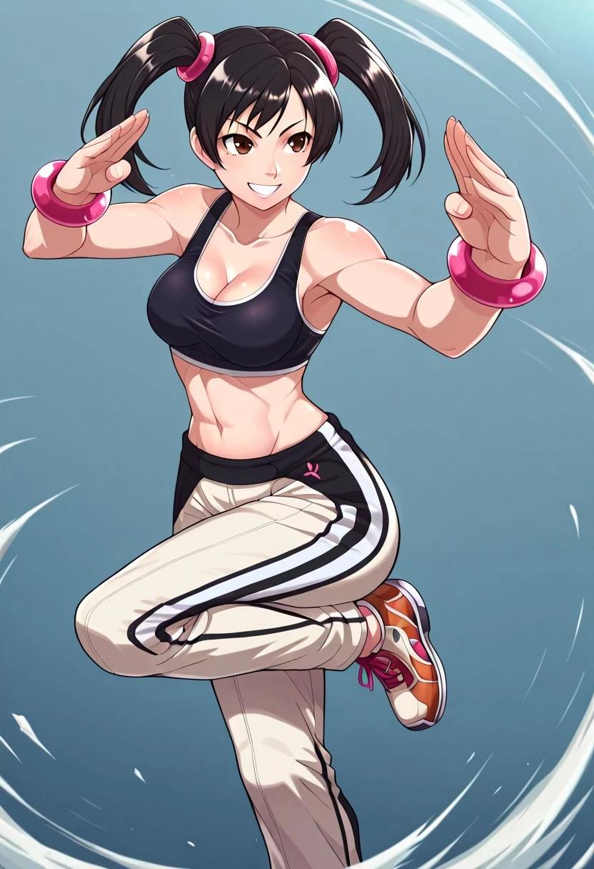 navel, gloves, black hair, twintails, fingerless gloves, sports bra, brown eyes, breasts, jacket, sweat,cropped jacket, long sleeves, looking at viewer, midriff, black gloves, bracelet, small breasts, smile, open clothes, jewelry, open jacket, pants, towel, cleavage, short twintails
