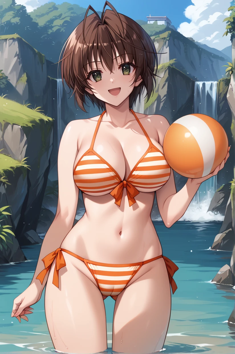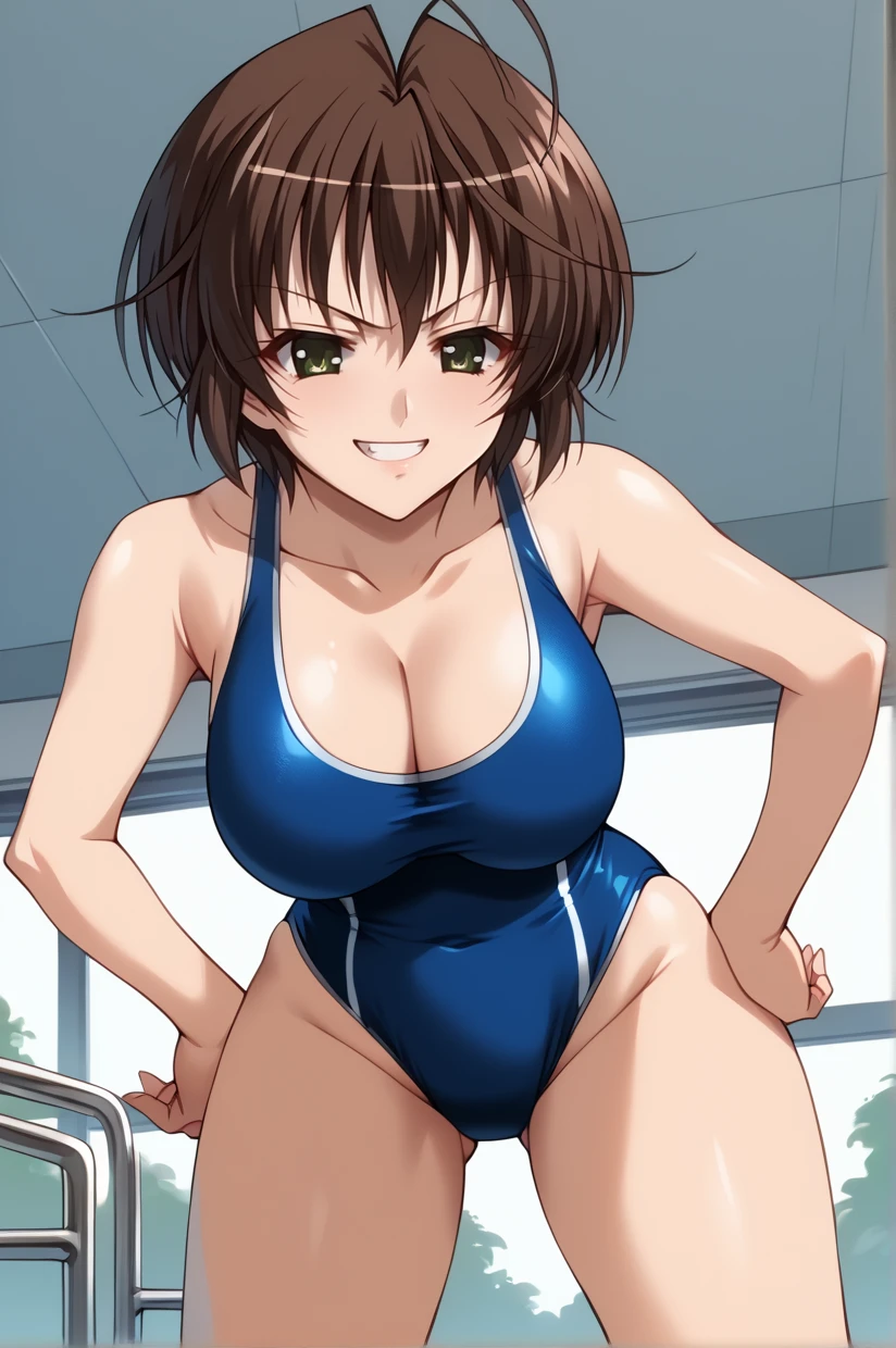 brown hair, short hair, ahoge, green eyes, large breasts