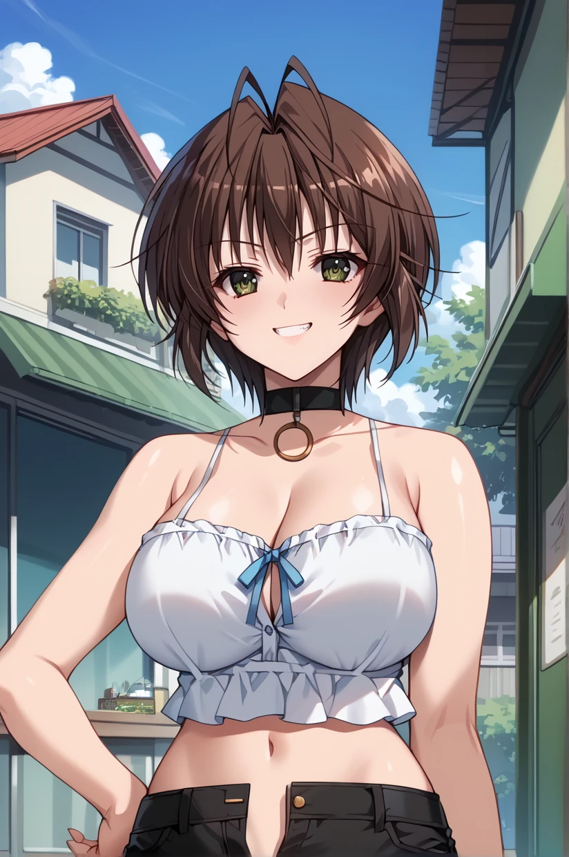NSDress, bare shoulders, collar, black choker, cleavage, crop top, camisole, midriff, open fly, black shorts,