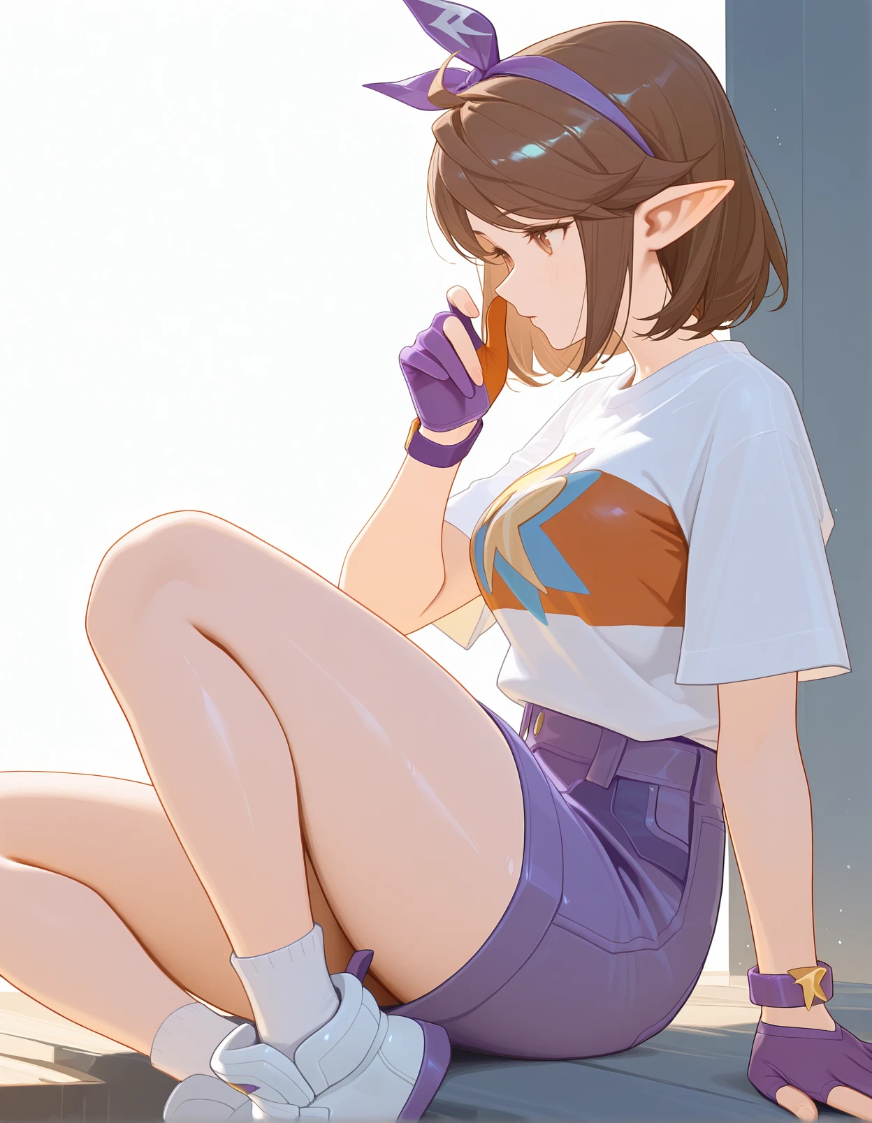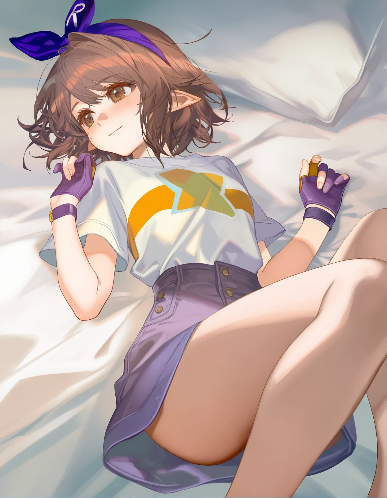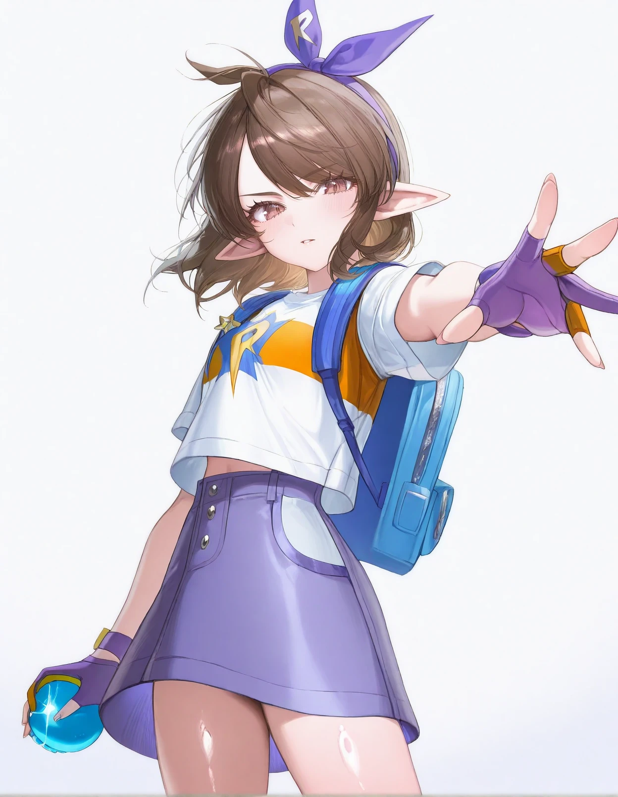 femaleroco,1girl,brown hair,short hair,swept bangs,antenna hair,brown eyes,pointy ears,bow hairband,print shirt,white shirt,blue backpack,purple gloves,partially fingerless gloves,purple denim skirt,white socks,white sneakers,