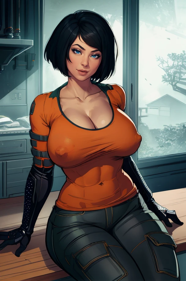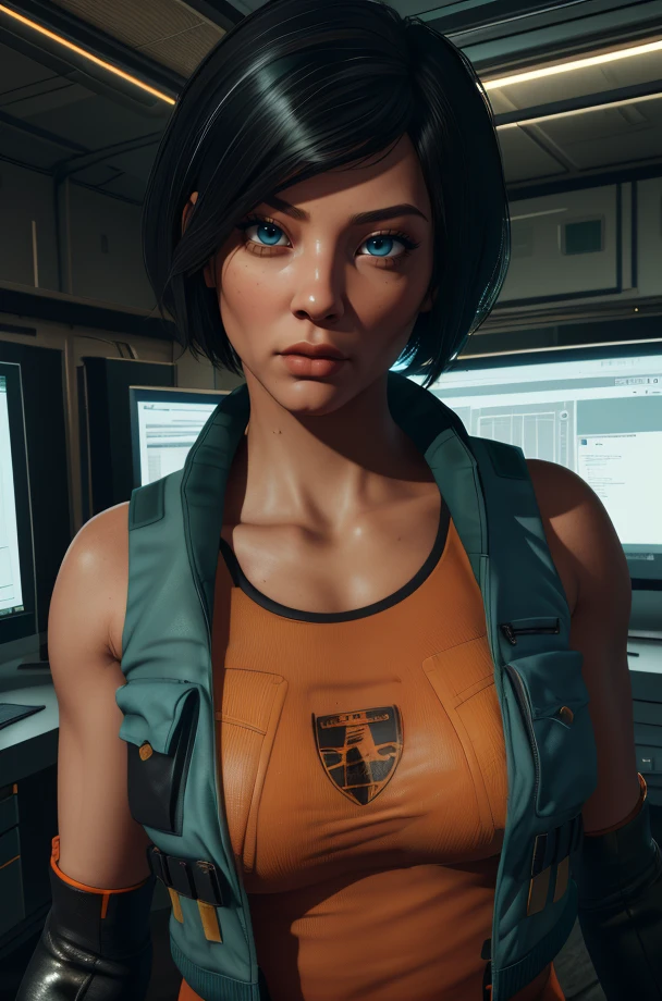 elbow gloves, or black elbow gloves, green vest, or vest, orange shirt, or shirt, pants, belt,