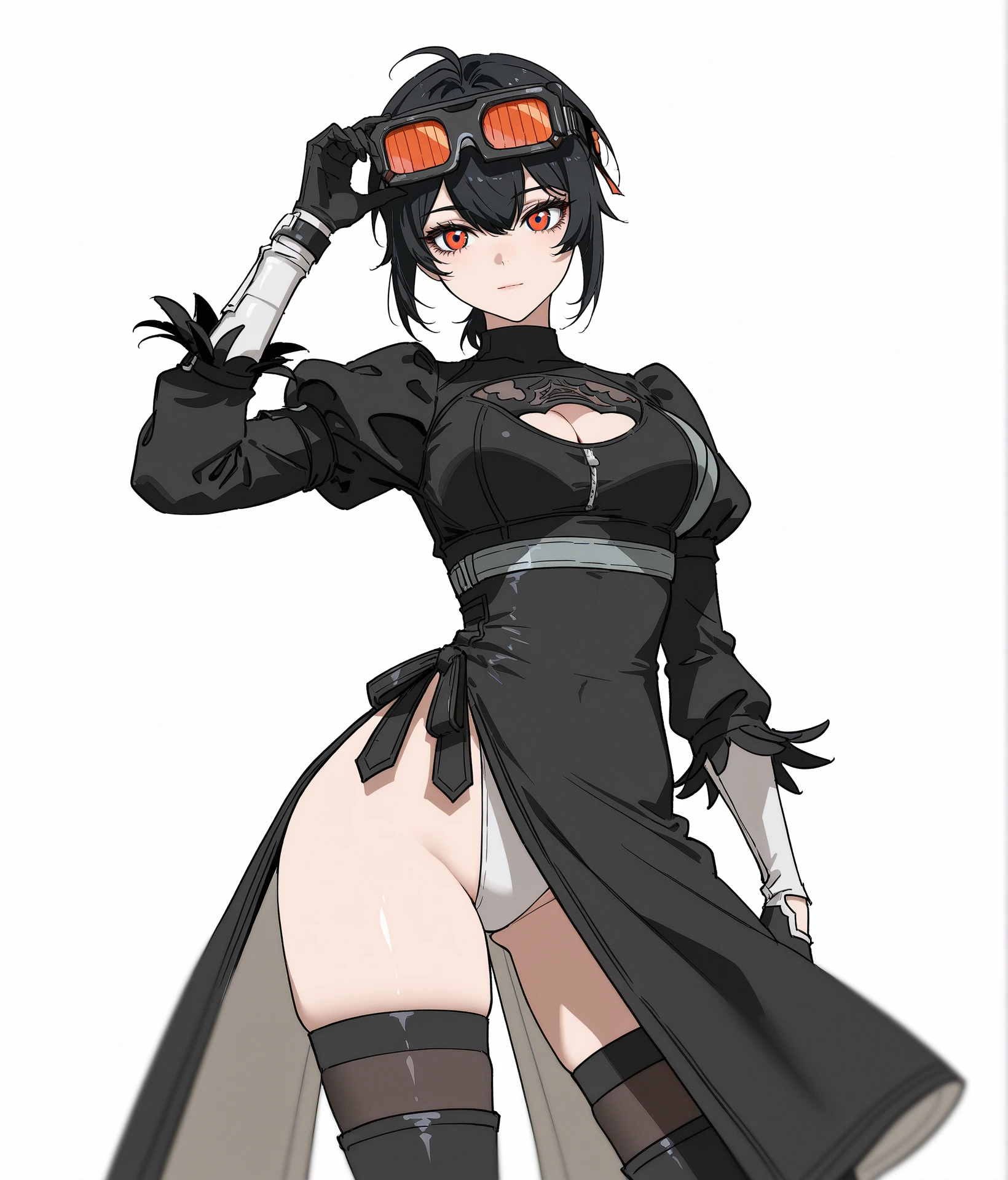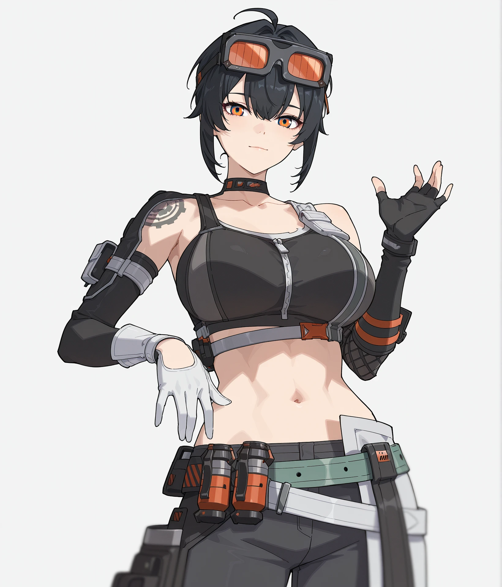 gloves, black gloves, fingerless gloves, elbow gloves, white gloves, asymmetrical gloves, mismatched gloves, detached sleeves, sleeveless, single elbow glove, two-tone gloves, single detached sleeve, shirt, choker, crop top, black shirt, zipper, black sleeves, arm warmers, zipper pull tab, asymmetrical sleeves,