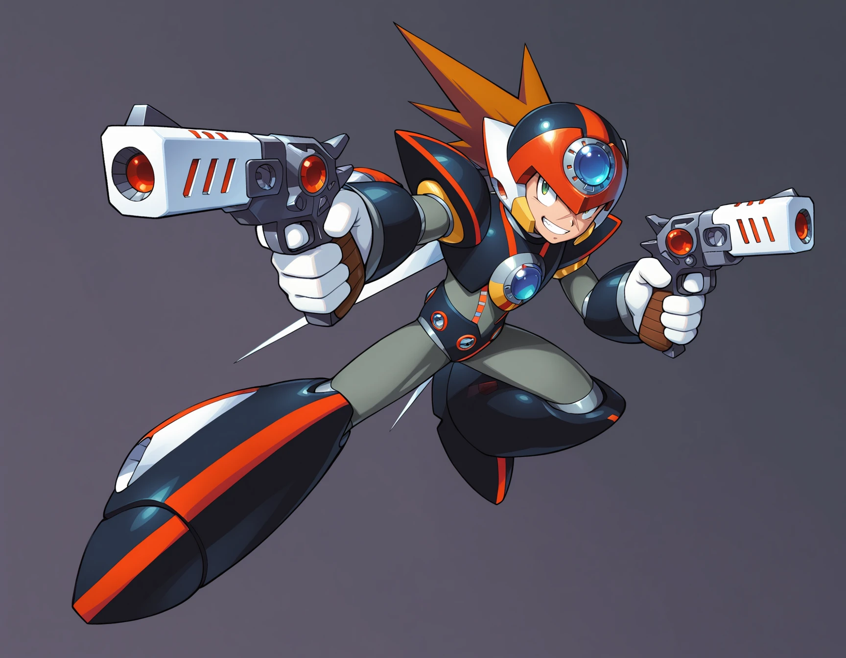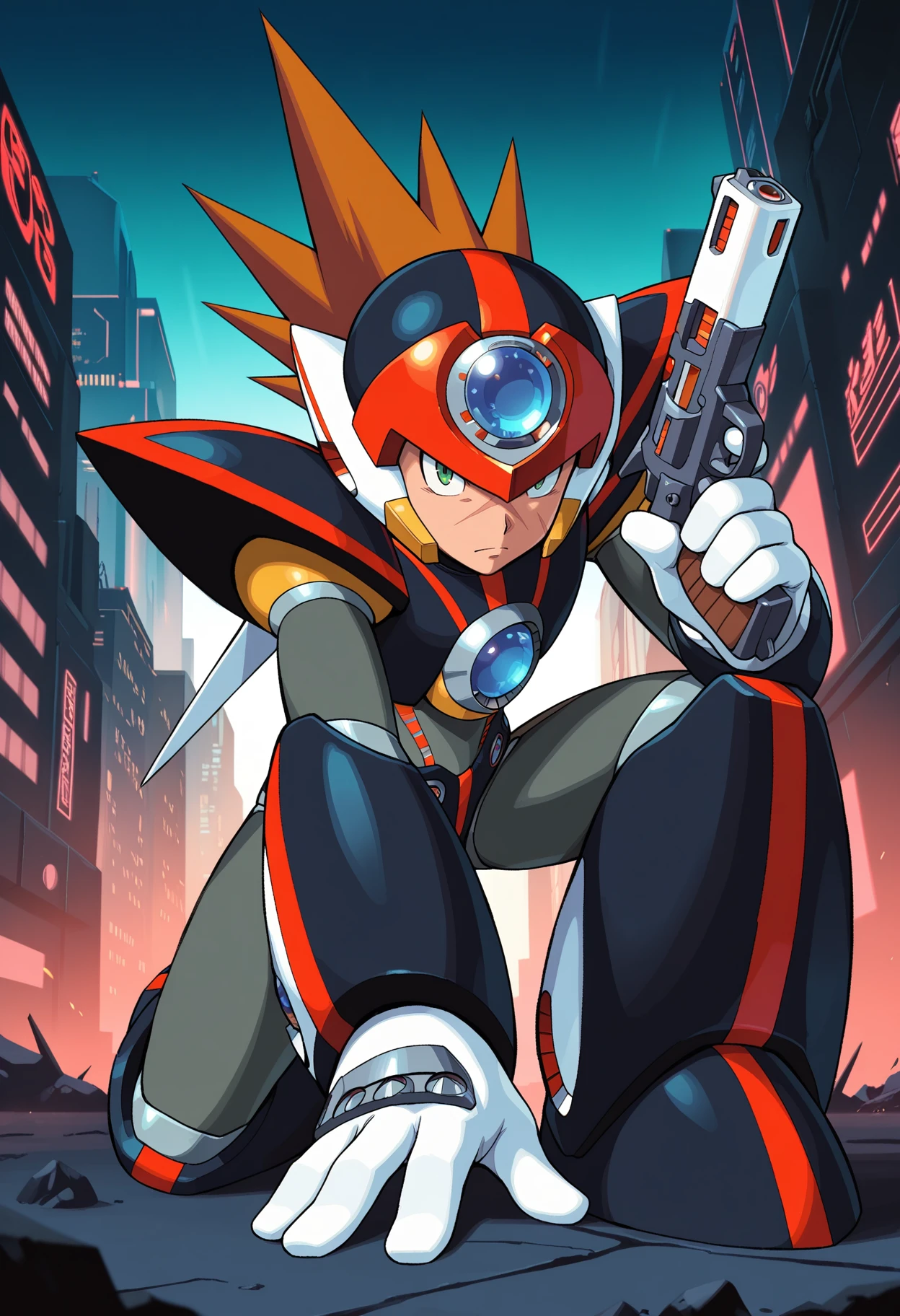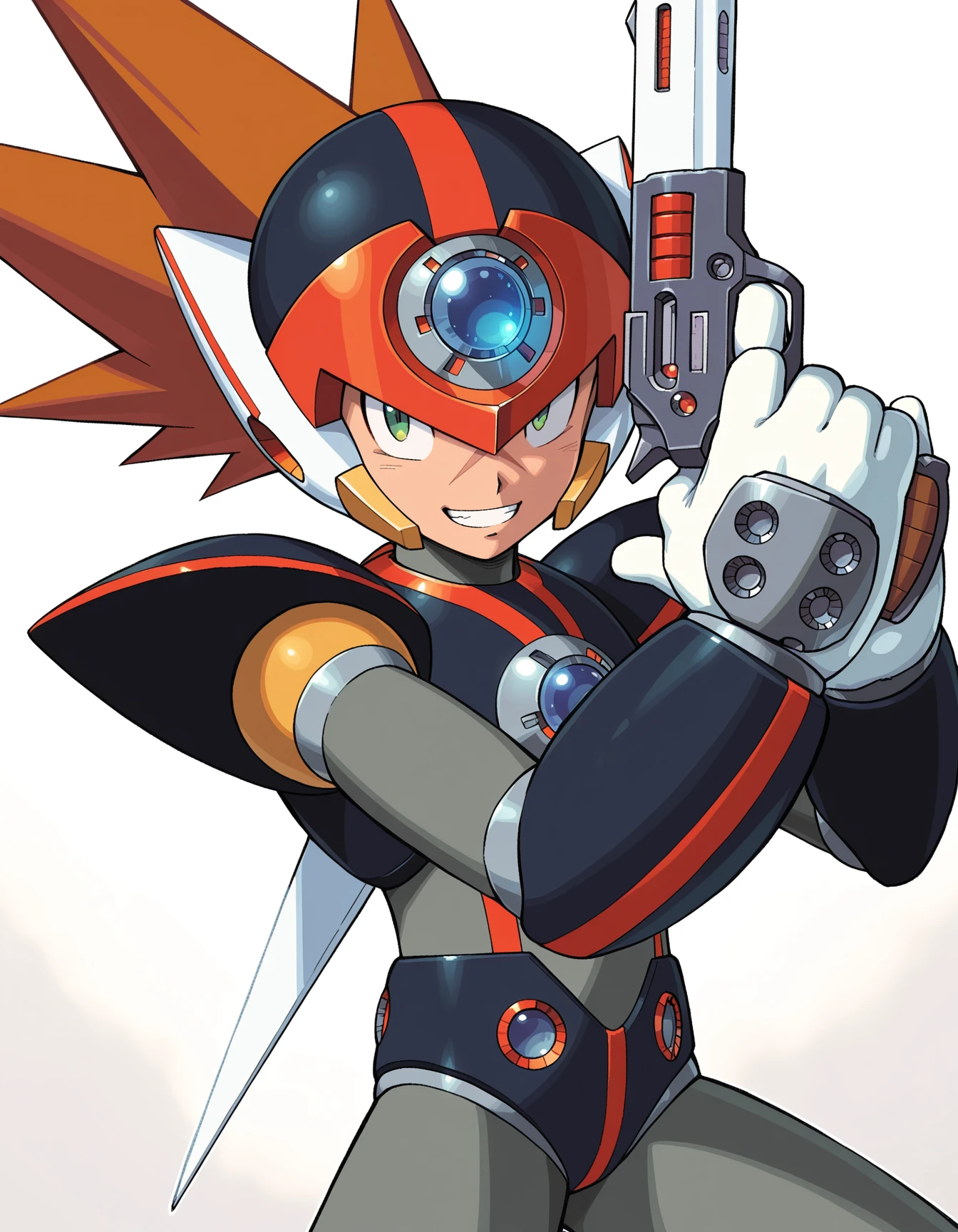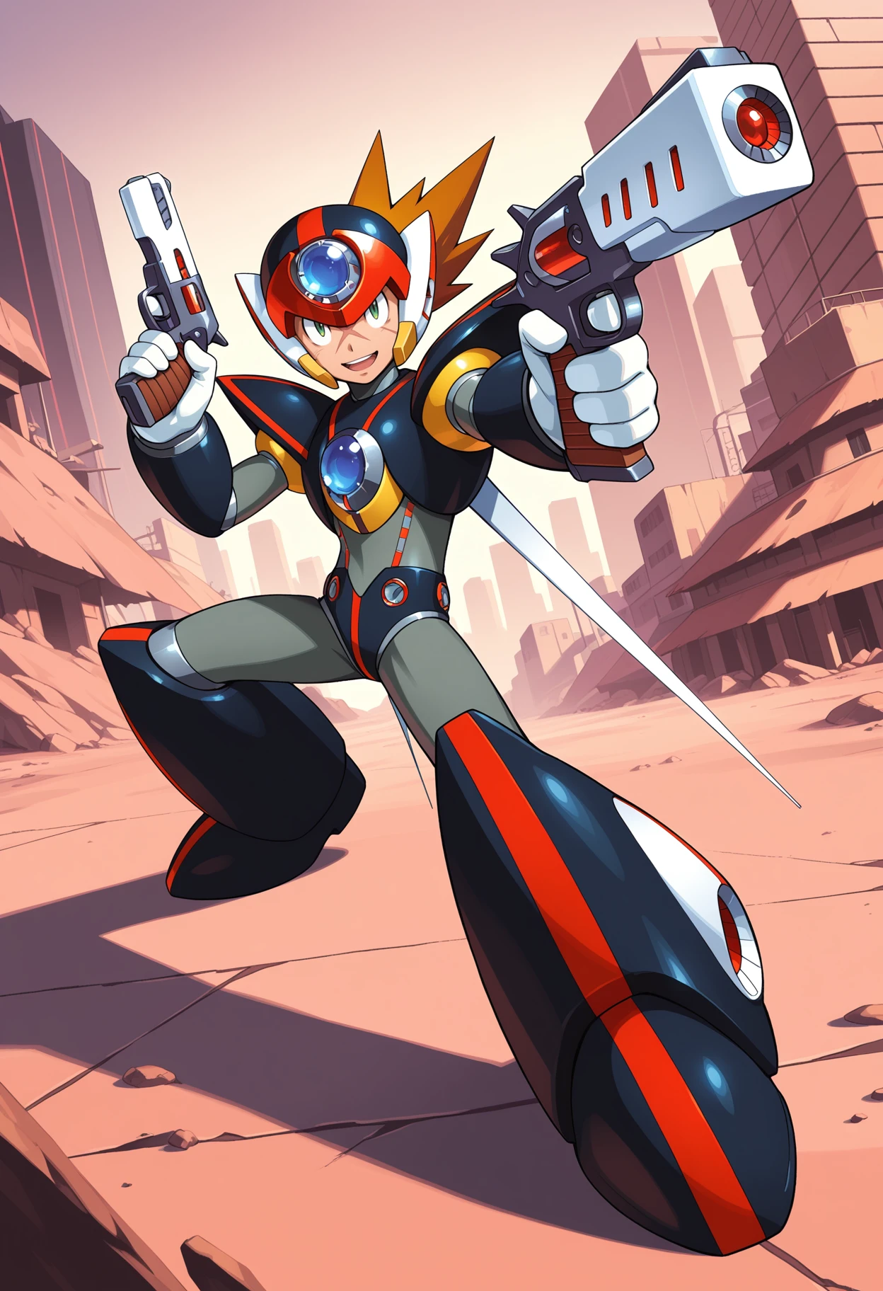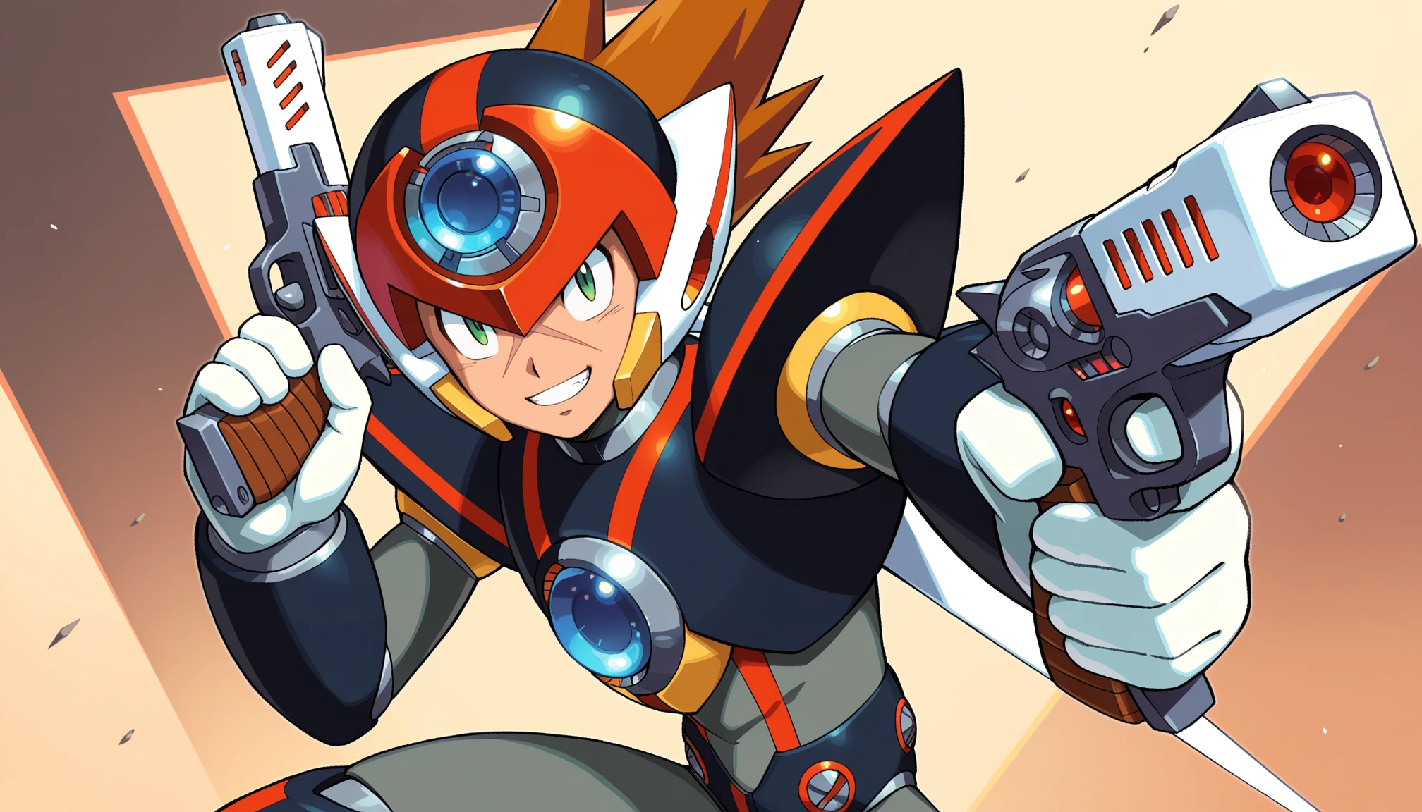 m3gamanax1, holding gun, dual wielding, android, robot, armor, helmet, green eyes, spiked hair, brown hair, forehead jewel, cross scar, scar on face, shoulder armor, white gloves,