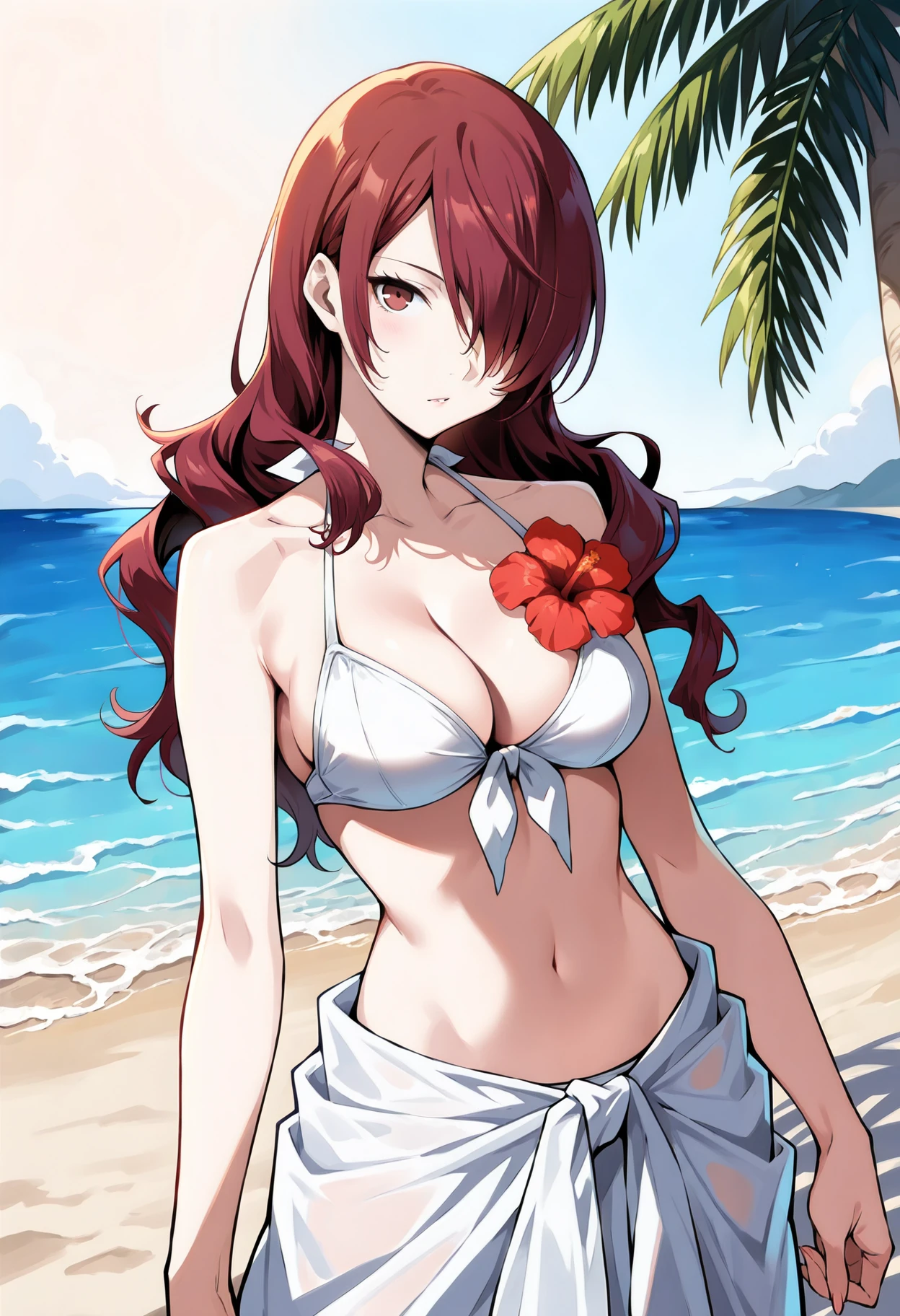 p3mitsuru-swim, swimsuit, bikini top only, white bikini, front-tie bikini top, hibiscus on chest, sarong, white sarong,Mitsuru Kirijo, the scion of the Kirijo family & Empress Social Link in Persona 3.