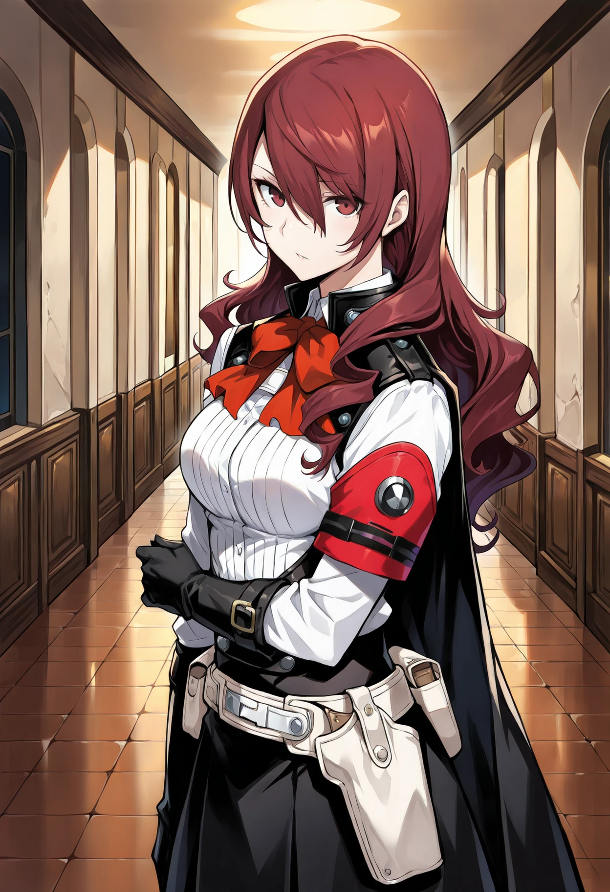 p3mitsuru-sees, gekkoukan high school uniform, red bow, white shirt, armband, holster, belt, white belt, cape, gloves, elbow gloves, black gloves, skirt, black skirt, boots, knee boots, Winter casual: