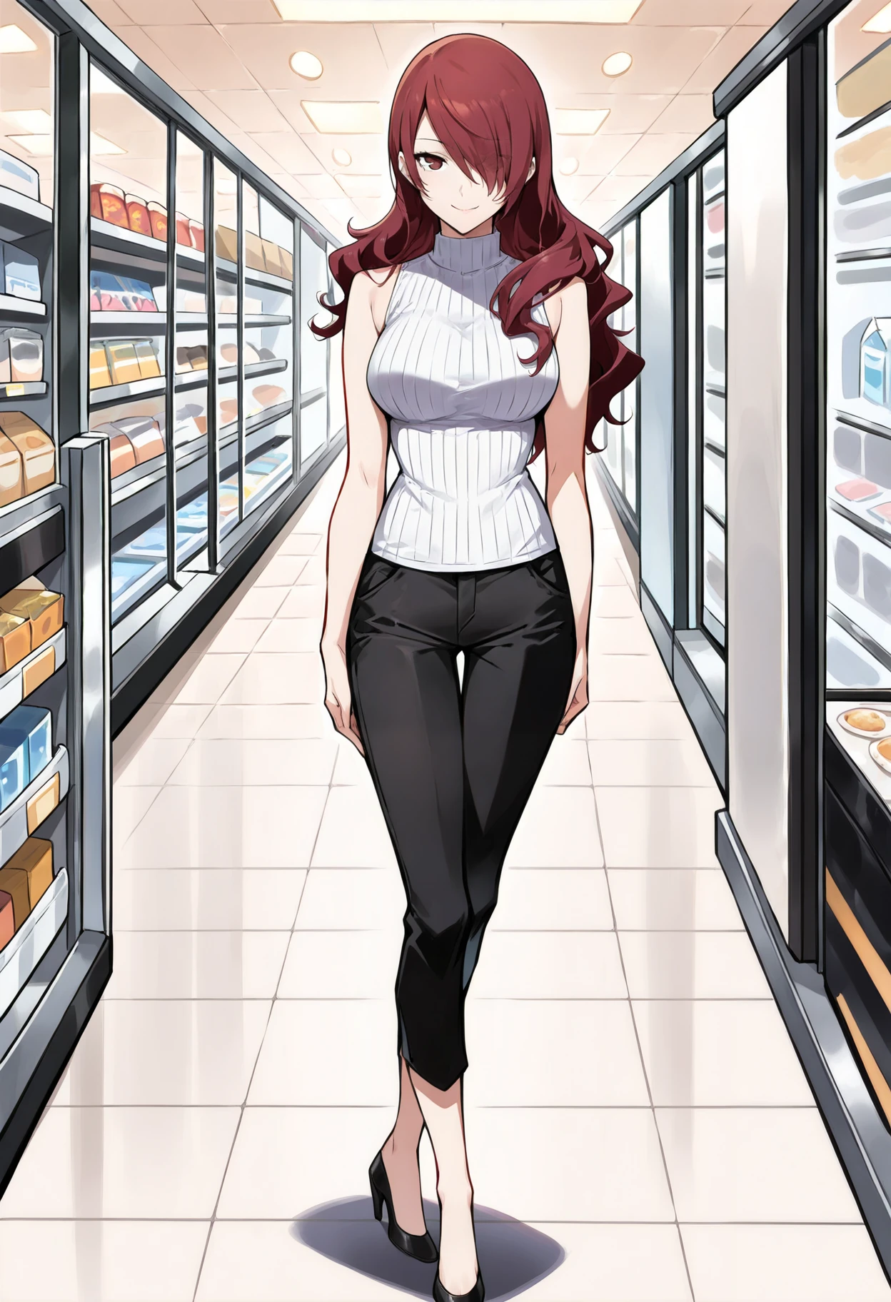 p3mitsuru-sumcas, turtleneck, sleeveless turtleneck, sleeveless, ribbed turtleneck, bare shoulders, pants, black pants, capri pants, casual, high heels
