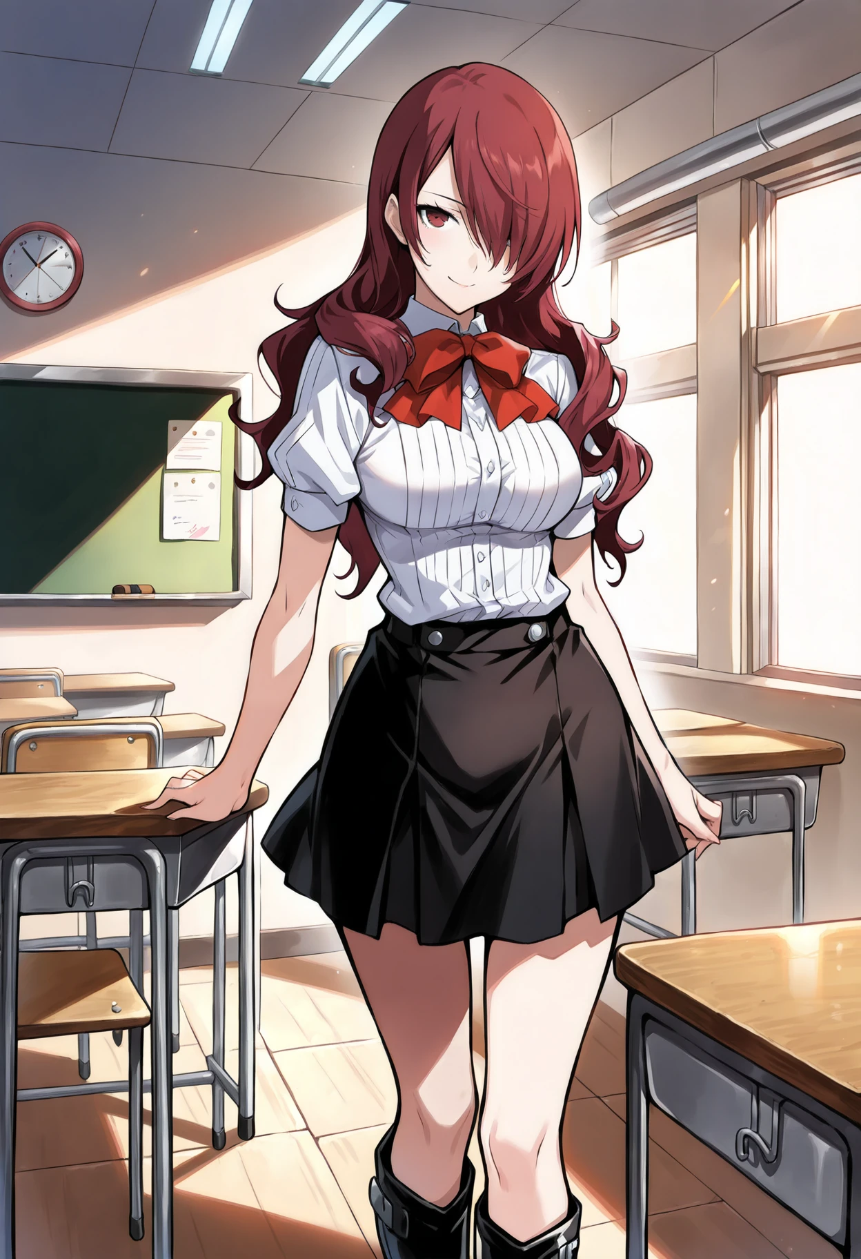 p3mitsuru-winuni, gekkoukan high school uniform, white shirt, long sleeves, puffy sleeves, bowtie, red bowtie, skirt, black skirt, knee boots, black footwear,Summer uniform: