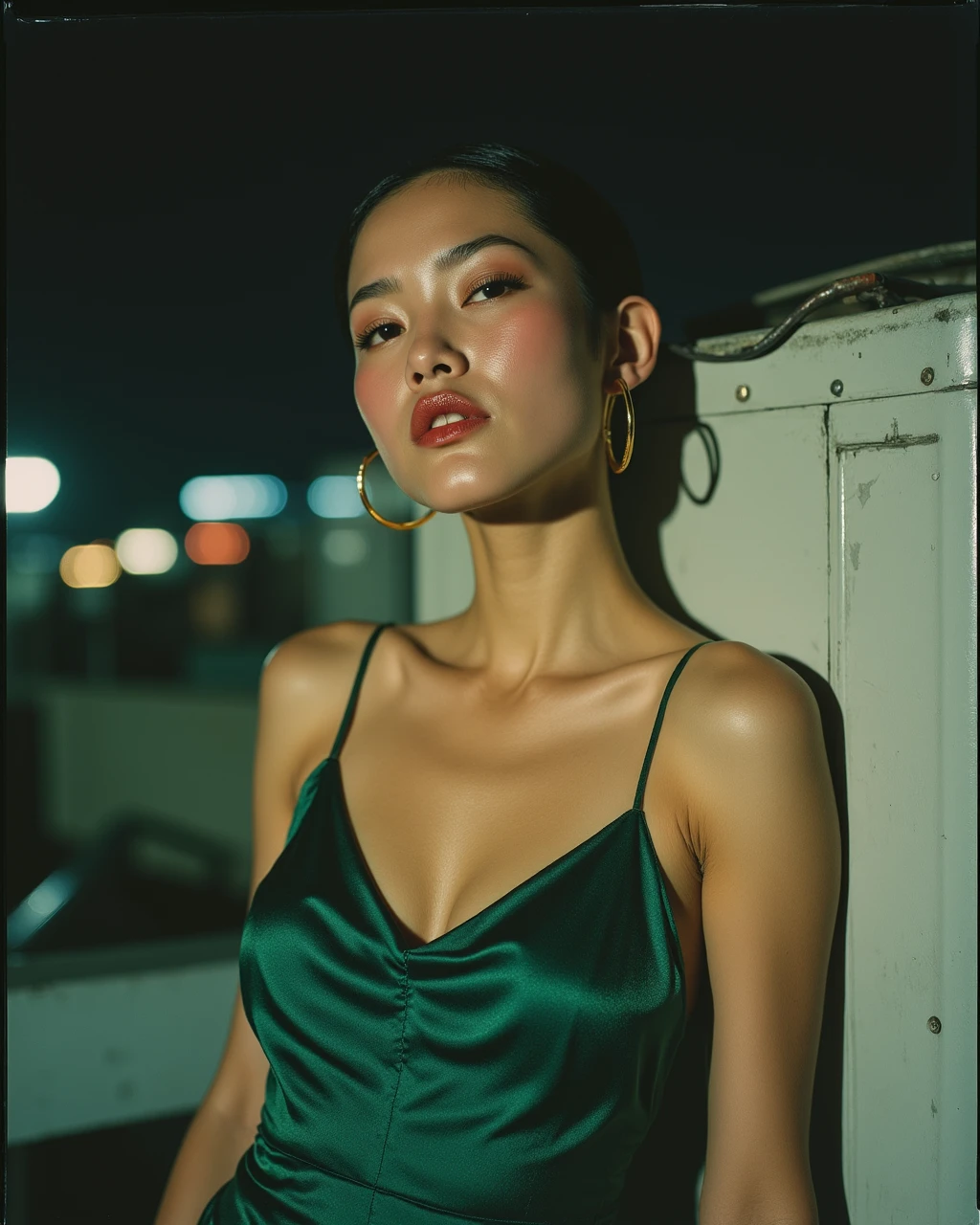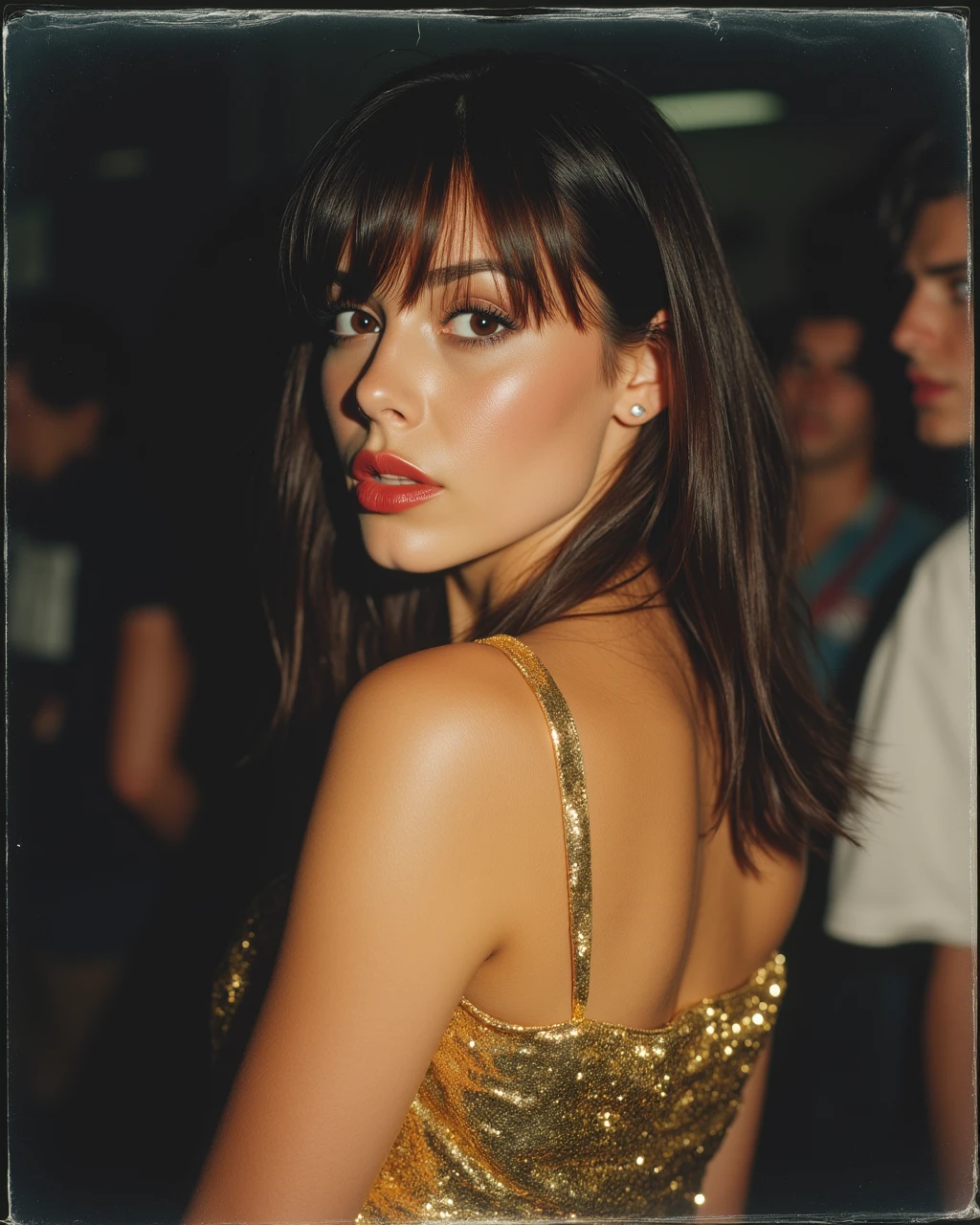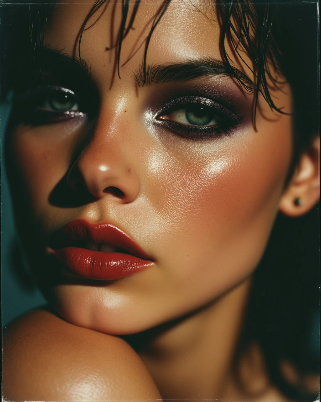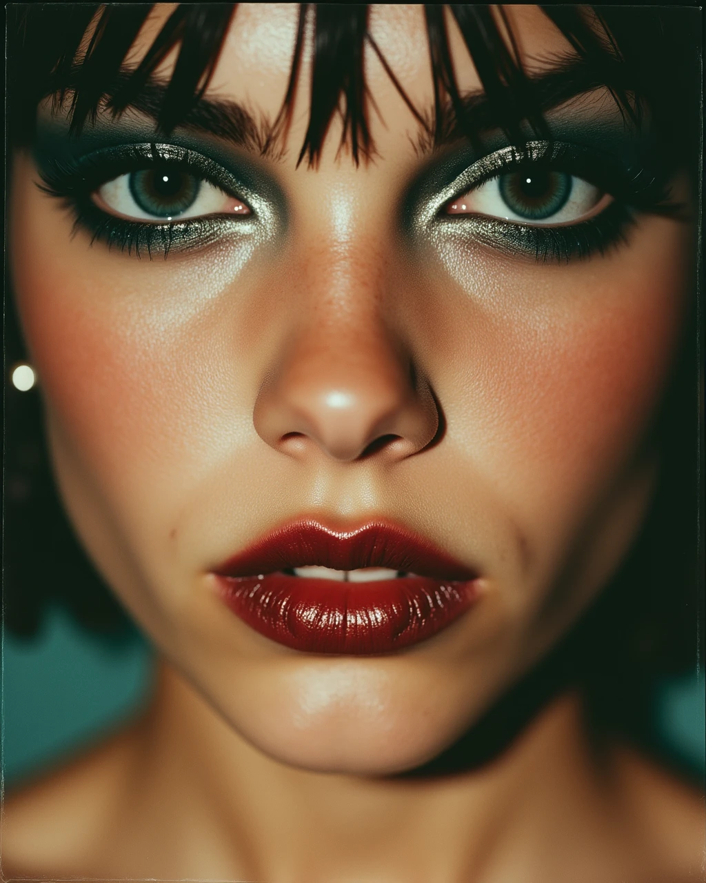 An extreme close-up macro portrait of a 24-year-old woman, heavy metallic eyeshadow, lux3 style. Her skin is glistening with a light sheen of sweat, visible pores and fine texture. Hard direct camera flash creating sharp shadows and bright highlights on her cheekbones. Deep red glossy lips with a slight blur at the edges. 35mm film grain, raw found-photo aesthetic.⚙️ Technical Stuff