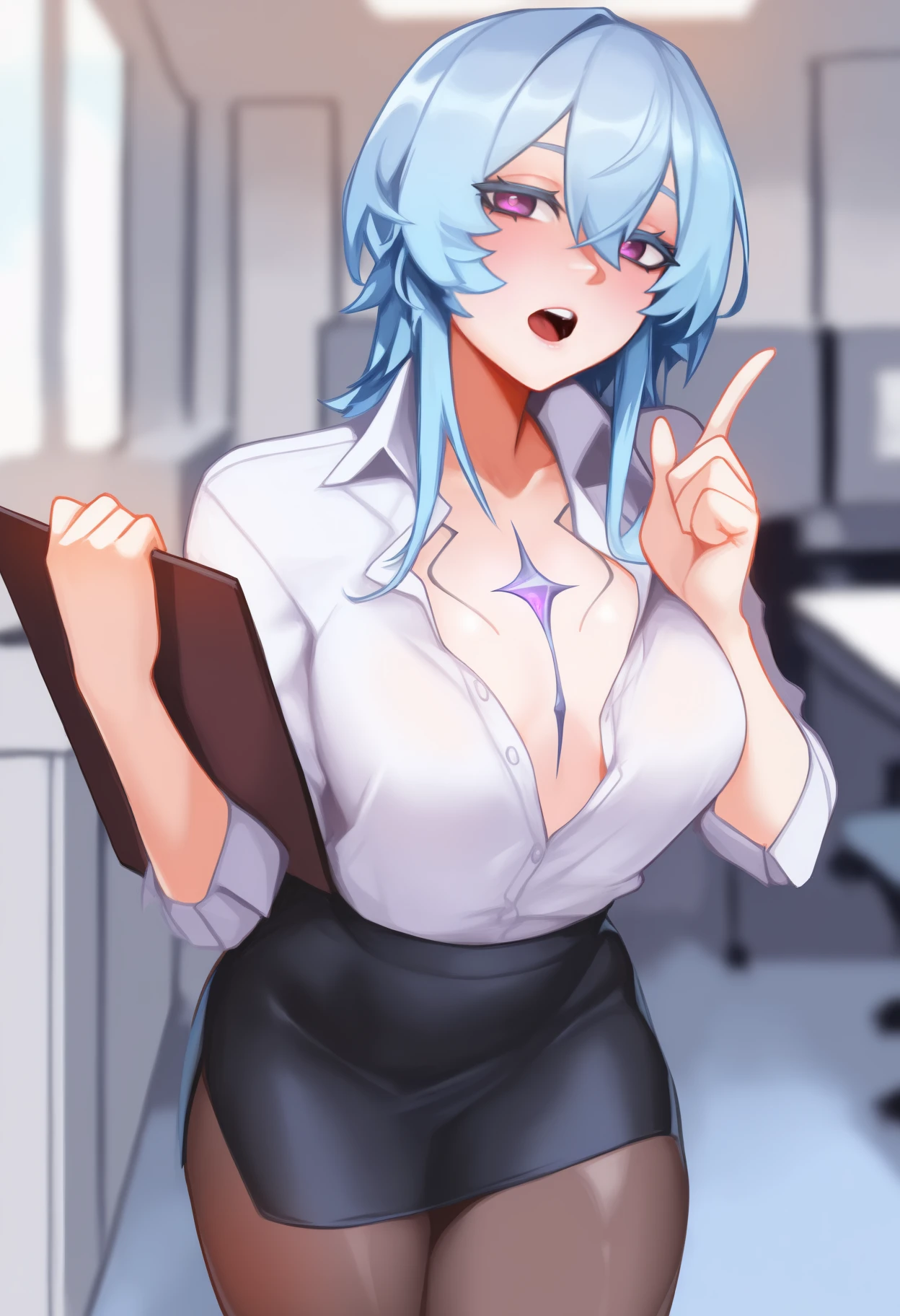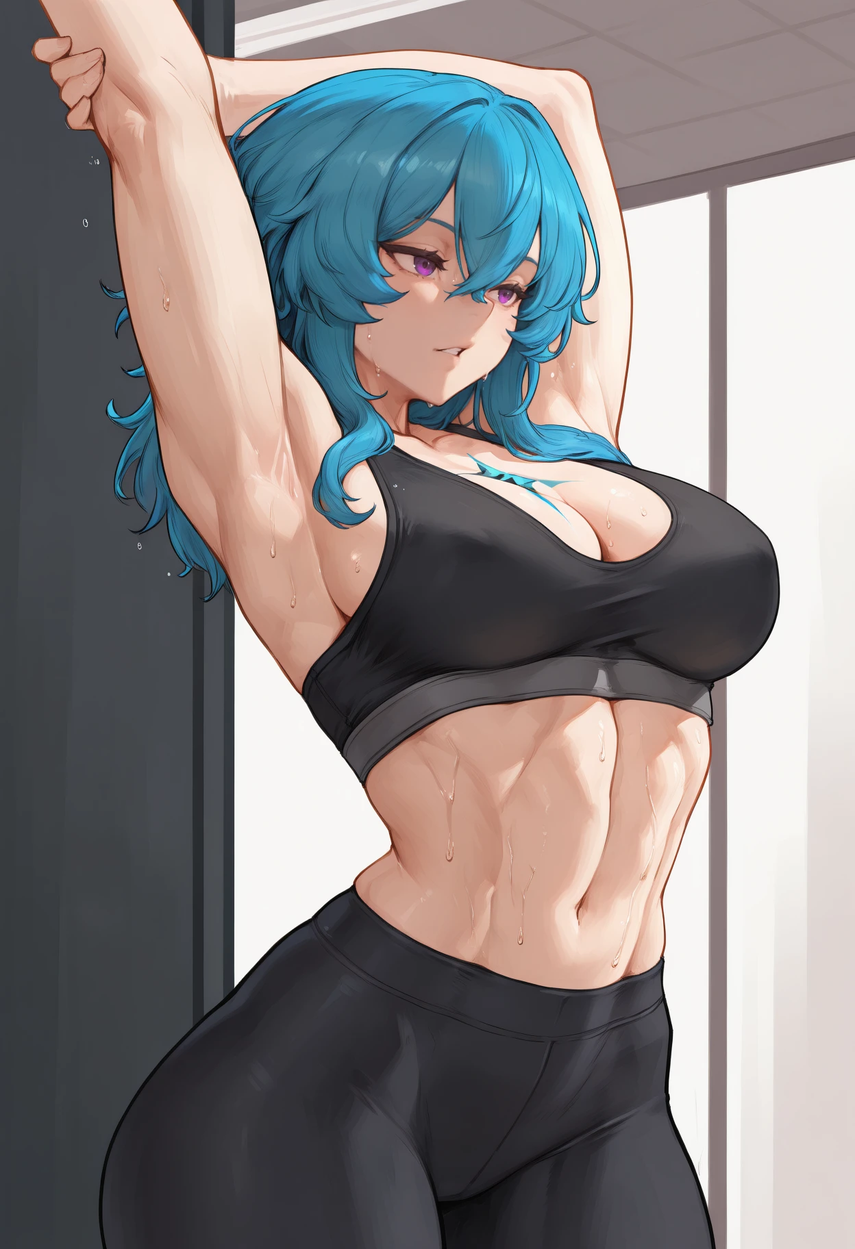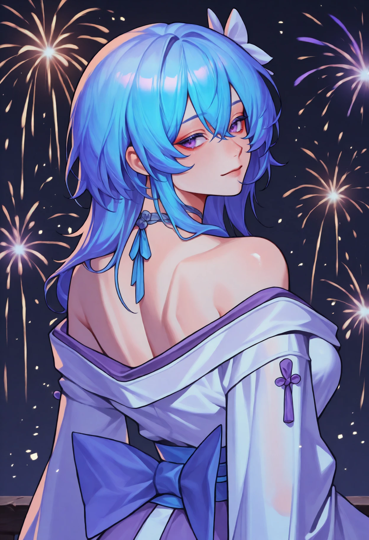 Trigger + Appearance: sh0rekeeper, chest tattoo, long hair, blue hair, hair between eyes, purple eyes
