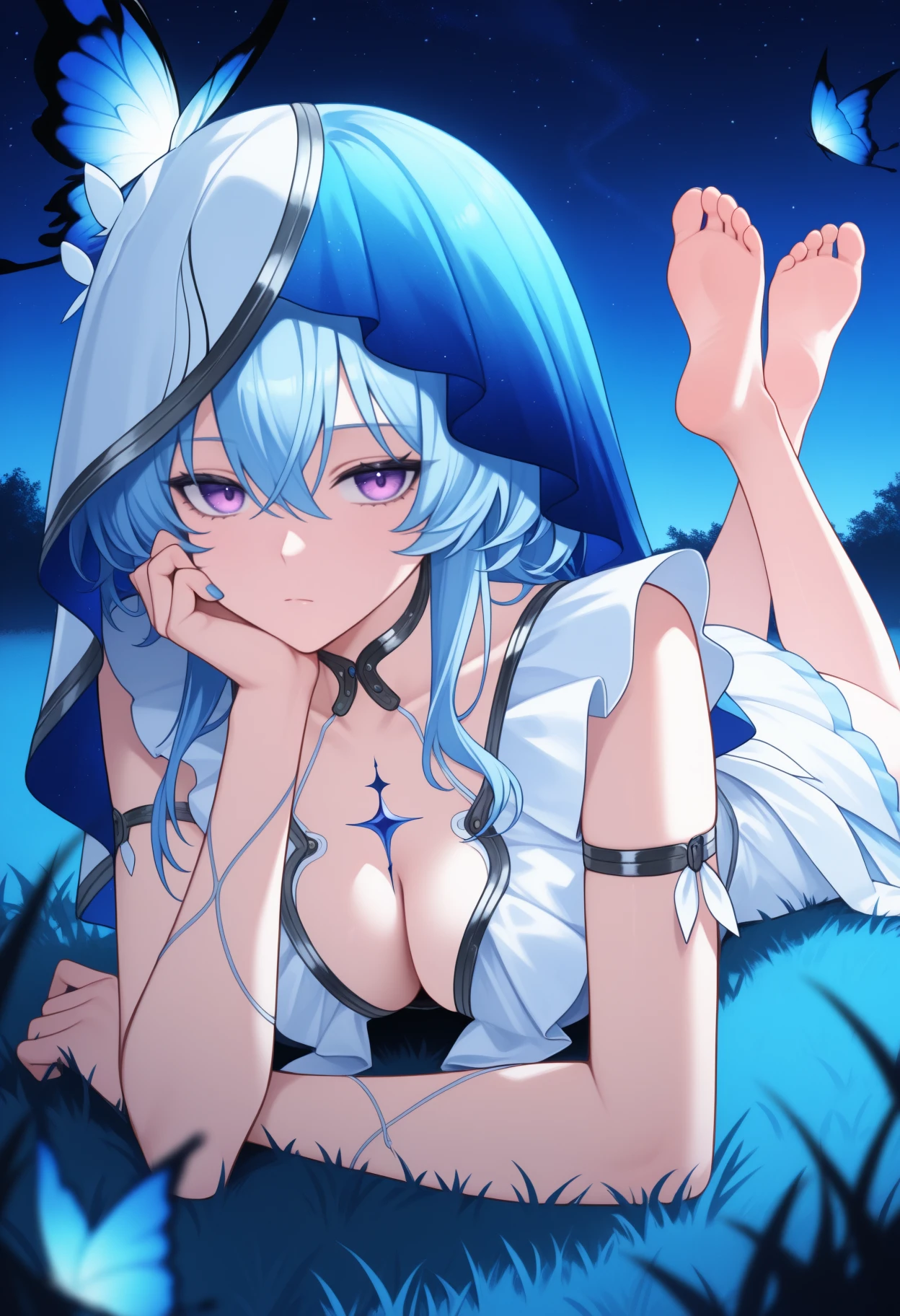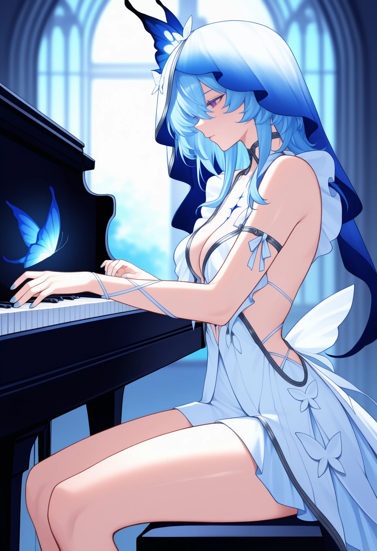 Default Outfit: white veil, white dress, sleeveless dress, arm strap, arm ribbon, thighs, jewelry, nail polish, blue nails, bare shoulders, cleavage