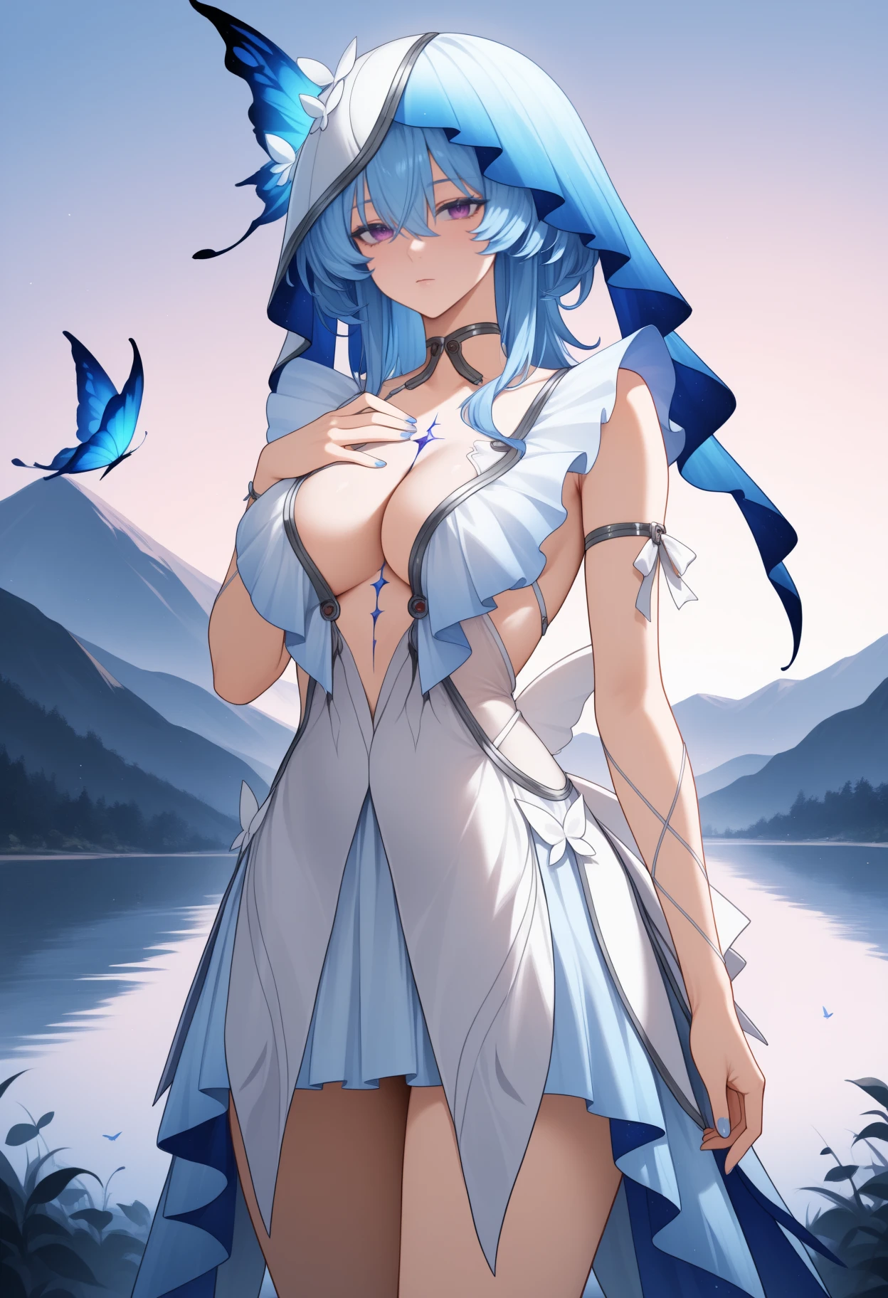 white veil, white dress, sleeveless dress, arm strap, arm ribbon, thighs, jewelry, nail polish, blue nails, bare shoulders, cleavage