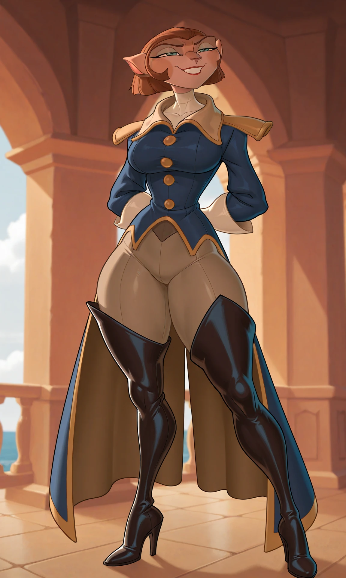 1girll, coat, female, green eyes, narrowed eyes, high heeled thigh boots