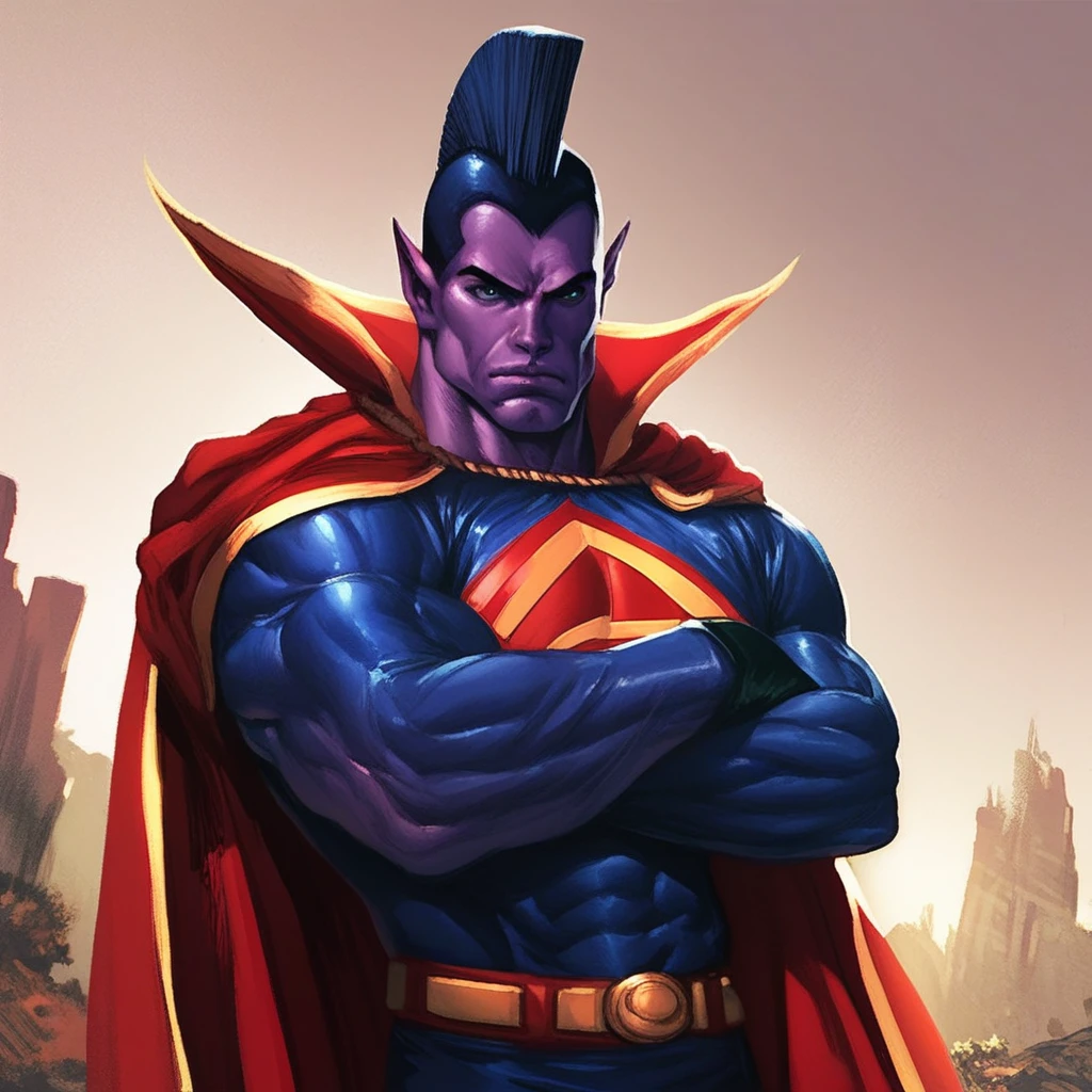triggers: gladiator, purple skin, colored skin, pointy ears, superhero, mohawk, cape, bodysuit, belt, gloves, glowing red eyes