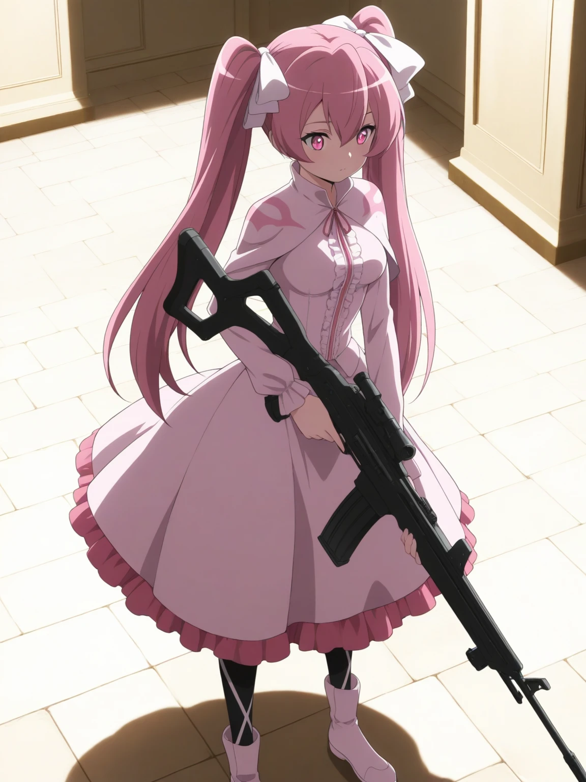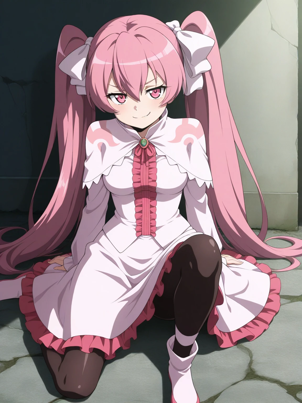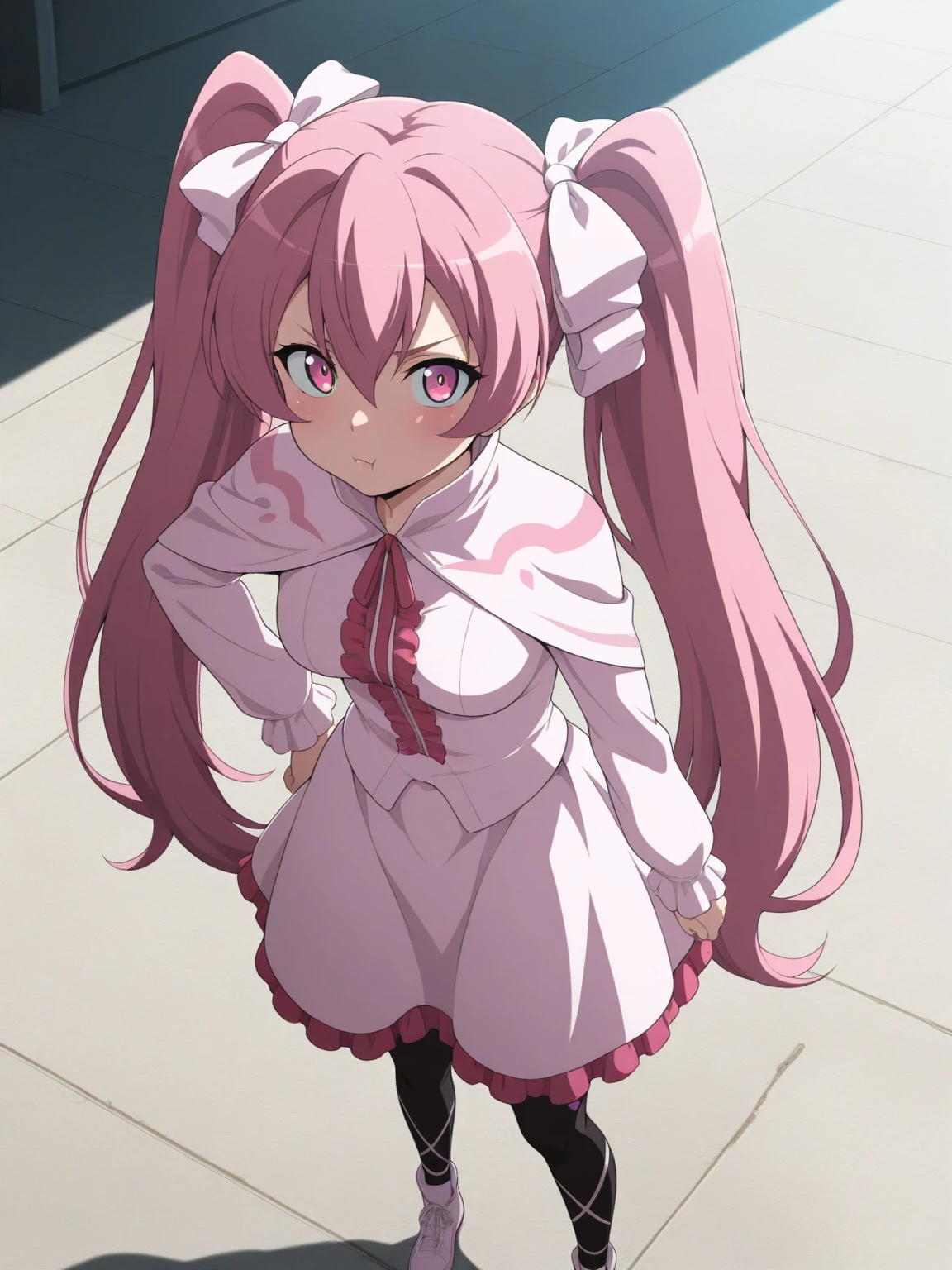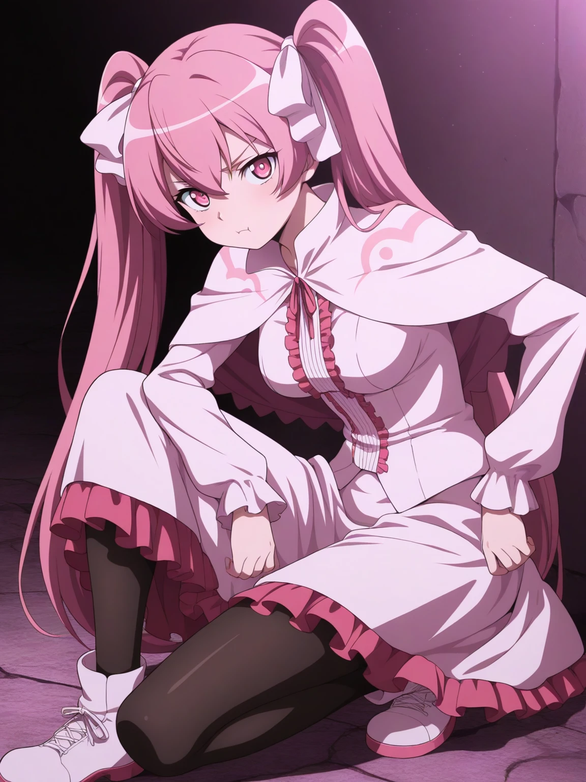 • Clothes: pink dress, pink capelet, long sleeves, two-tone leggings, black pink leggings, shoes,