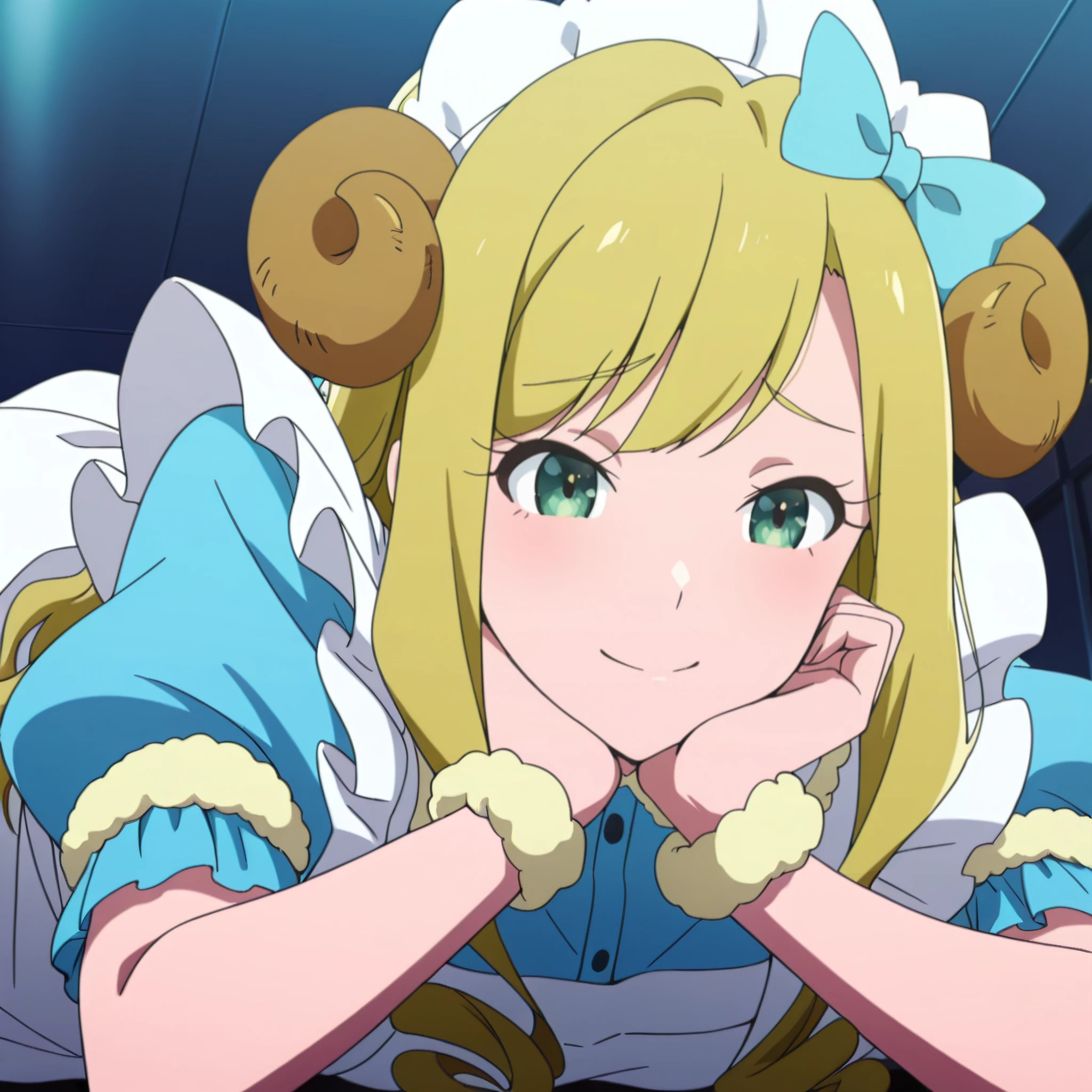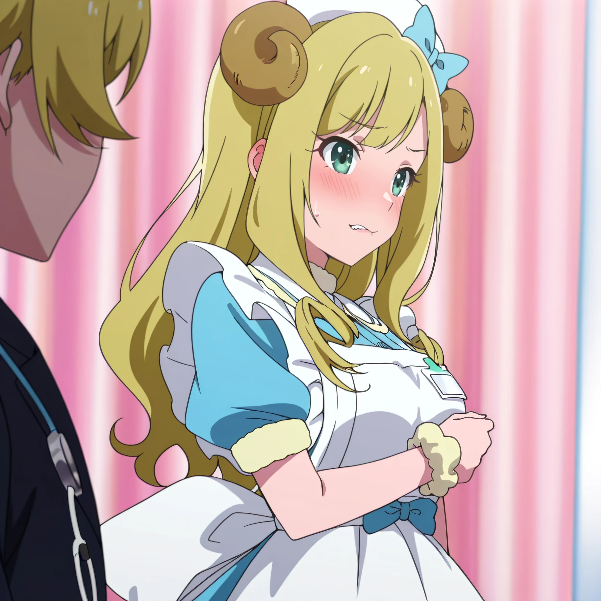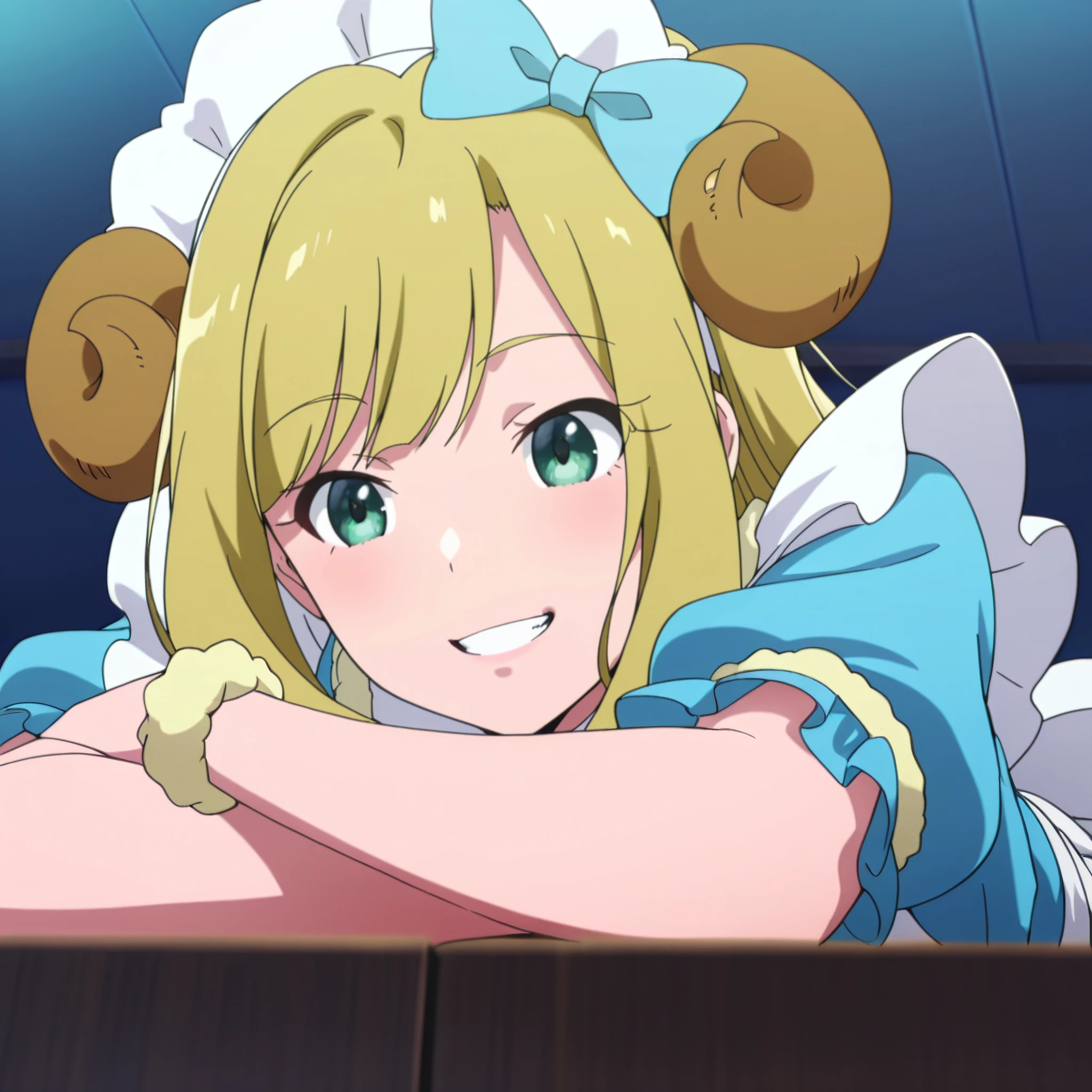 AMWKaoruko, blonde hair, long hair, bow, blue bow, bangs, green eyes, eyebrows visible through hair, scrunchie, wrist scrunchie, hair bow, animal ears, blue ribbon, hair ornament, blue scrunchie, swept bangs, horns, sheep horns,