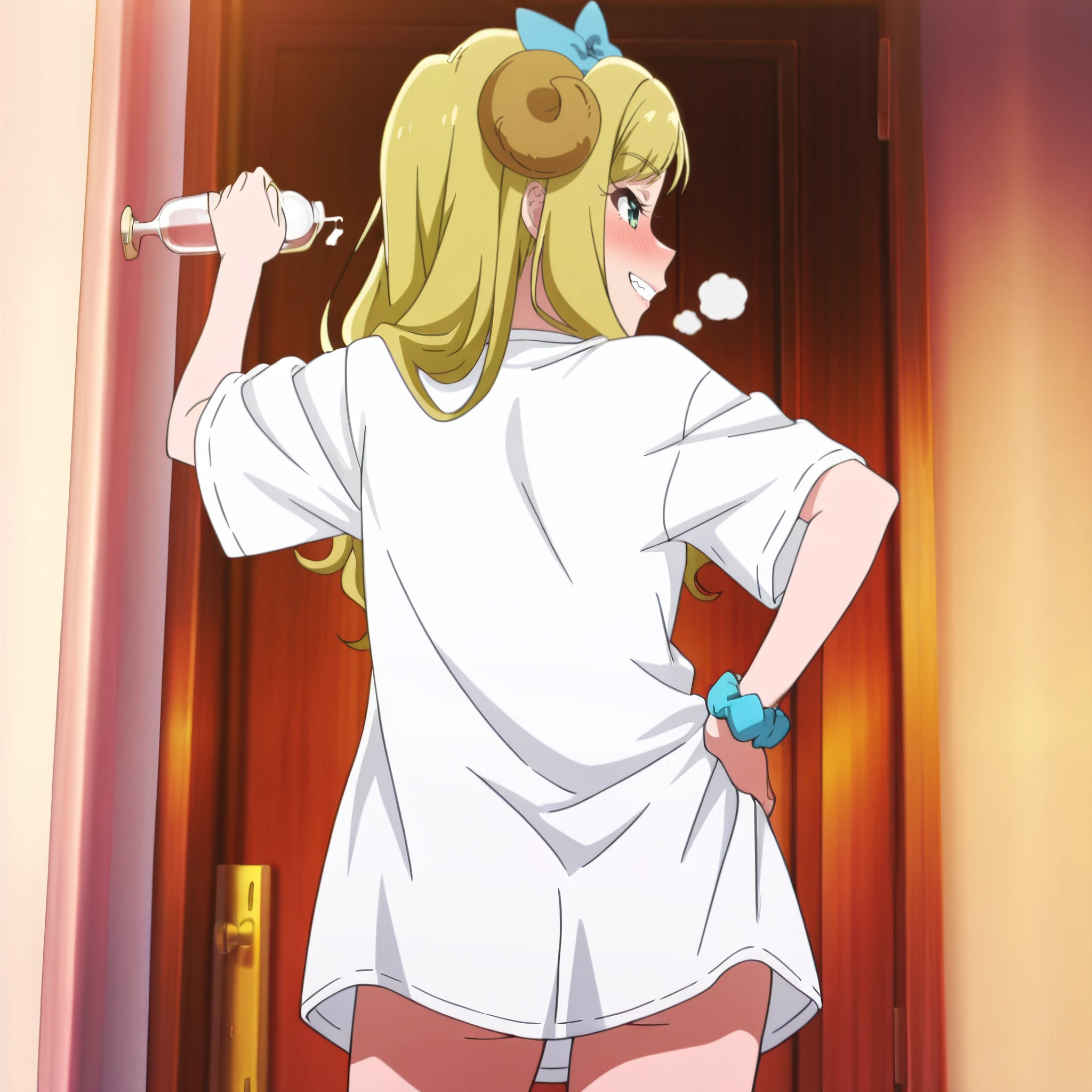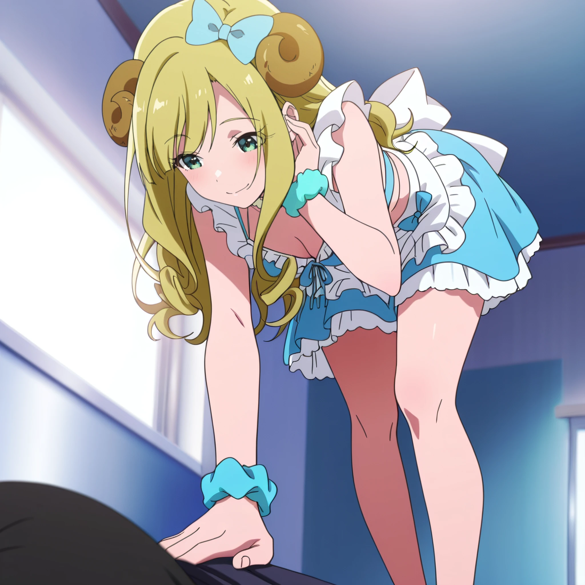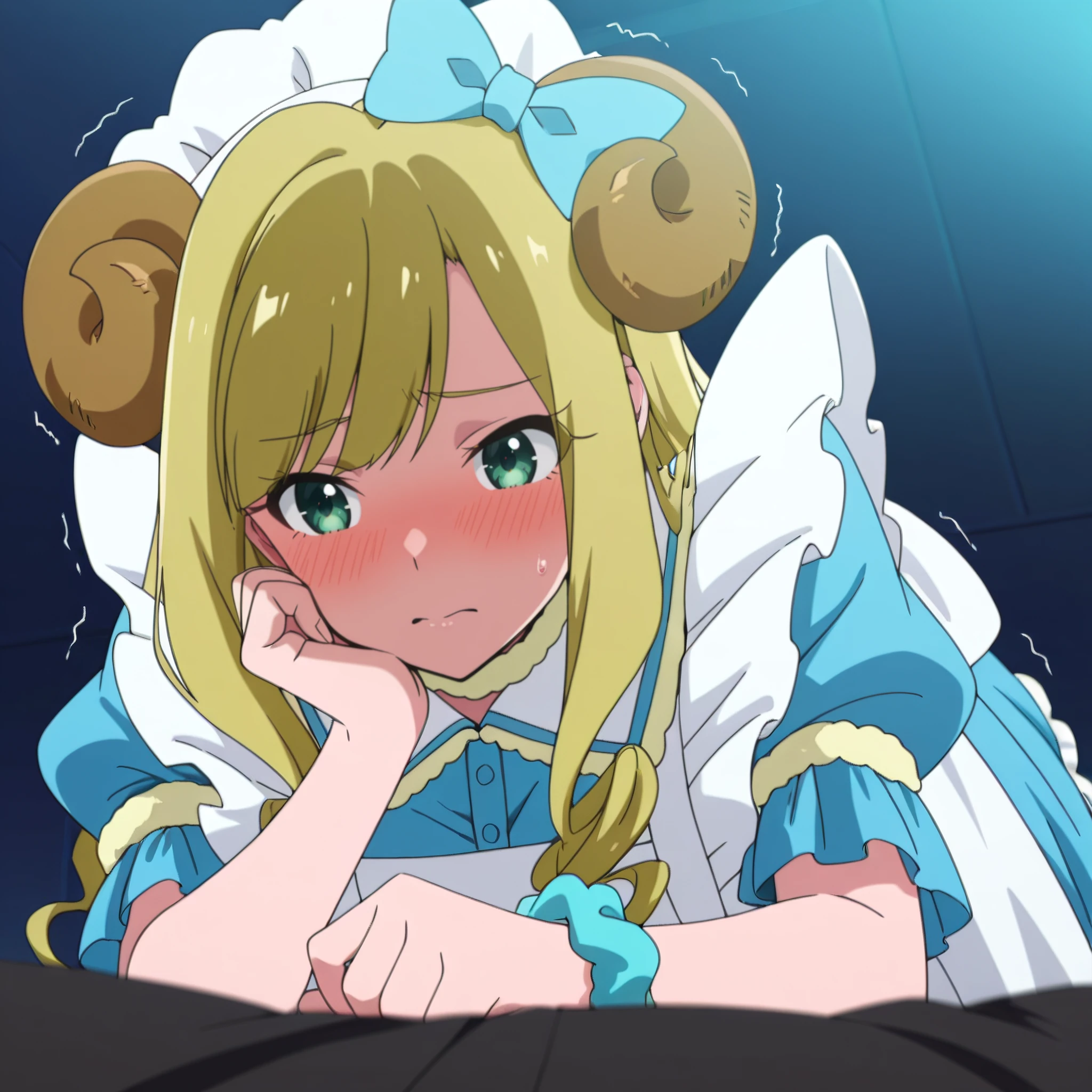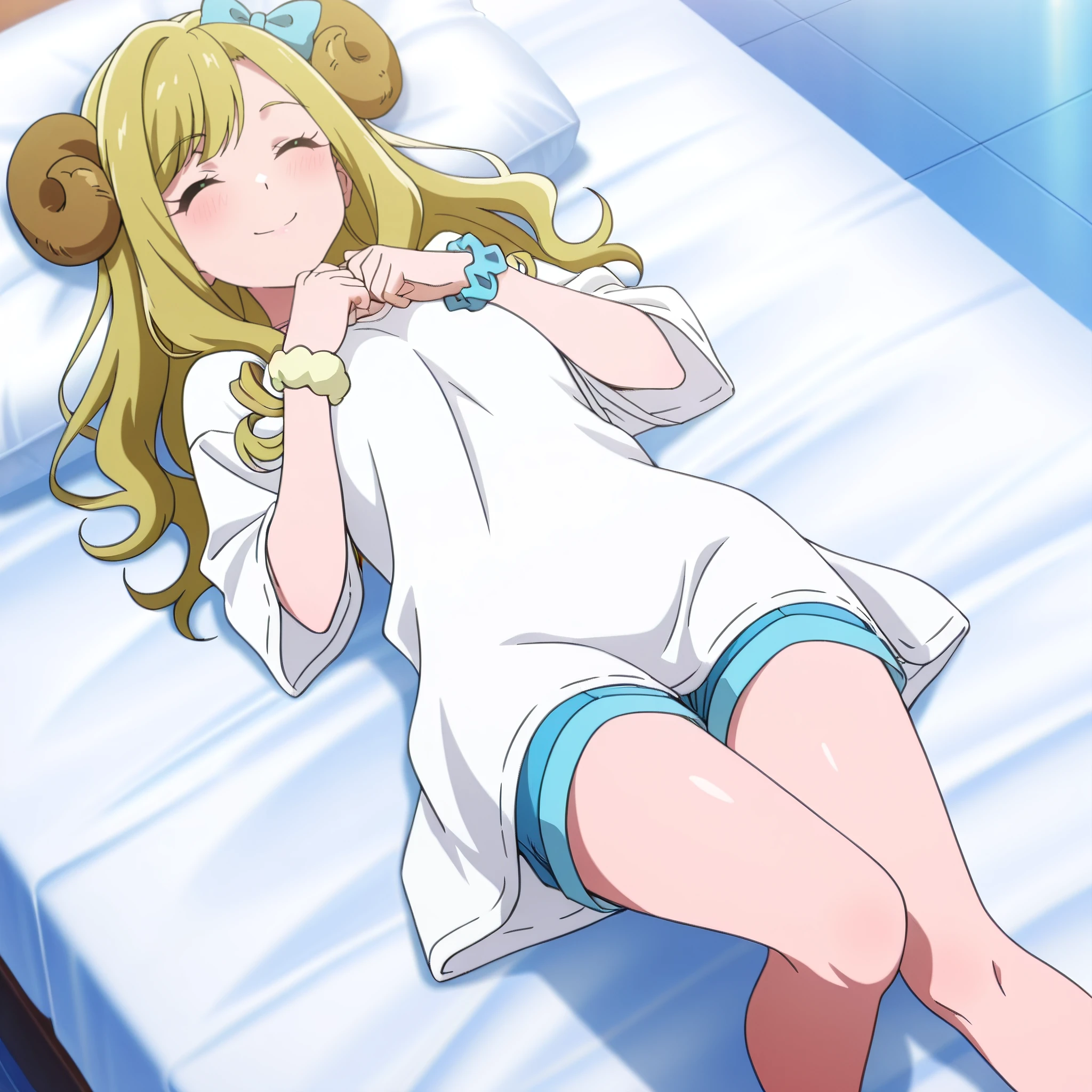 AMWKaoruko, blonde hair, long hair, bow, blue bow, bangs, green eyes, eyebrows visible through hair, scrunchie, wrist scrunchie, hair bow, animal ears, blue ribbon, hair ornament, blue scrunchie, swept bangs, horns, sheep horns,