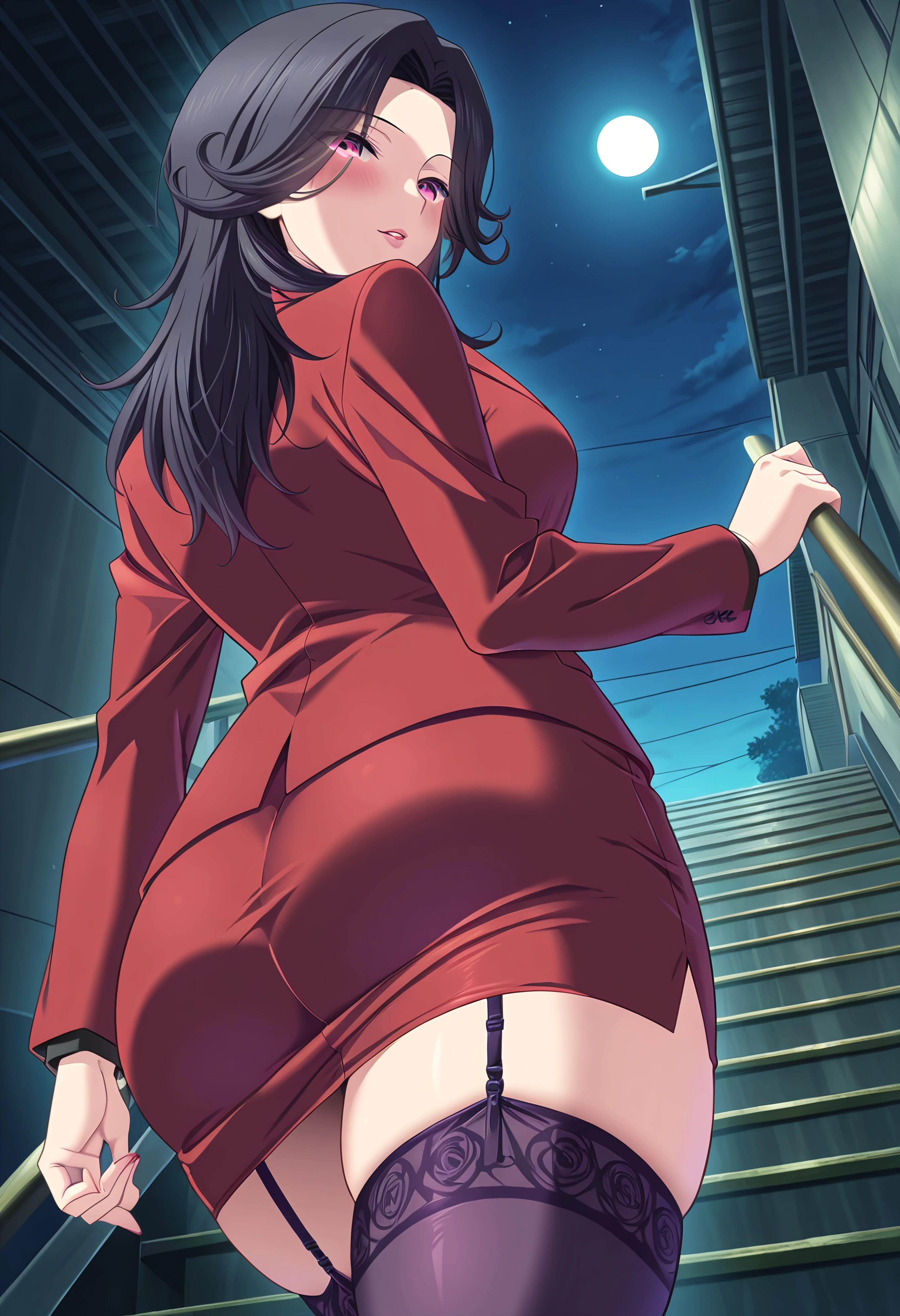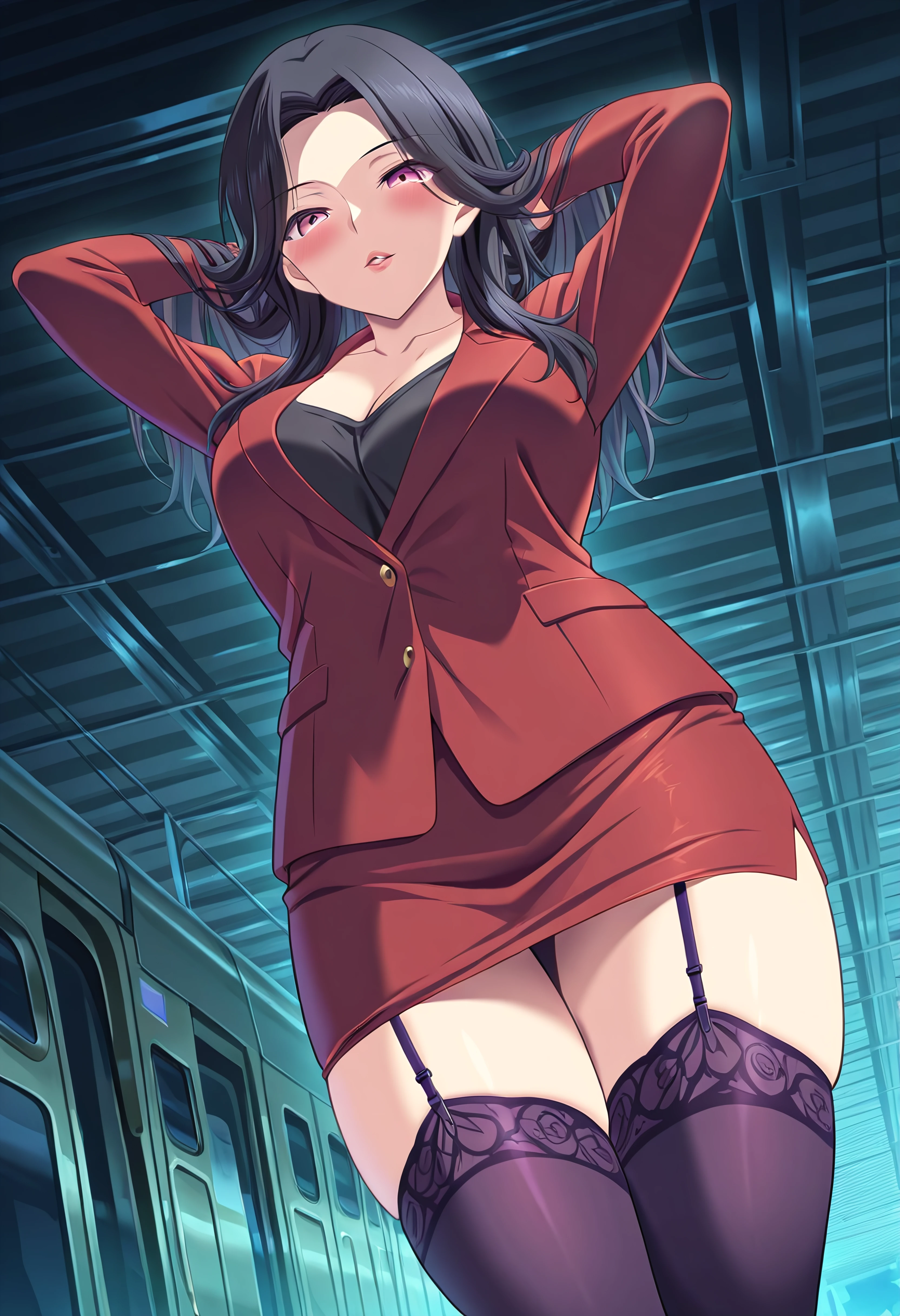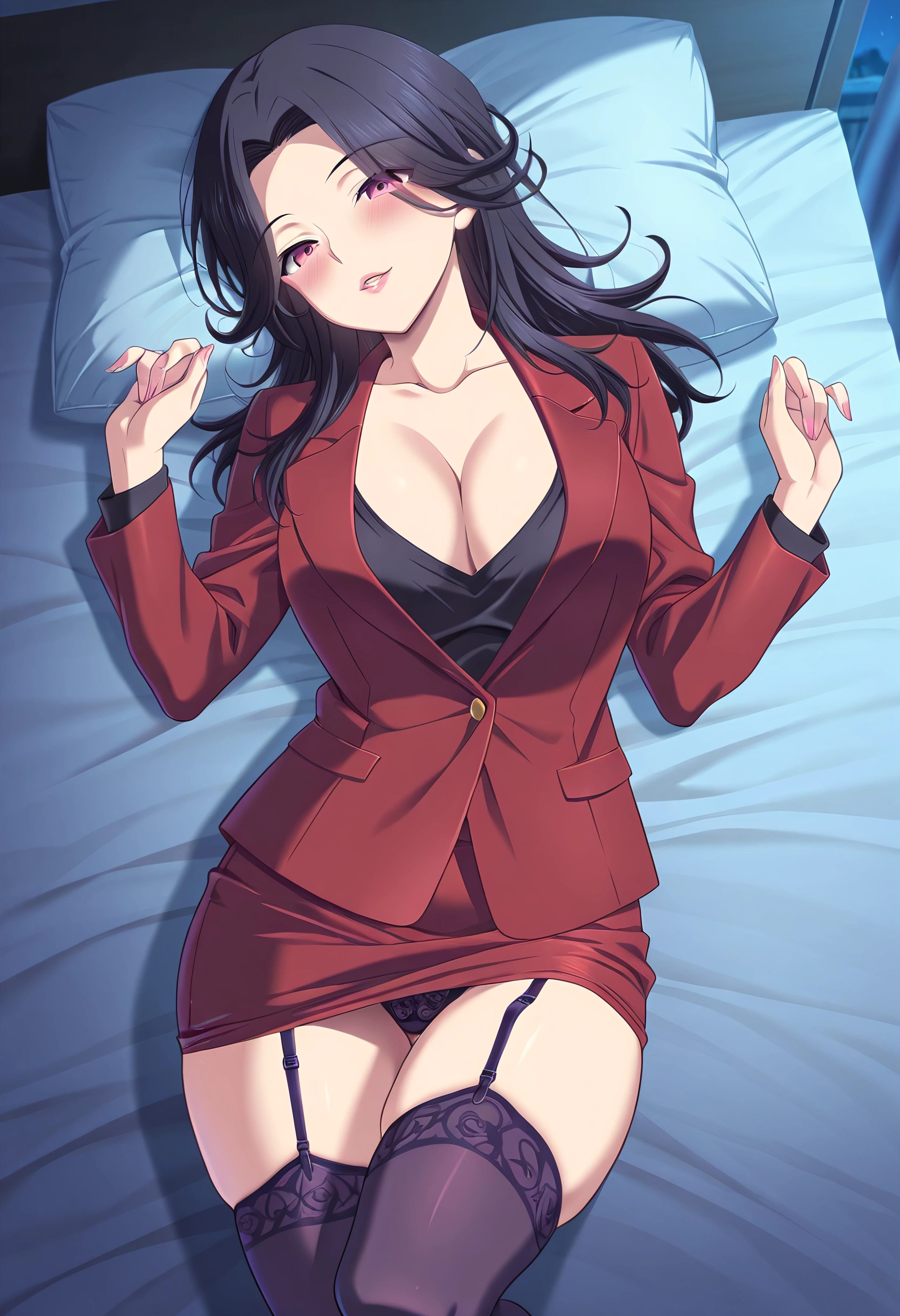KusumiRenka, 1girl, mature female, black hair, long hair, pink nails, pink eyes, red skirt suit, pencil skirt, black shirt, dark black purple thighhighs, garter straps, panties