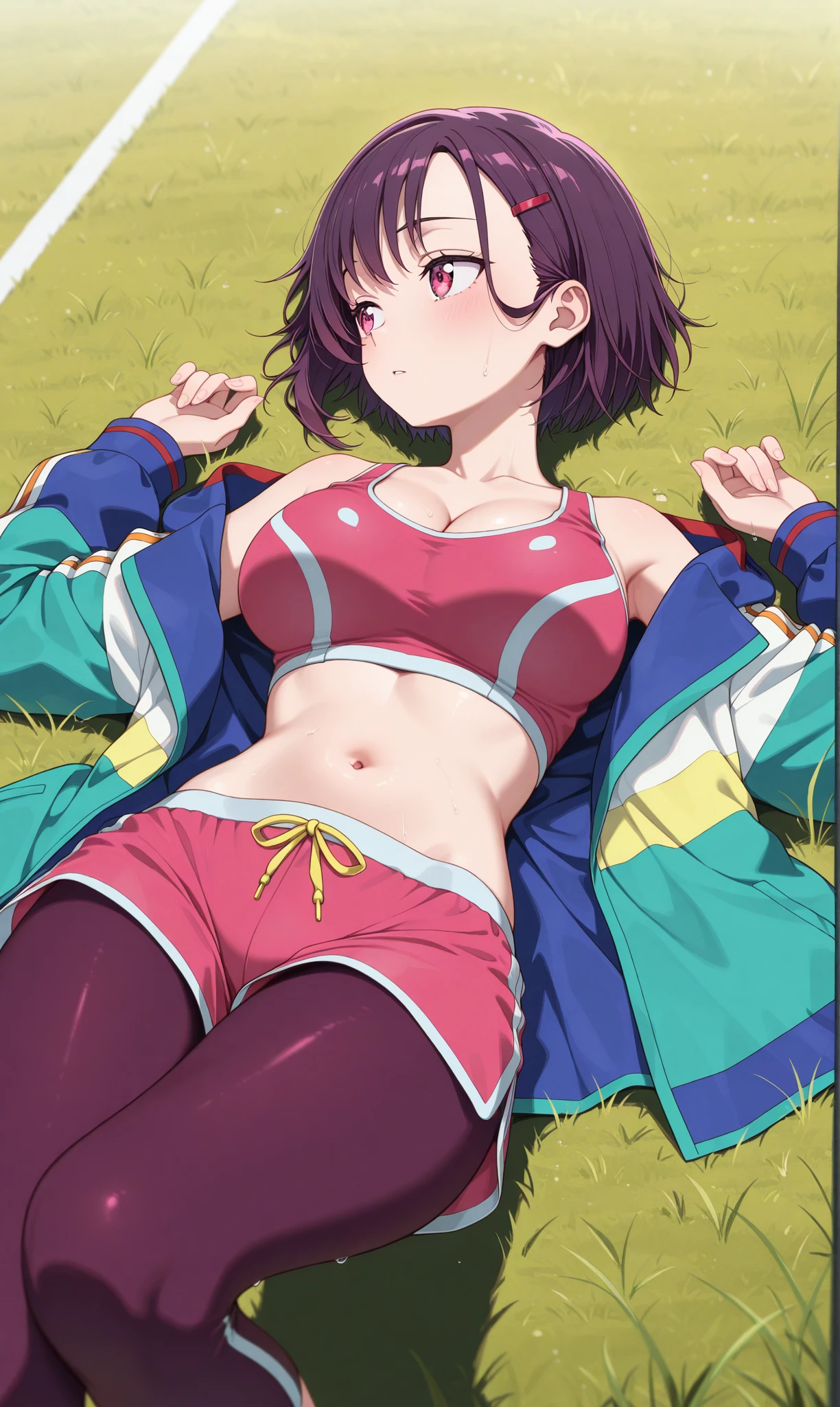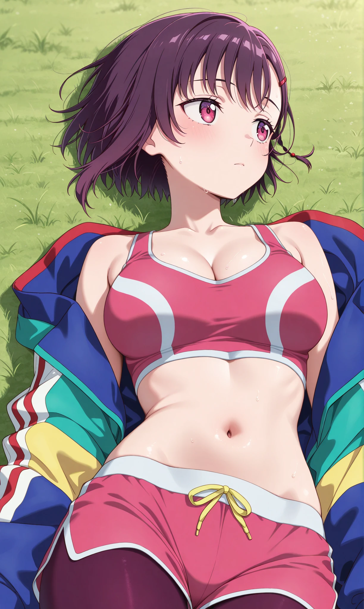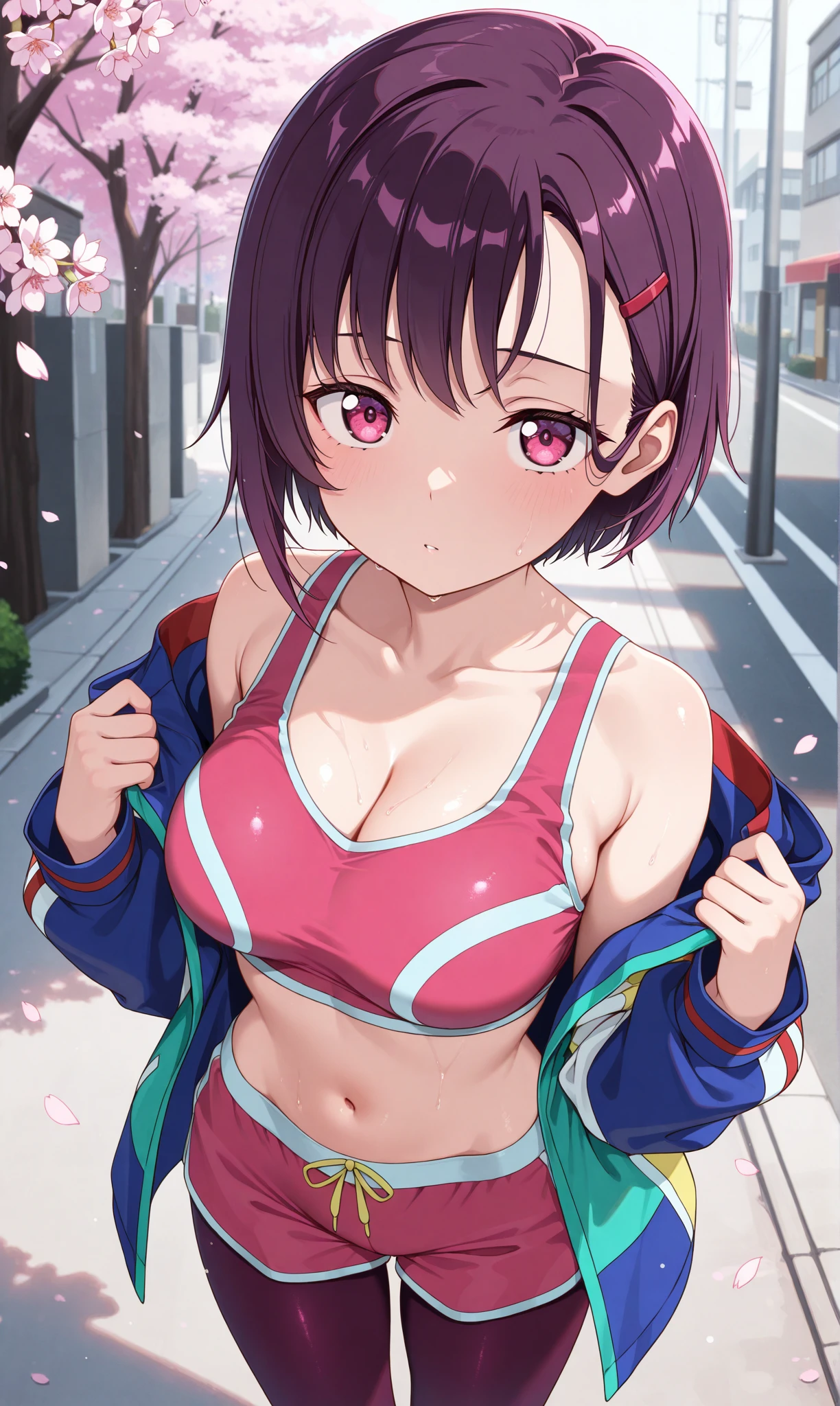 pink sports bra, crop top, open jacket, blue jacket, green jacket, multicolored jacket, white jacket, long sleeves, off shoulder, navel, pink shorts, sportswear, open clothes, leggings, sneakersDescription