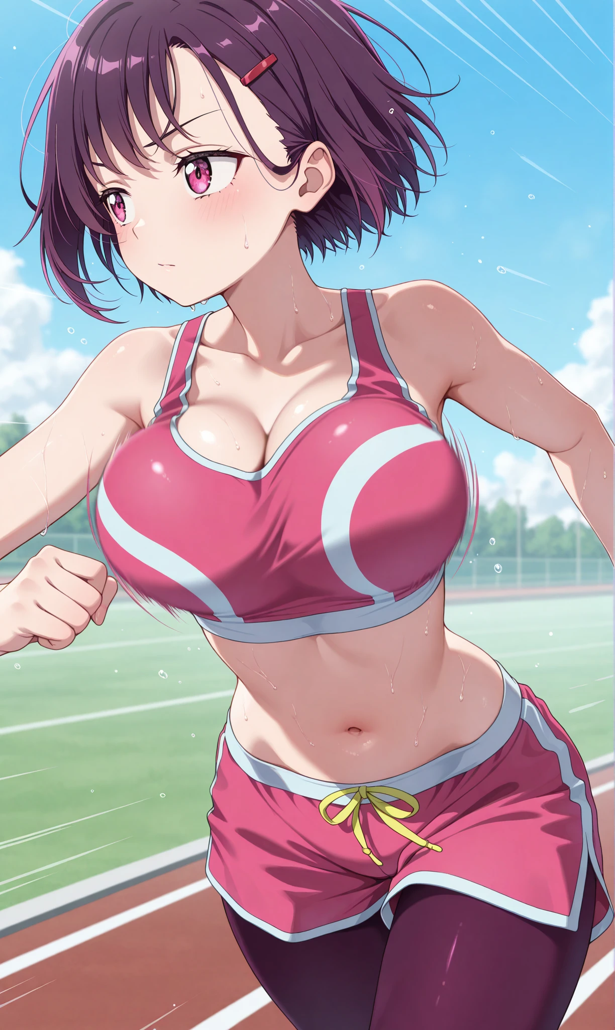 mikazuki shizuka, purple hair, pink eyes, hair ornament, hairclip