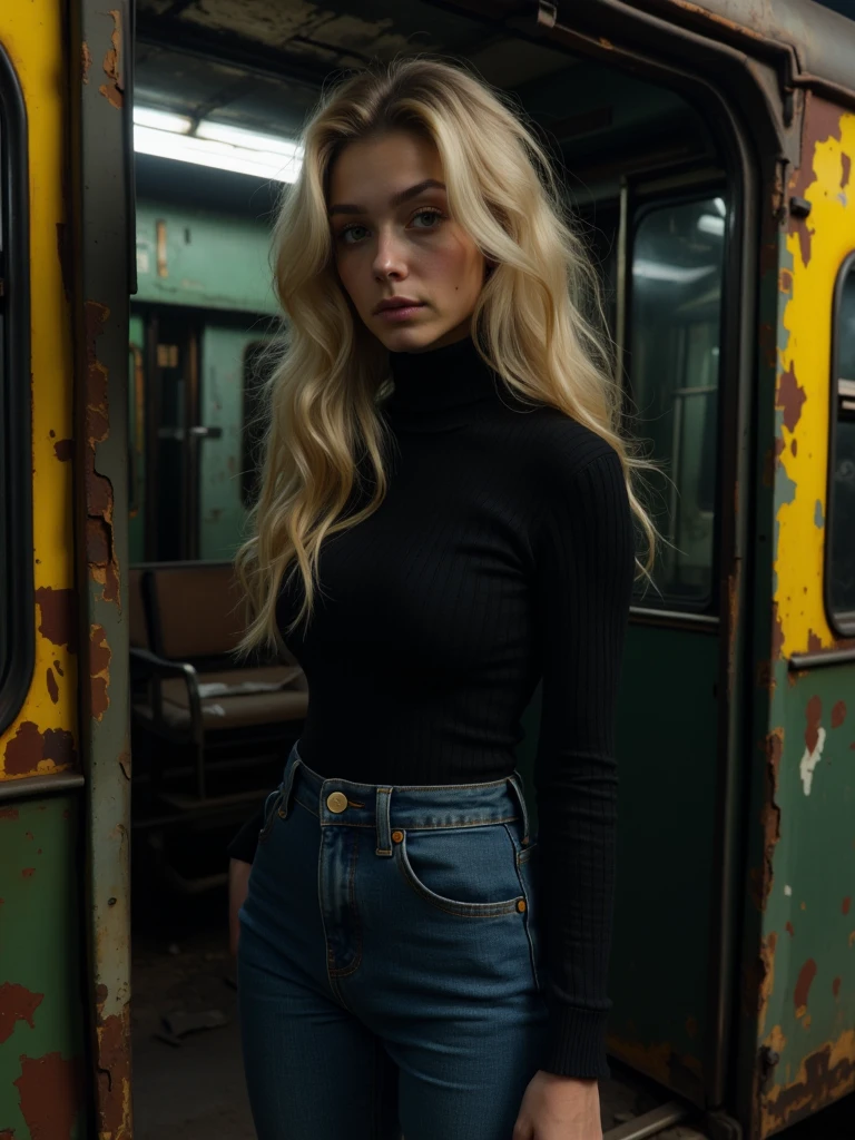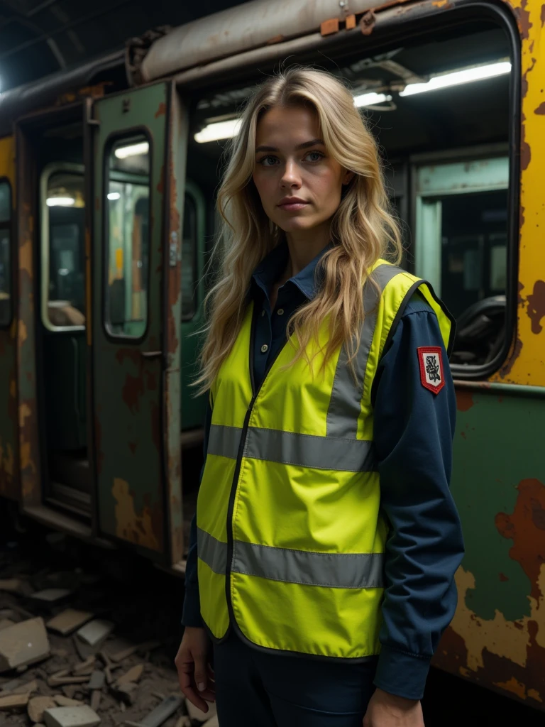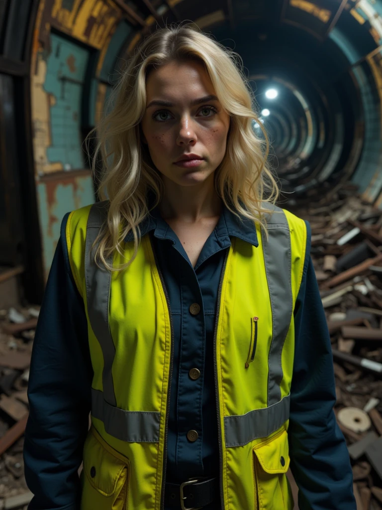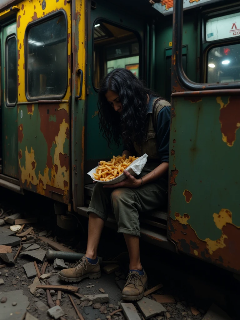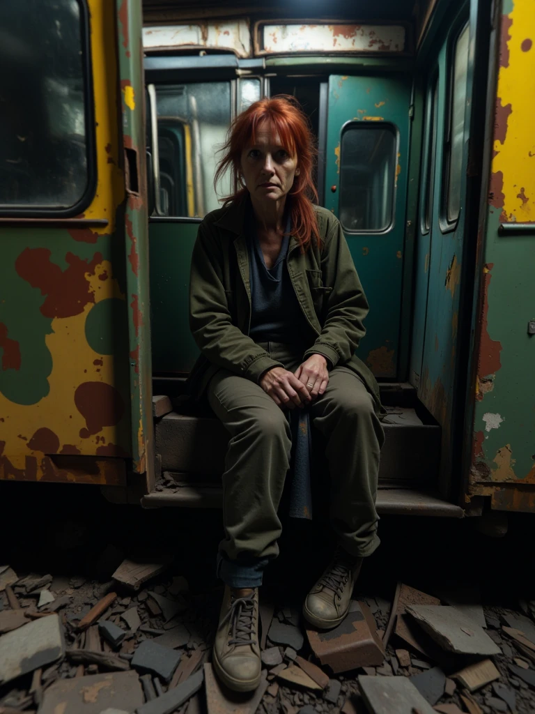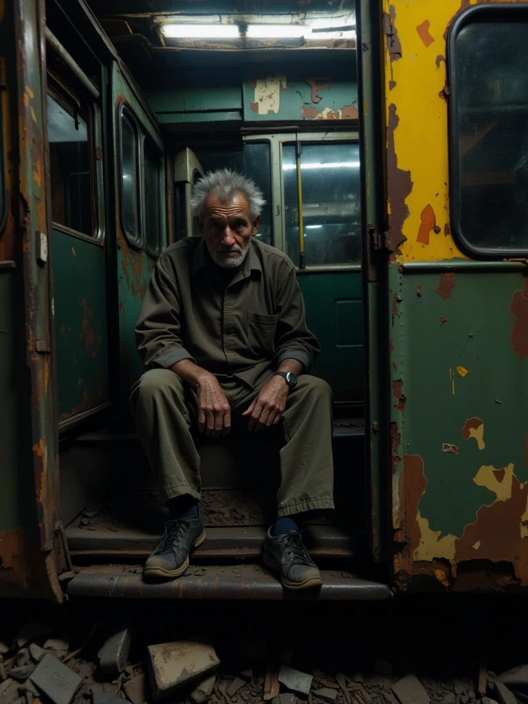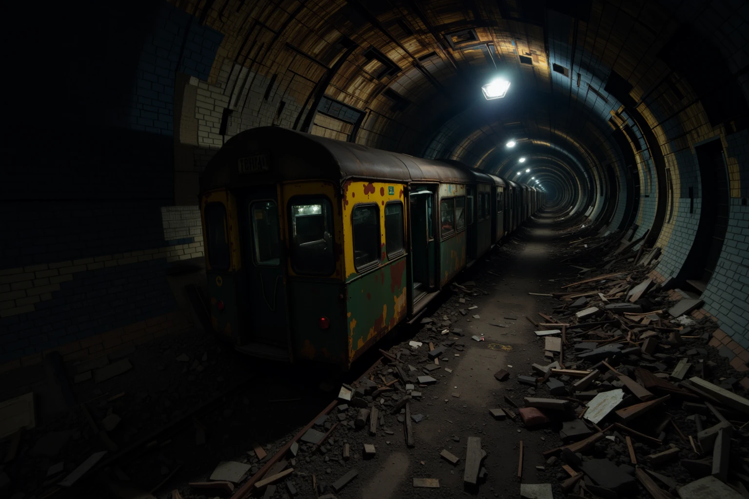 The scene is a dilapidated subway tunnel, captured in a realistic and gritty style, conveying a somber and eerie atmosphere of abandonment and decay. The tunnel, constructed from rough concrete and worn brick, is illuminated by intermittent, weak light sources that barely penetrate the pervasive darkness, casting long, stark shadows. An old, rusting subway train, consisting of multiple cars, occupies the left side of the track, its once vibrant yellow paint now faded and peeled, revealing layers of corrosion and neglect. Its windows are shattered, and doors hang ajar or are missing entirely, exposing the empty, decaying interiors. The track bed is completely obscured by a vast expanse of rubble and debris, including fractured concrete slabs, twisted metal, and miscellaneous detritus, which extends across the entire width of the tunnel floor. This chaotic accumulation of destruction suggests a catastrophic event or prolonged disuse. The tunnel walls themselves are scarred with cracks and water stains, emphasizing their age and the harsh conditions they have endured. Further into the tunnel, the cylindrical shape of the structure stretches into the distance, disappearing into an impenetrable gloom, with only faint, distant lights hinting at its continuation. The train is positioned on the left side of the tunnel, running parallel to the wall. The rubble is spread across the entire ground plane of the tunnel, extending from the base of the train to the right wall, and stretches into the distance. The tunnel walls curve overhead, meeting at a point above the train and the debris-strewn track.