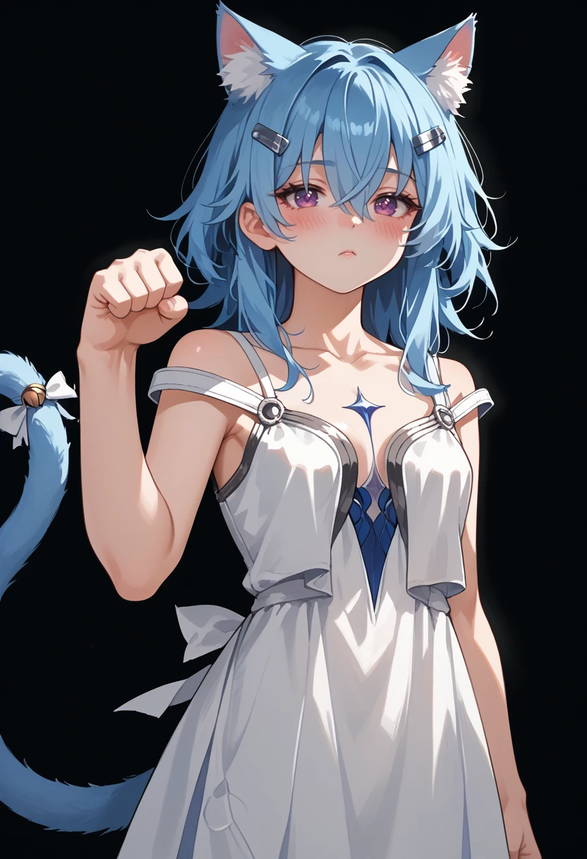 Trigger: wrnchwuwashorekeeper, blue hair, purple eyes, hair between eyes, long hair, breasts