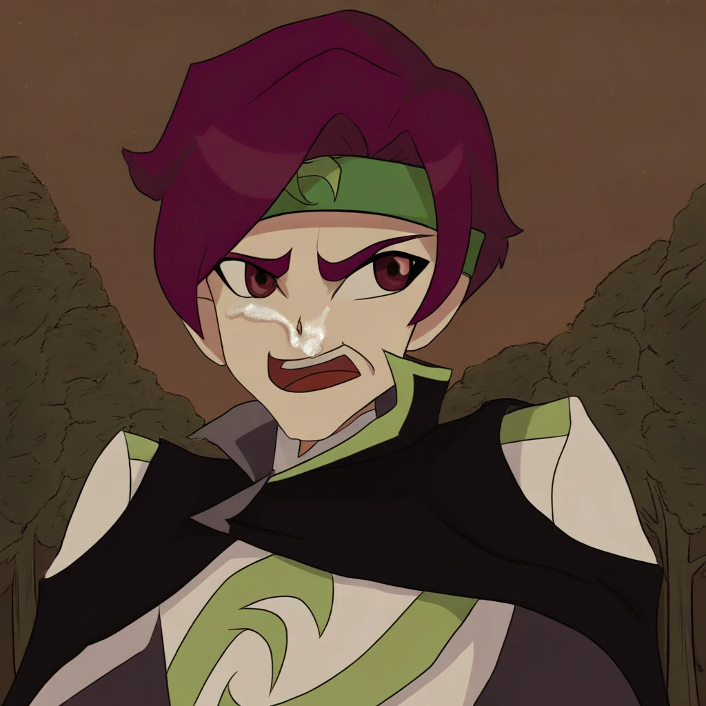 mephisto \(lolirock\), short hair, red purple hair, green eyes, thick eyebrows