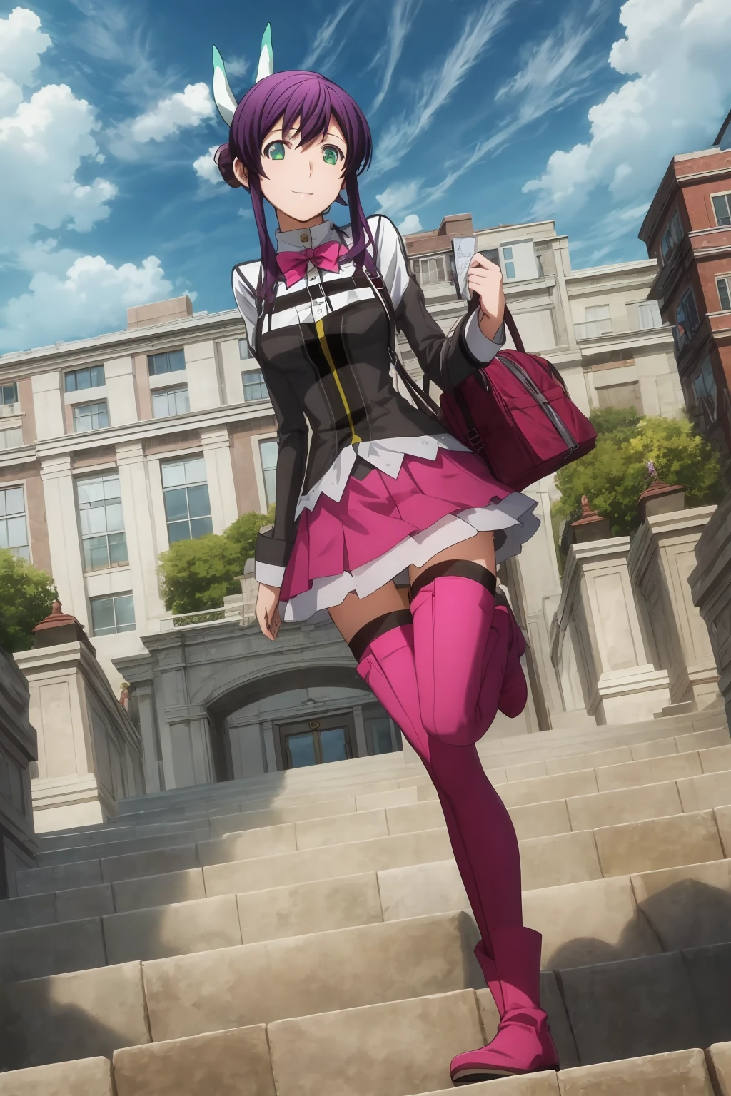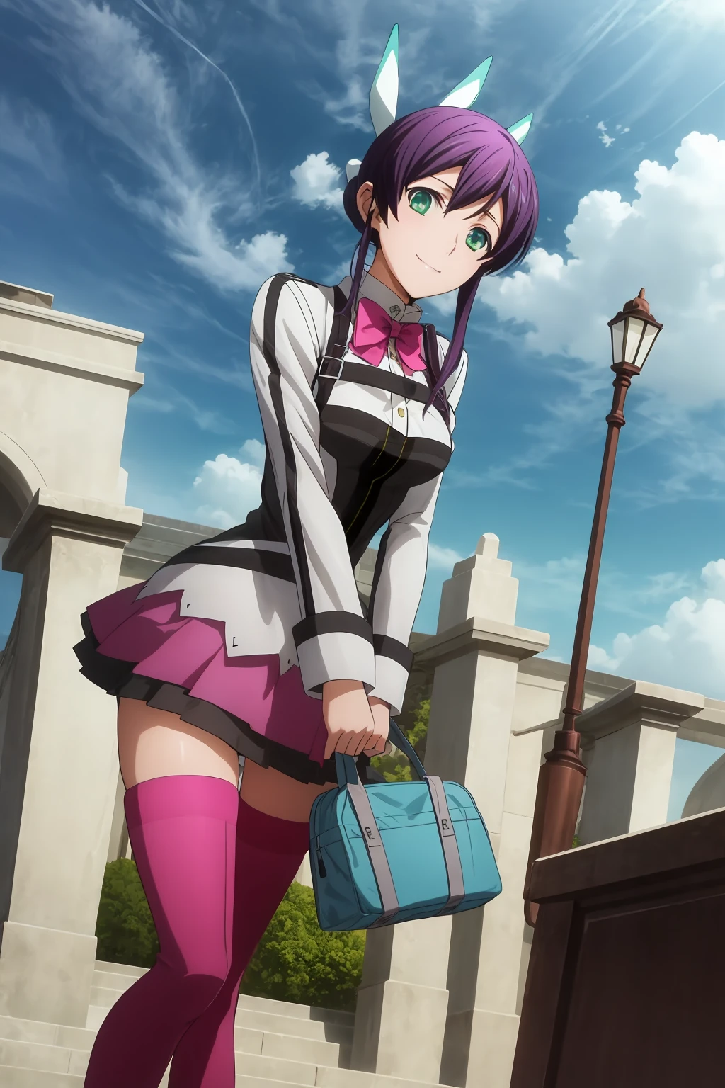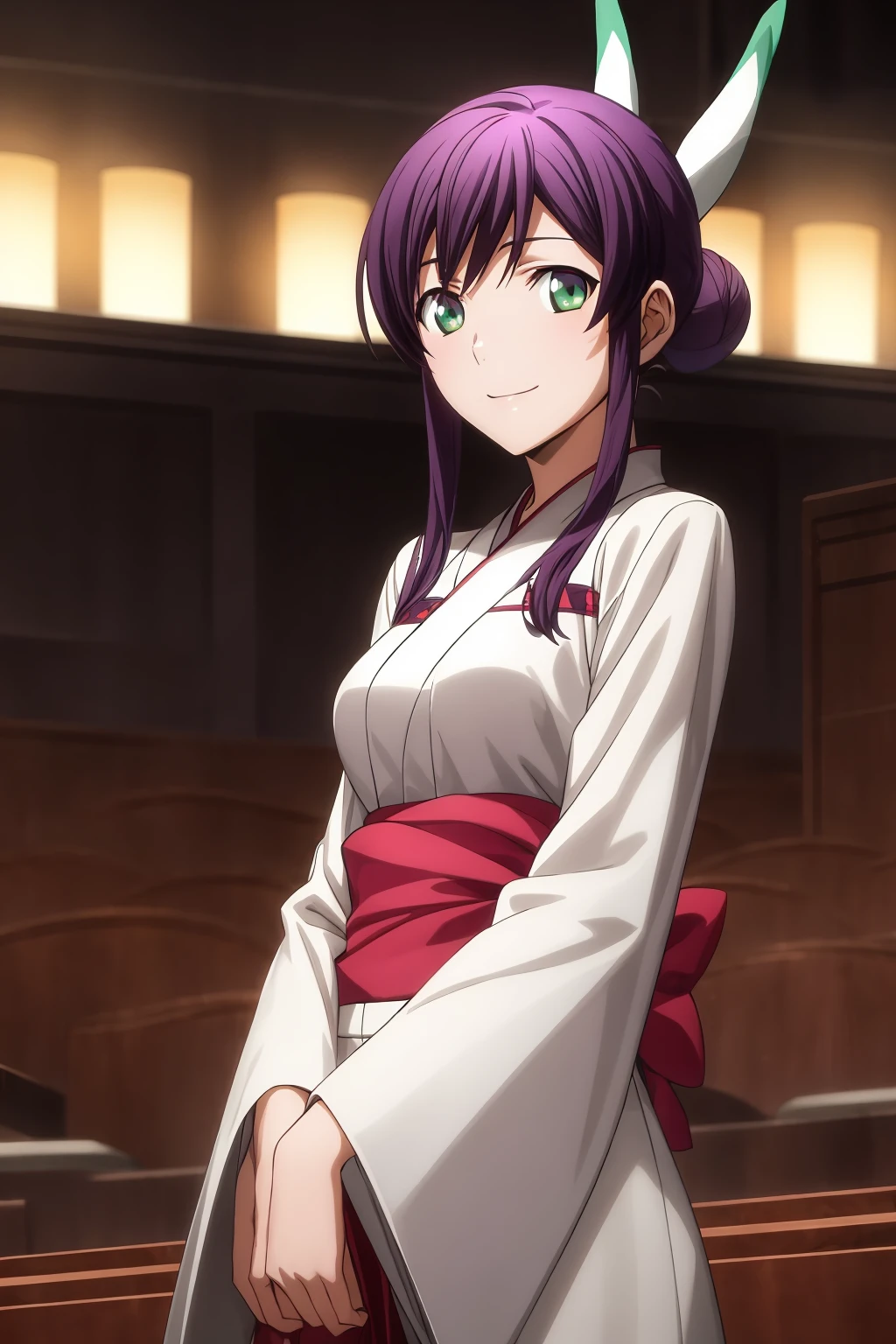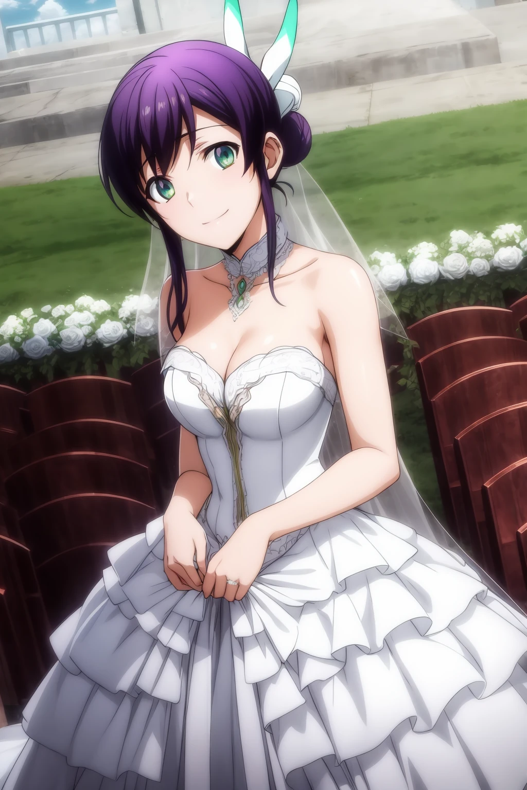 hair bun, sidelocks, single hair bun, purple hair, aqua eyes