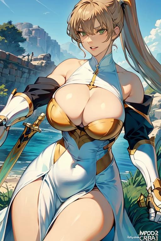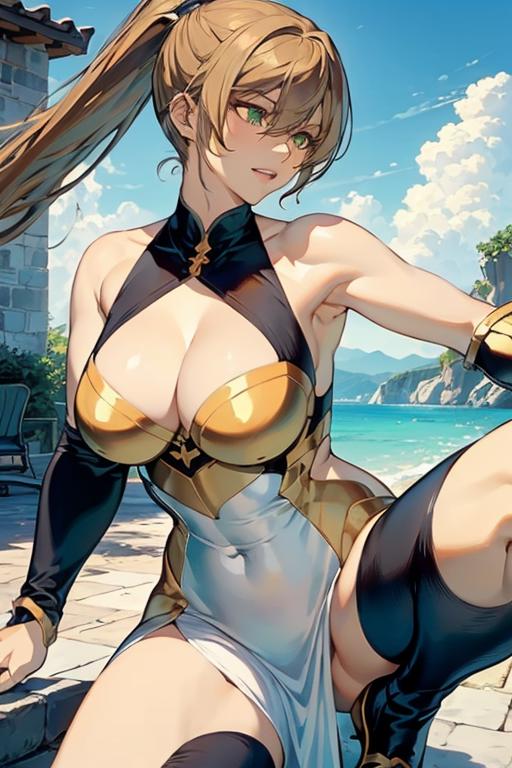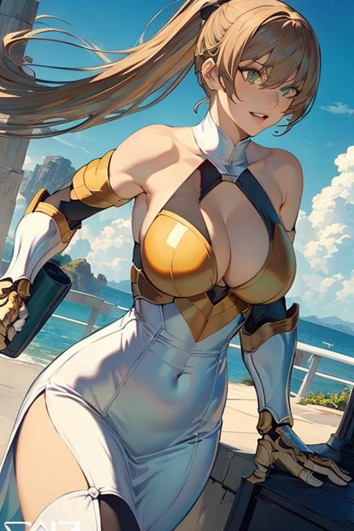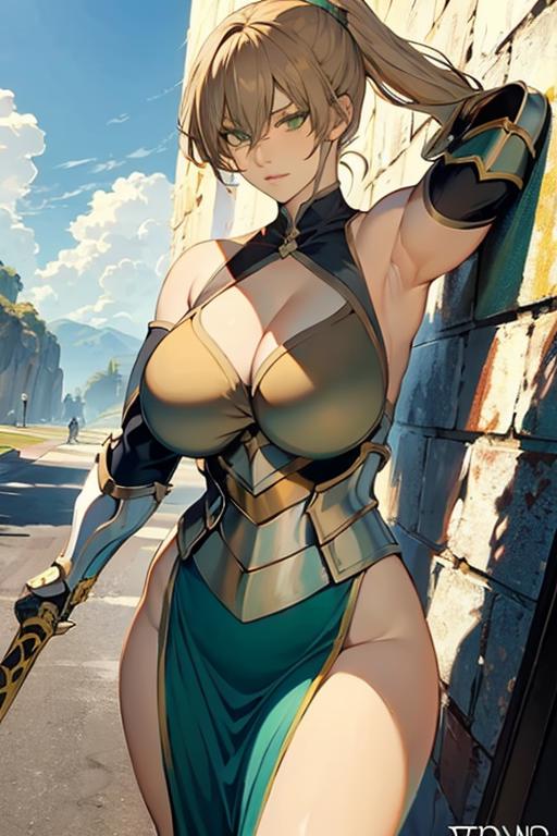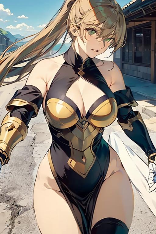 Brown yellow hair, green eyes,high ponytail, dress,Chest armor, arm protection, leg protection,