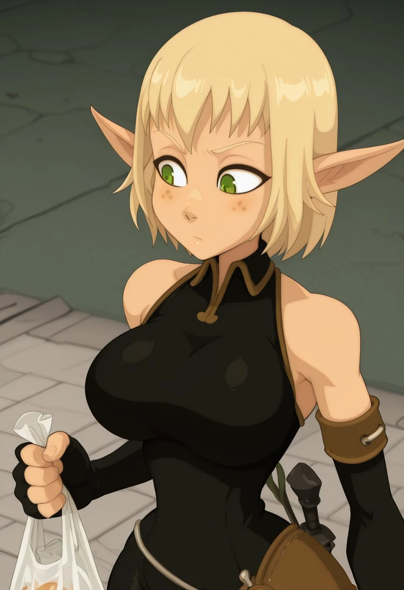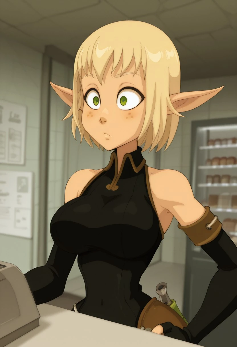 blonde hair, short hair, green eyes, pointy ears, elf, freckles,