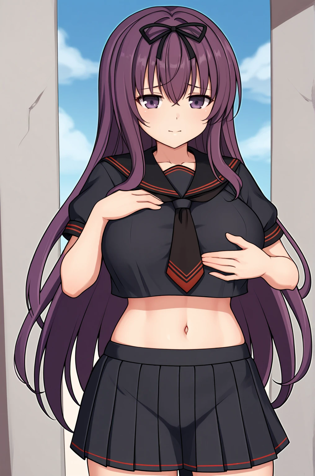 Trigger Words for school outfit are "hebijo_outfit, school uniform, black sailor collar, black serafuku, black shirt, black skirt, pleated skirt, crop top, short sleeves, black legwear, brown loafers".
