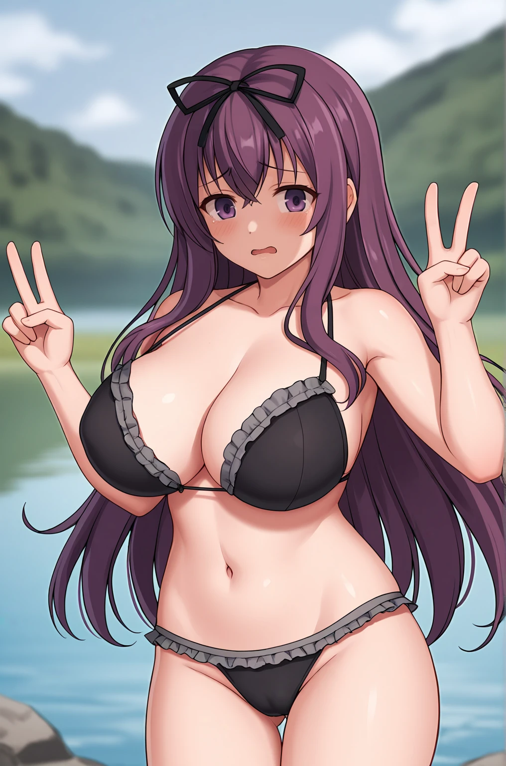 Trigger Words for her swimsuit are "Murasaki_swimsuit, black bra, black panties, frilled bikini, frilled bra, frilled panties".