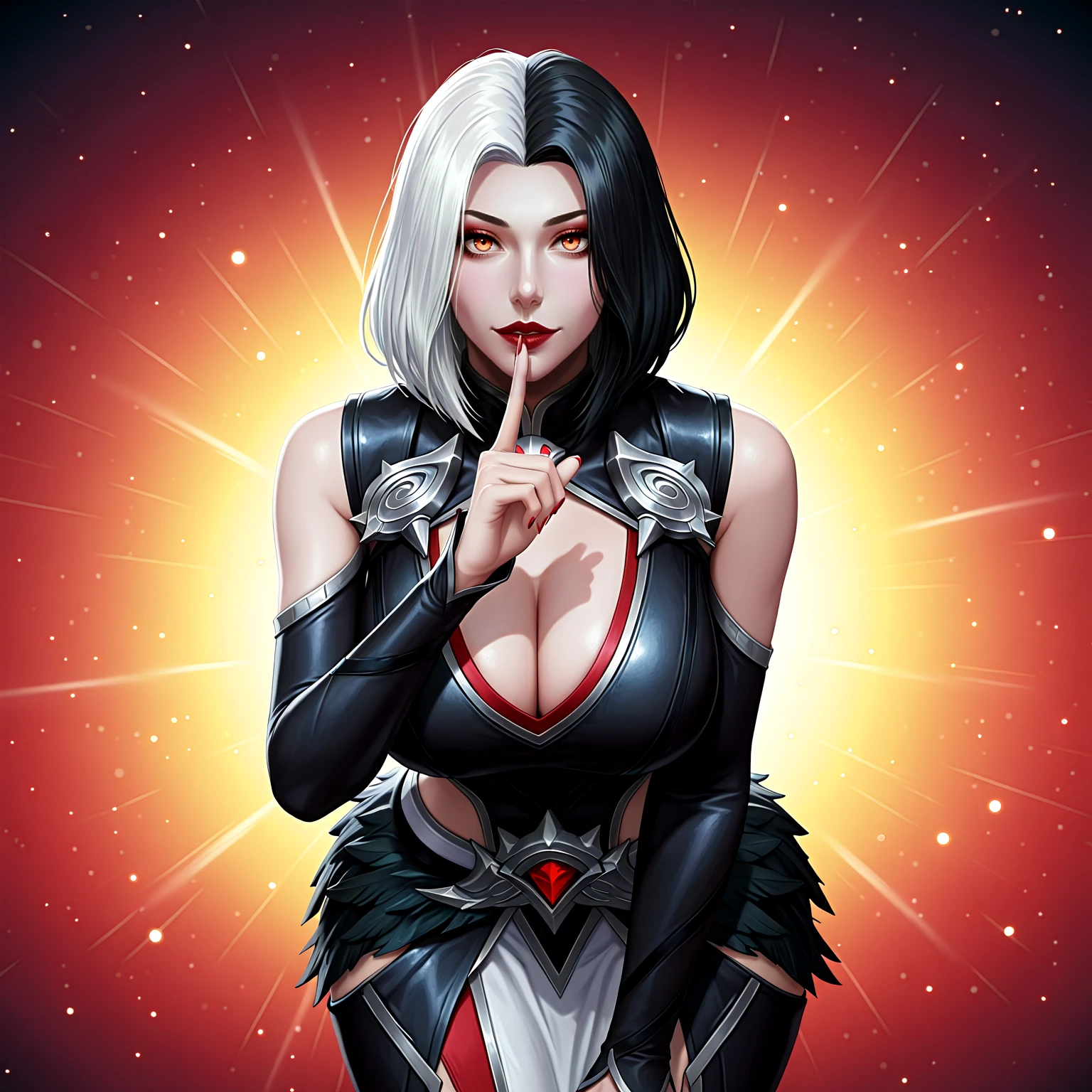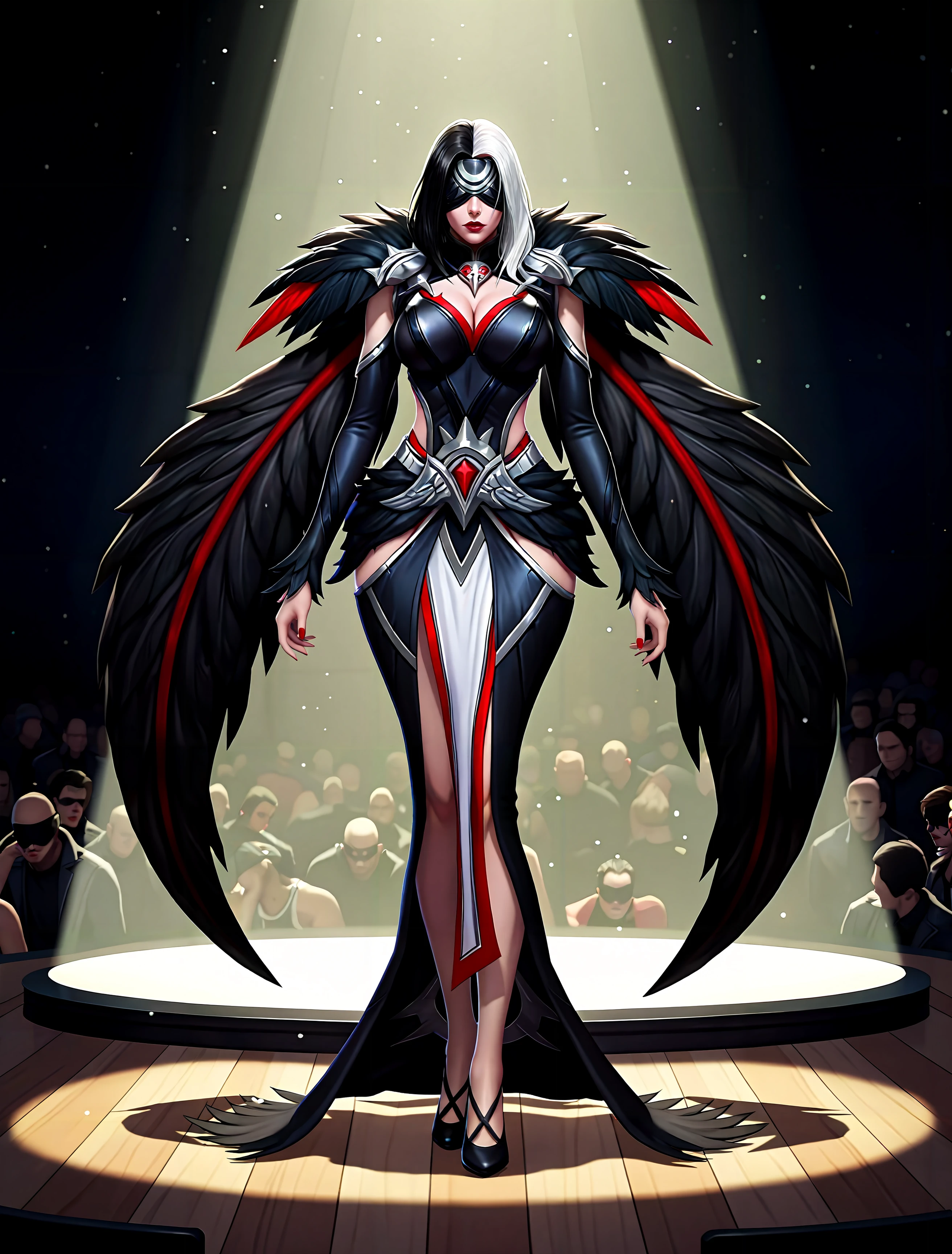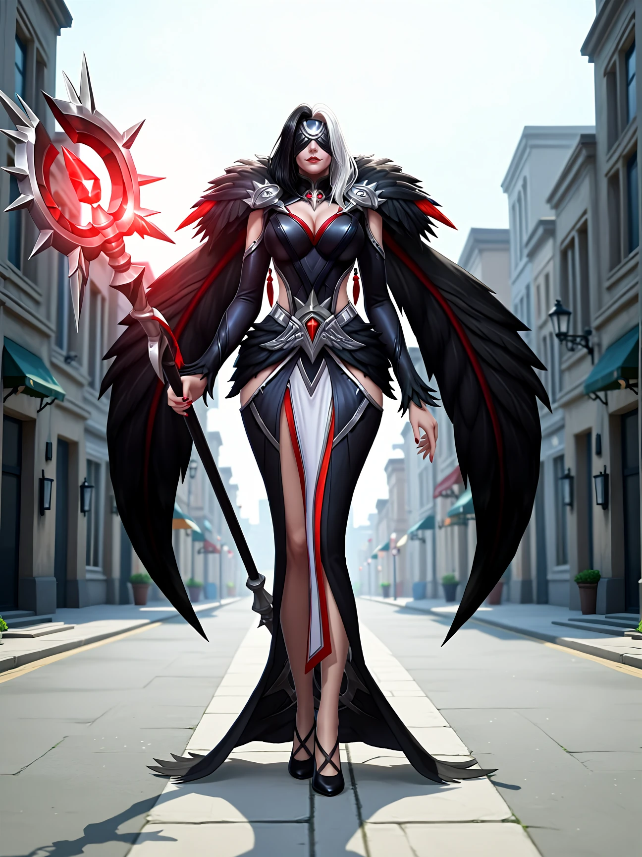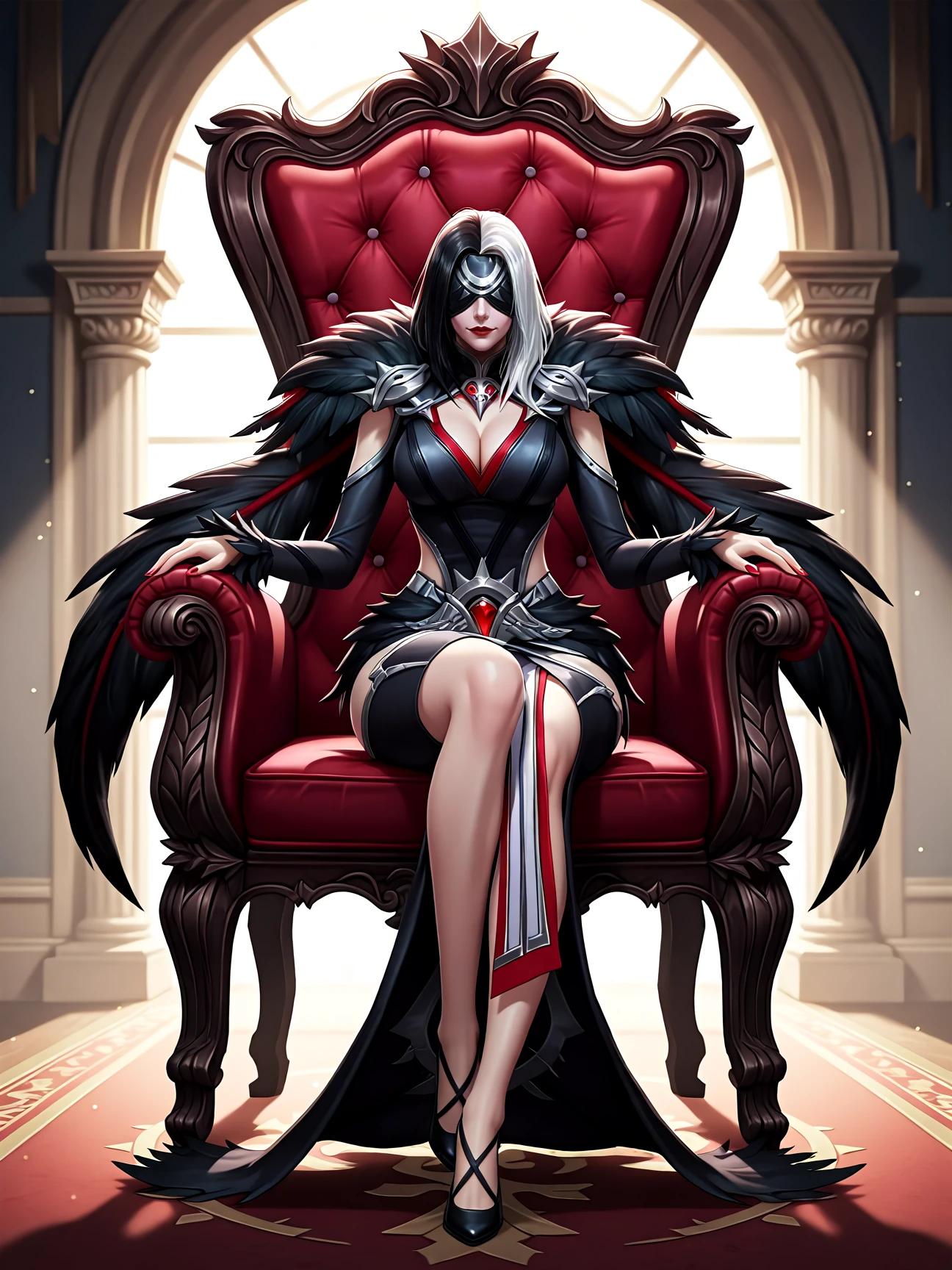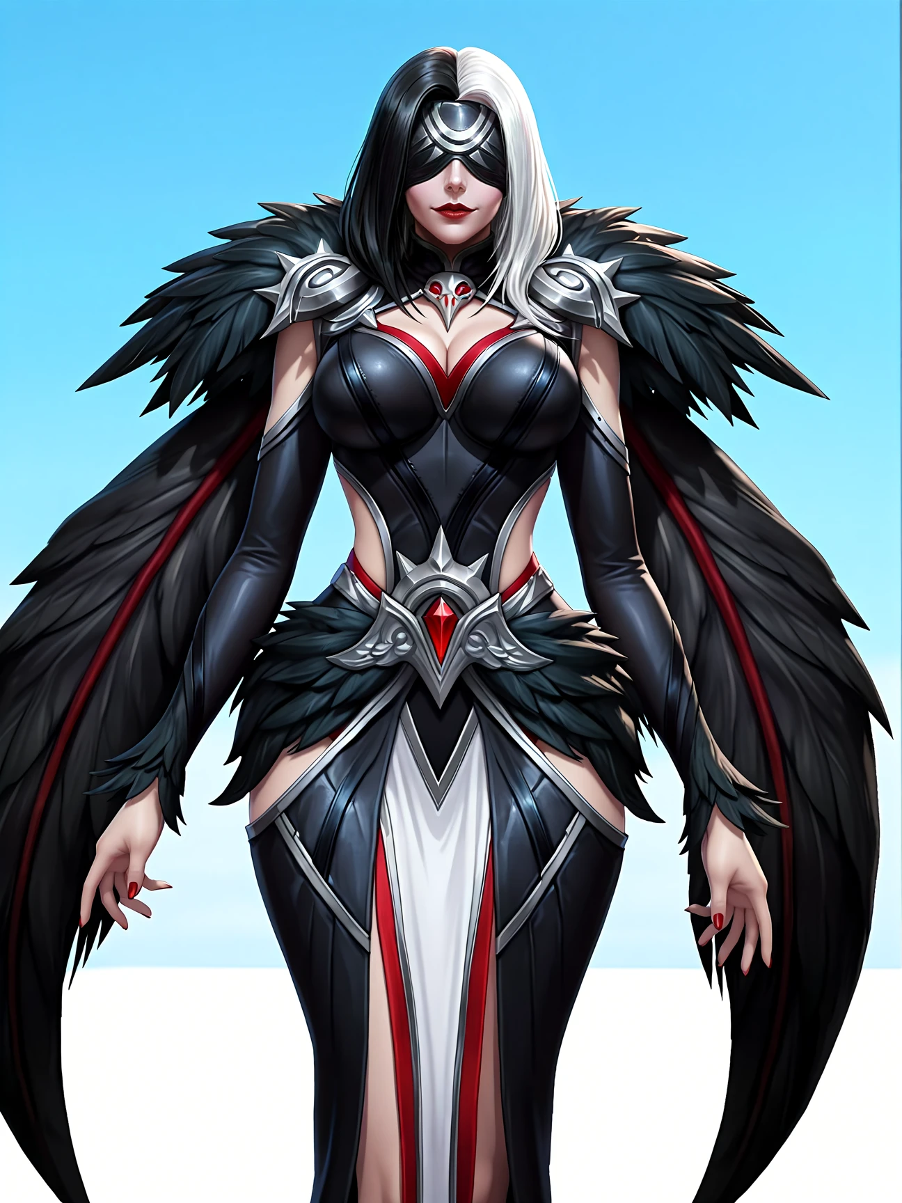 ph4rsa_def, 1girl, white hair, black hair, two-tone hair, blindfold, dress, fur trim, cape, red lips, necklace, detailed face